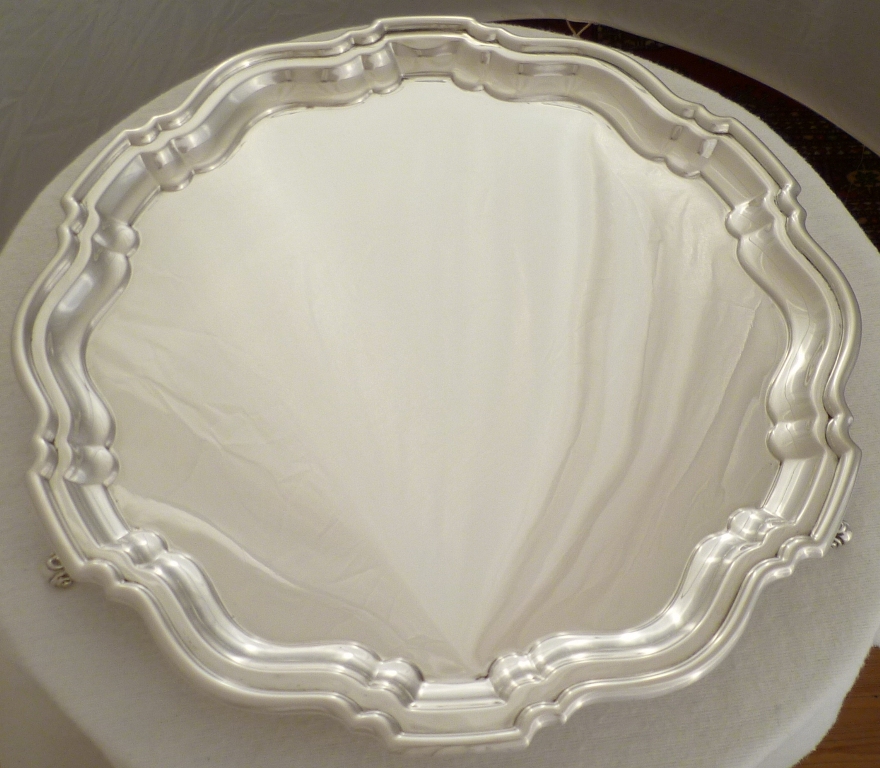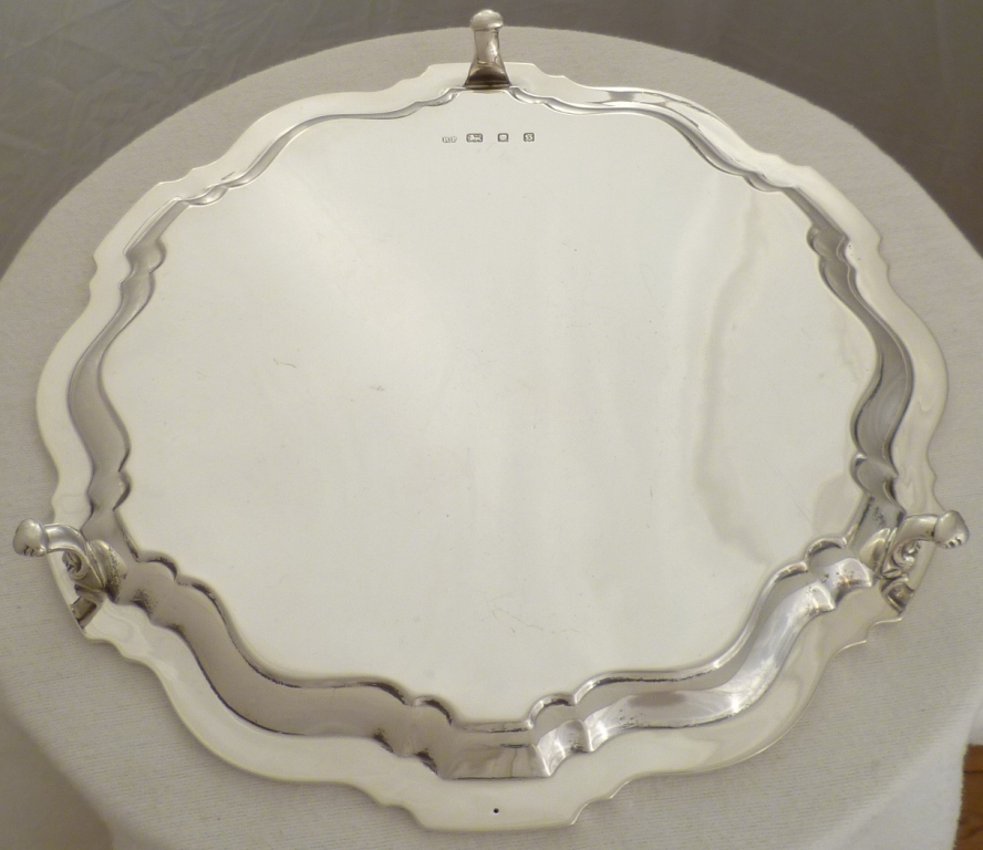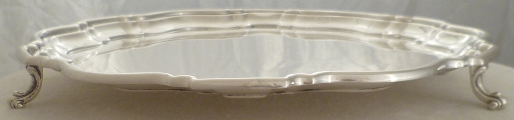 DESCRIPTION | Good silver salver with three scroll decorated feet. Matches m5431. |