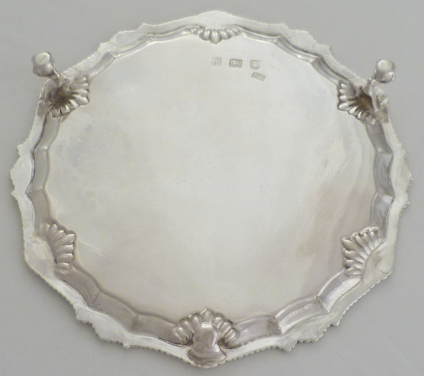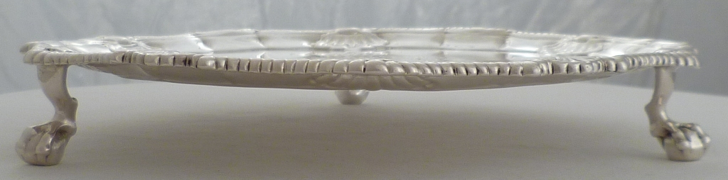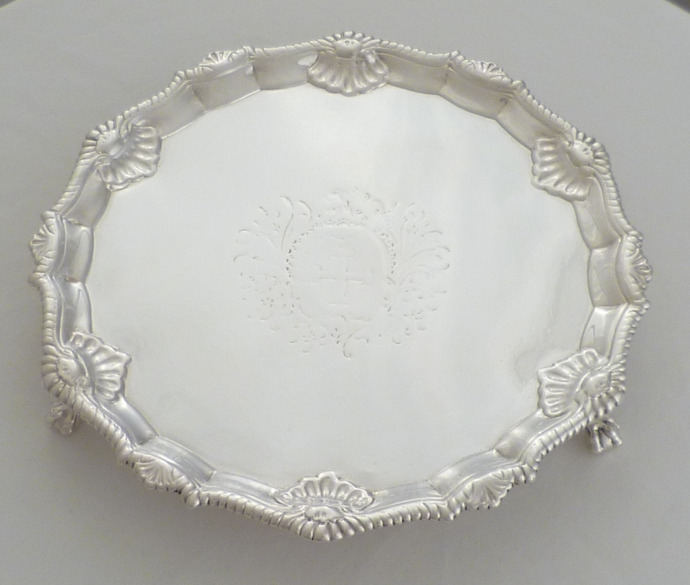 DESCRIPTION | Wonderful Georgian silver waiter with a gadroon and shell border, three ball and claw feet and clearly struck hallmarks. The engraved armorial and mantling are correct for the period and as there is no sign whatsoever of an erasure are very likely to be original. |
