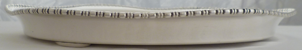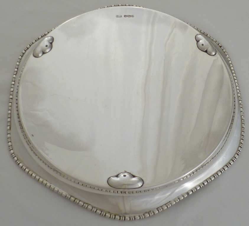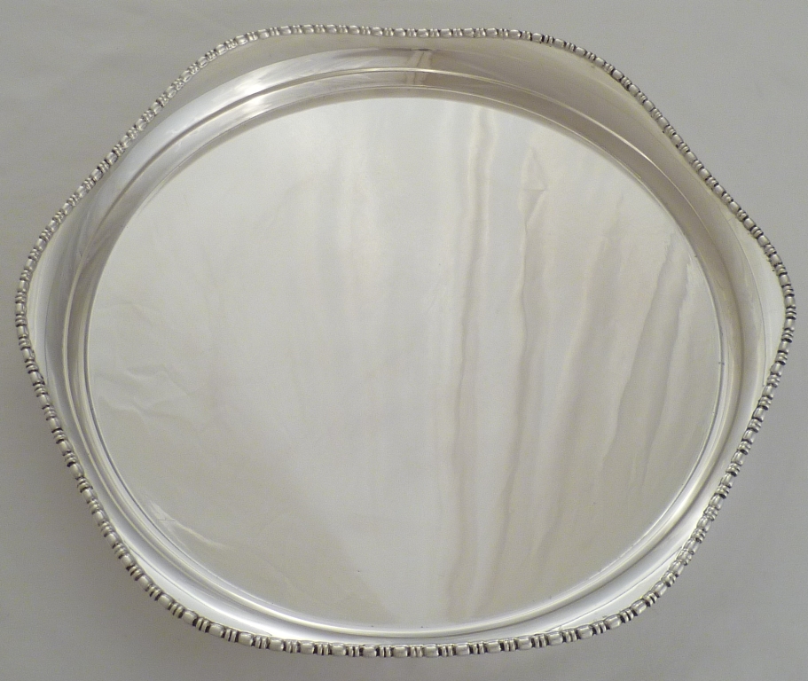 DESCRIPTION | Round silver tray on three squat feet each marked with the lion passant. I am calling this a tray rather than a salver because it sits quite low yet has tall sides. Would work well for serving drinks and nibbles as the taller sides are easy and comfortable to grasp. |