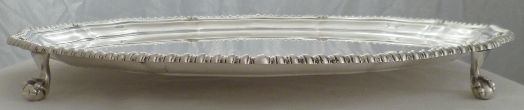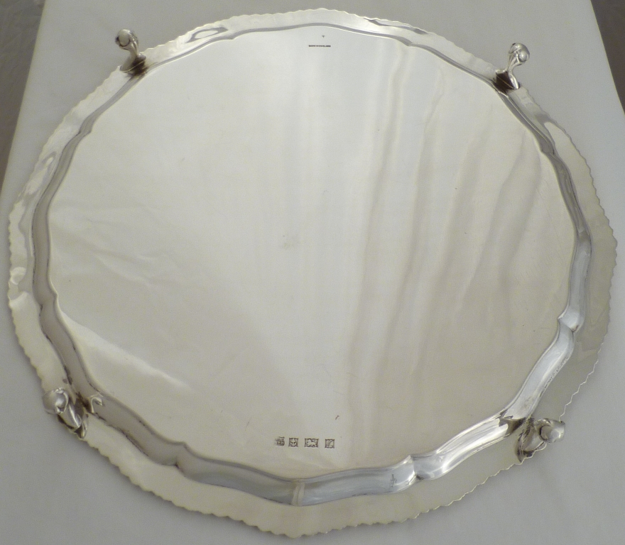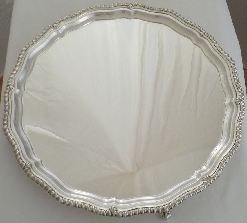 DESCRIPTION | Good silver salver with a gadroon decorated rim and four ball and claw feet. |
