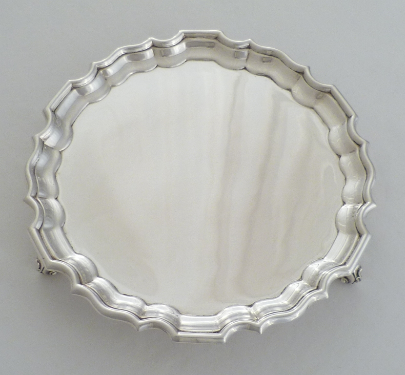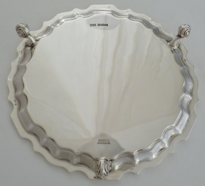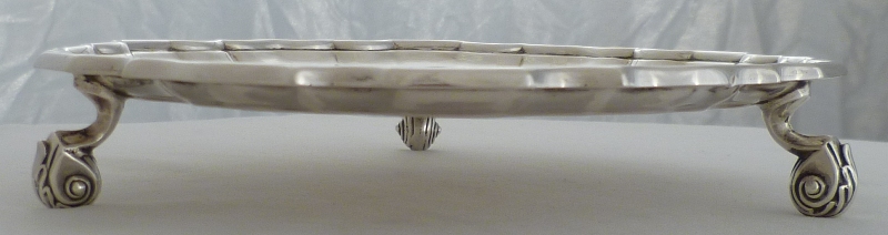 DESCRIPTION | Very good silver waiter with a shaped border and three leaf capped scroll feet. |