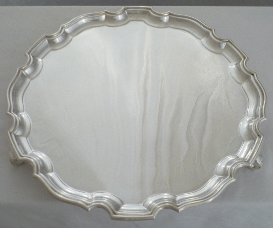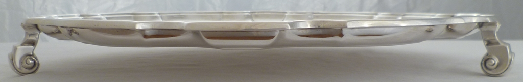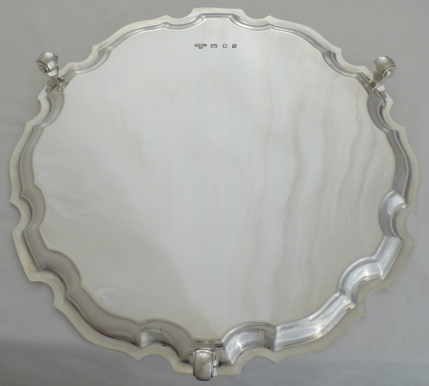 DESCRIPTION | Good silver salver with a shaped border and three stylised leaf capped feet. |