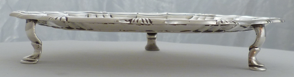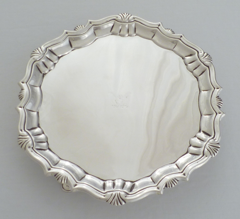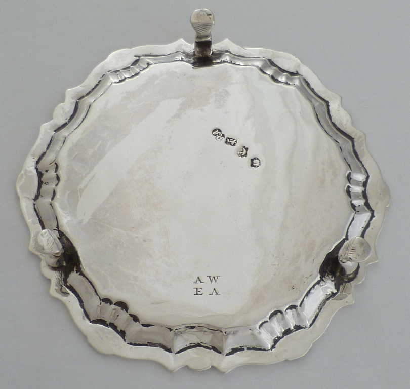 DESCRIPTION | Very good Georgian silver waiter (small salver) with a shaped and shell decorated border and three hoof feet. Small, central crest engraving now quite rubbed and crisp, earlier, initial engraving verso. Exceptionally well struck and clear hallmarks and even the original assayer's scrape is still visible verso. |