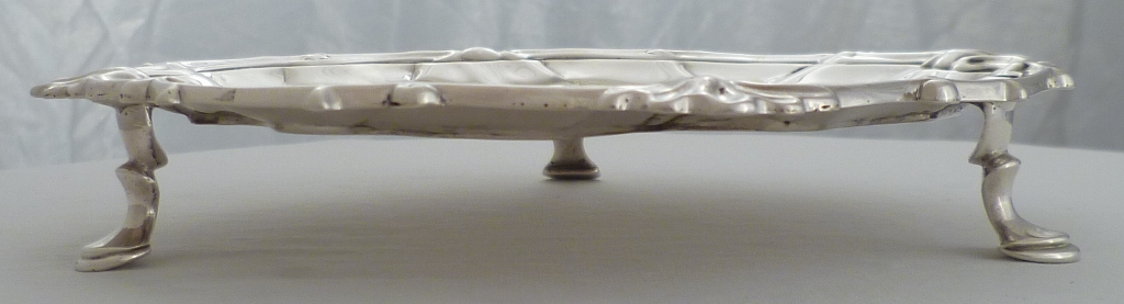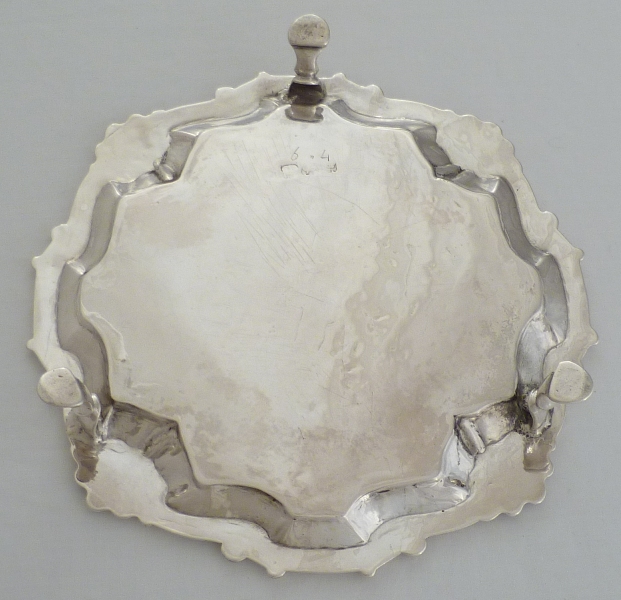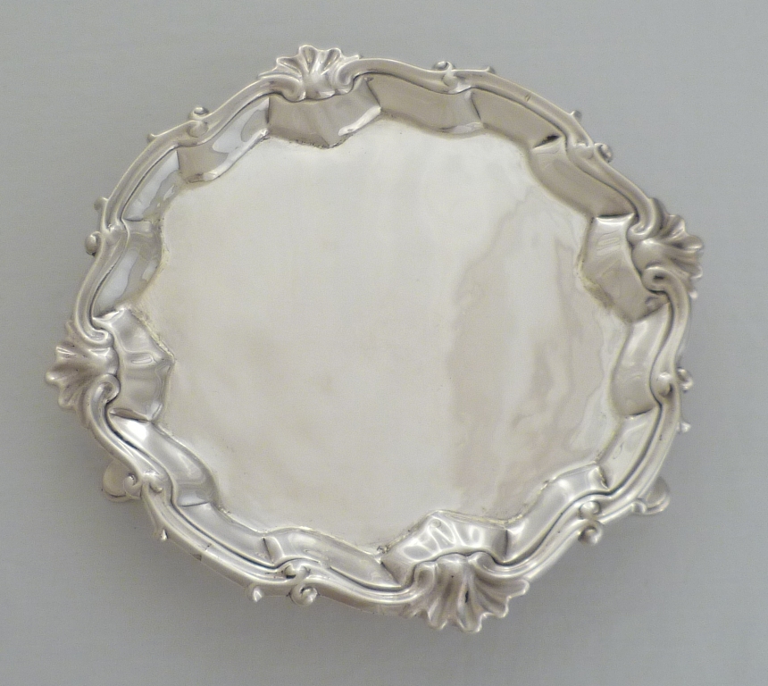 DESCRIPTION | Rococo Georgian silver waiter (small salver) with a shaped scroll and shell decorated border and three hoof feet. |