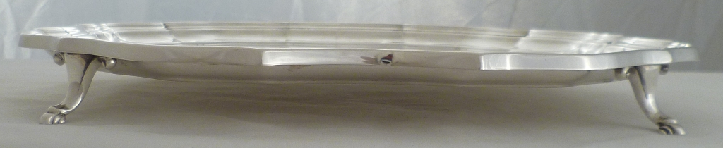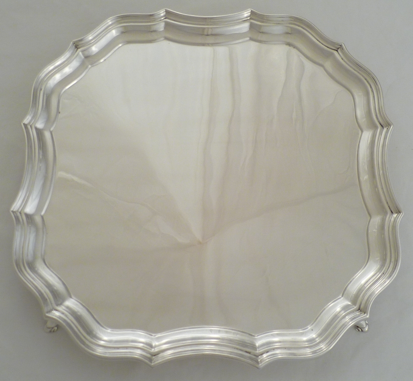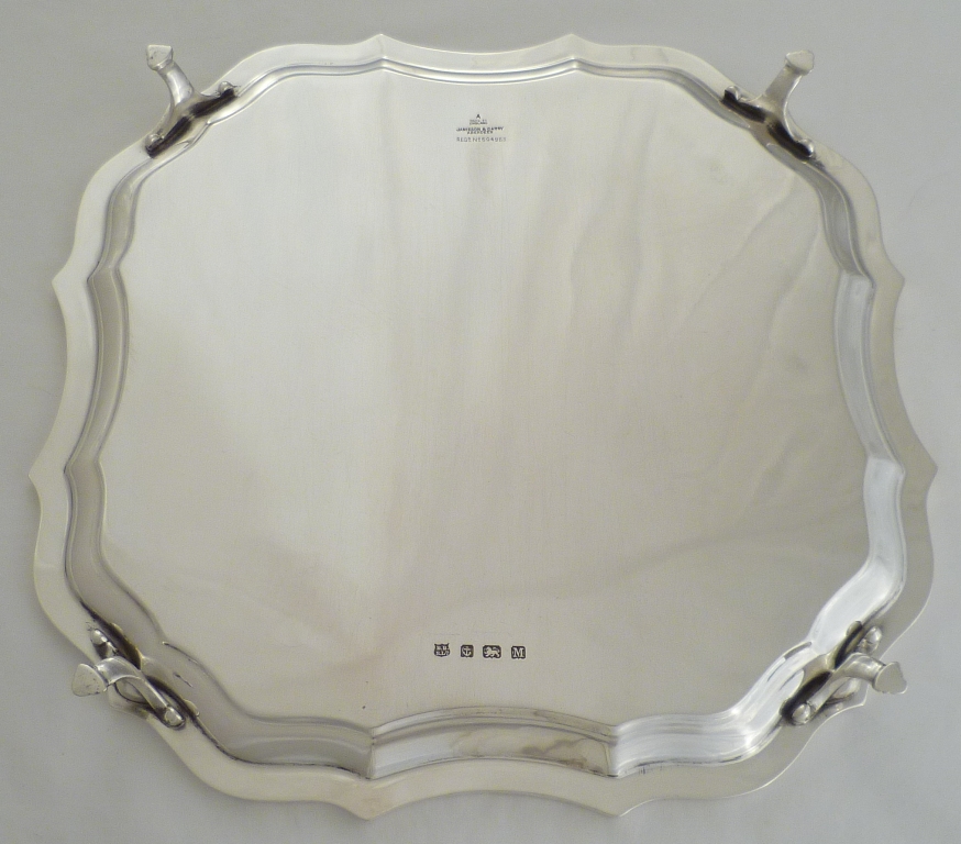 DESCRIPTION | Heavy, square salver on four scroll decorated bracket feet. |