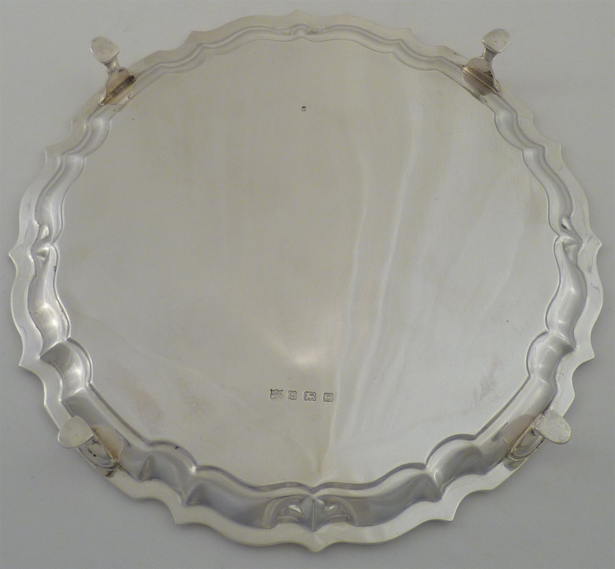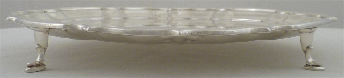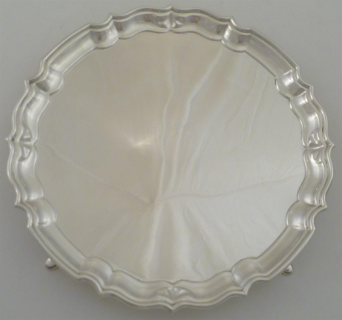DESCRIPTION | Solid silver salver with four hoof feet and no engraving or erasure. |