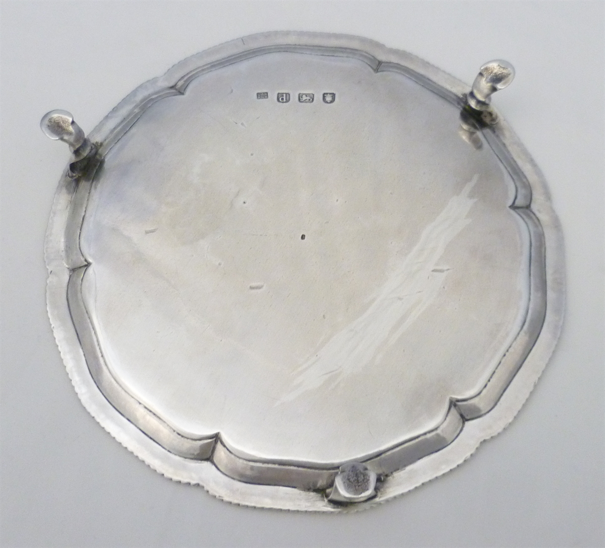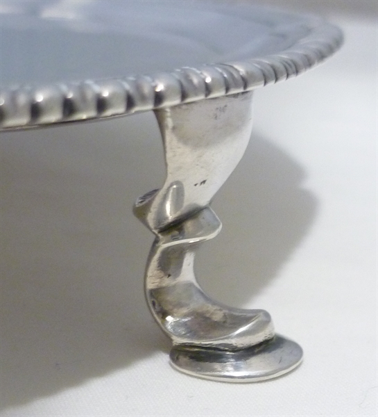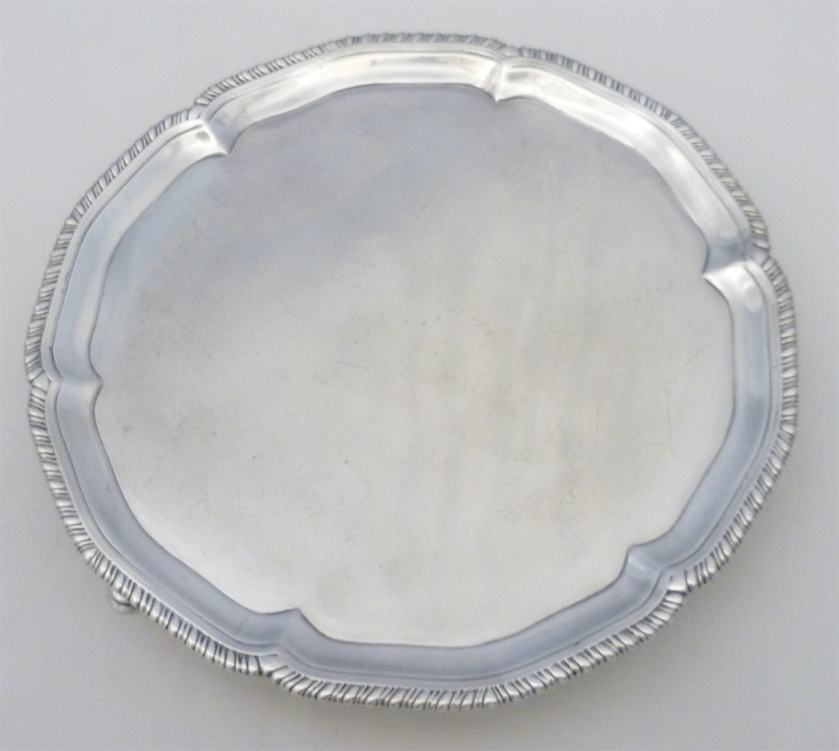 DESCRIPTION | Scarce Georgian English solid sterling silver salver on three hoof feet and with a shaped and gadroon decorated rim. Pleasingly thick silver and very unusual in having no engraving or erasure. |