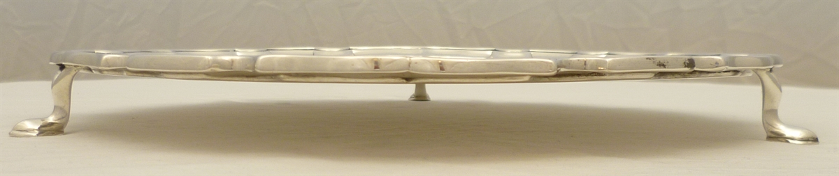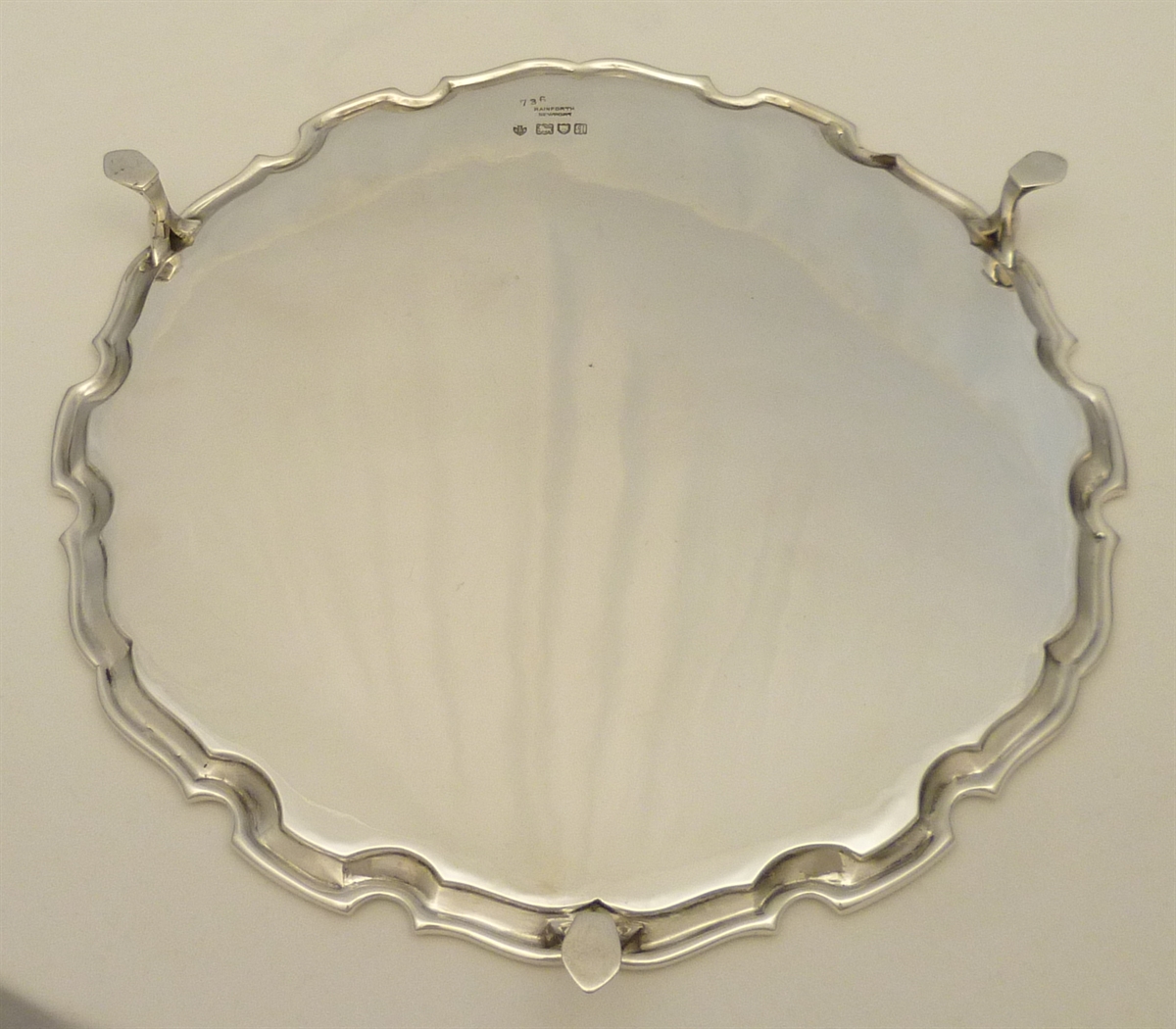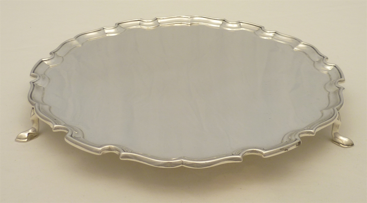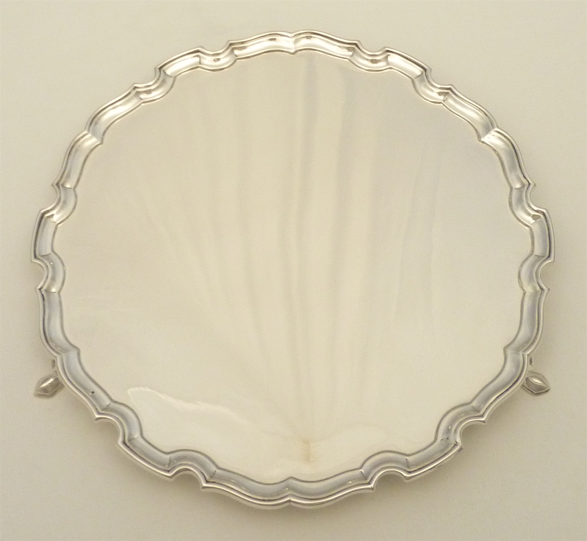 DESCRIPTION | Superb quality English solid sterling silver three footed salver with no engraving or erasure. |
