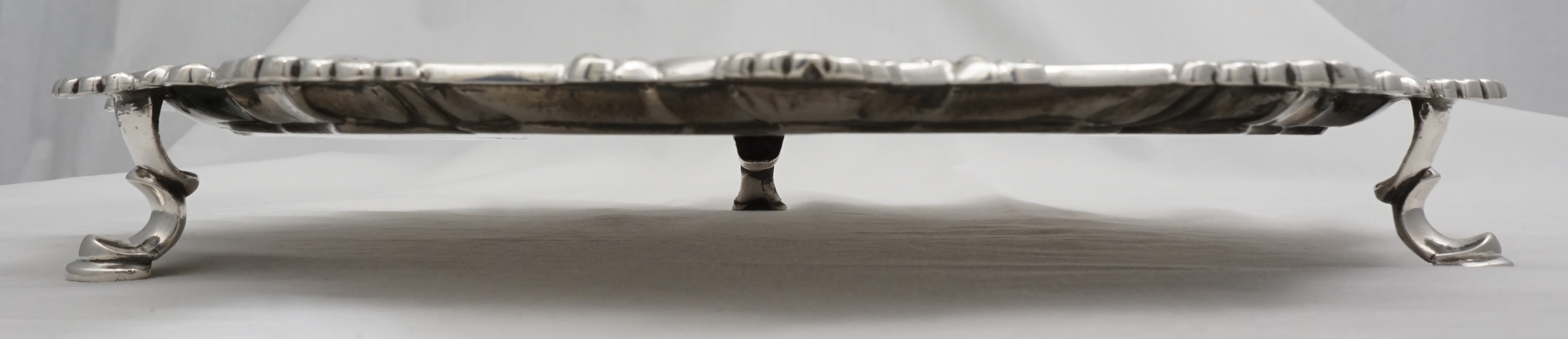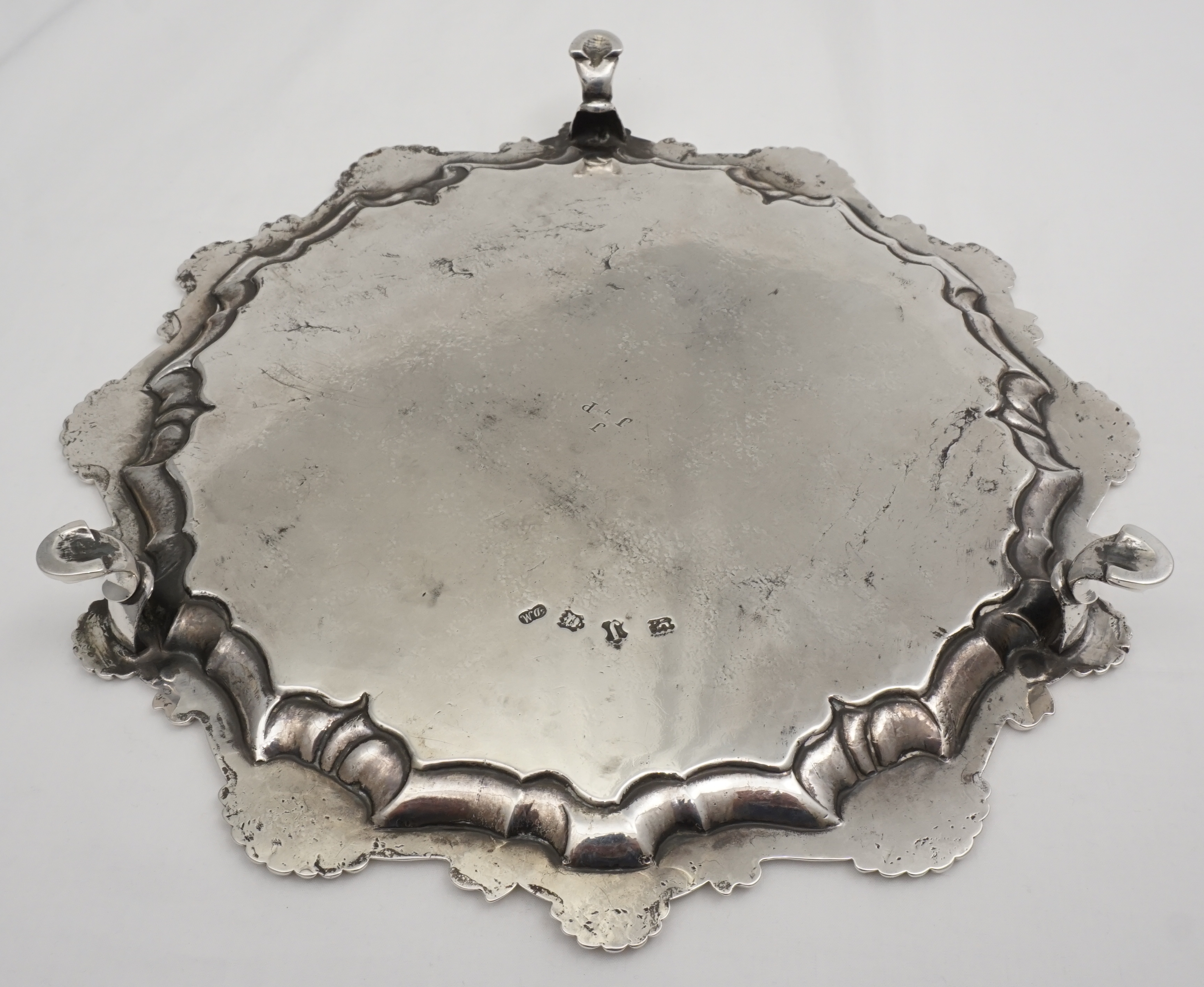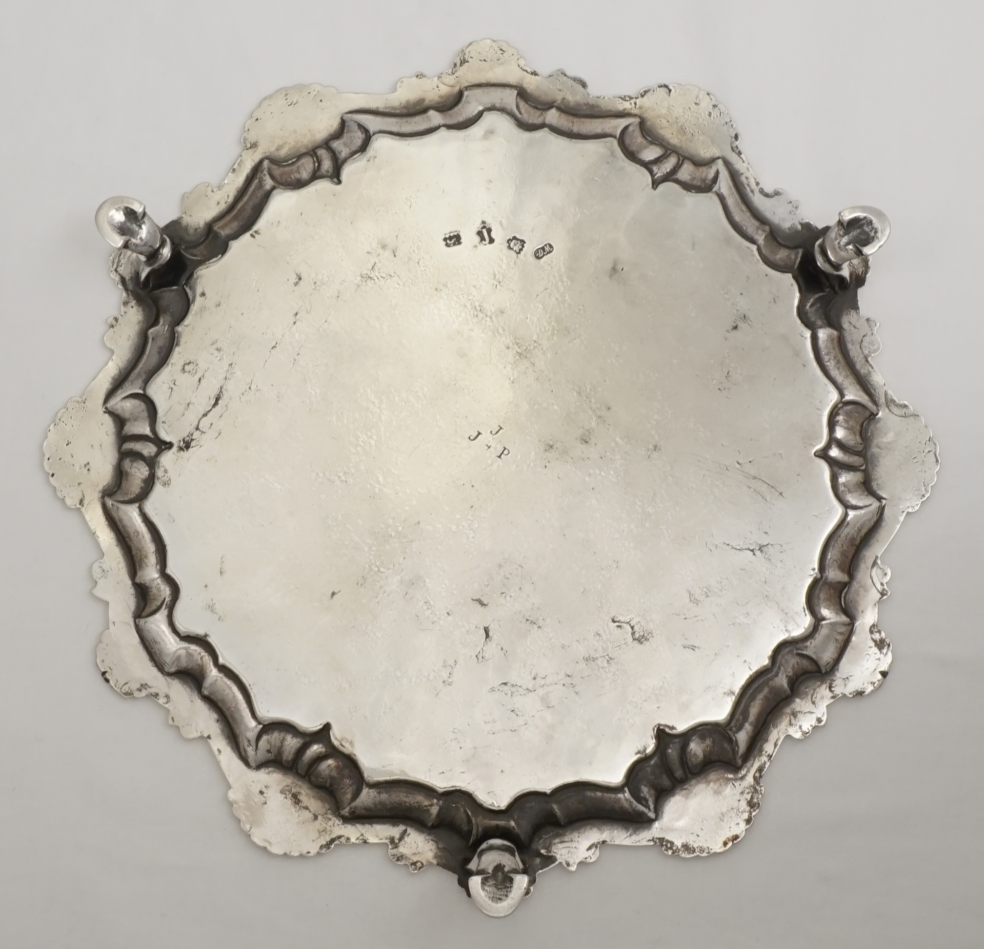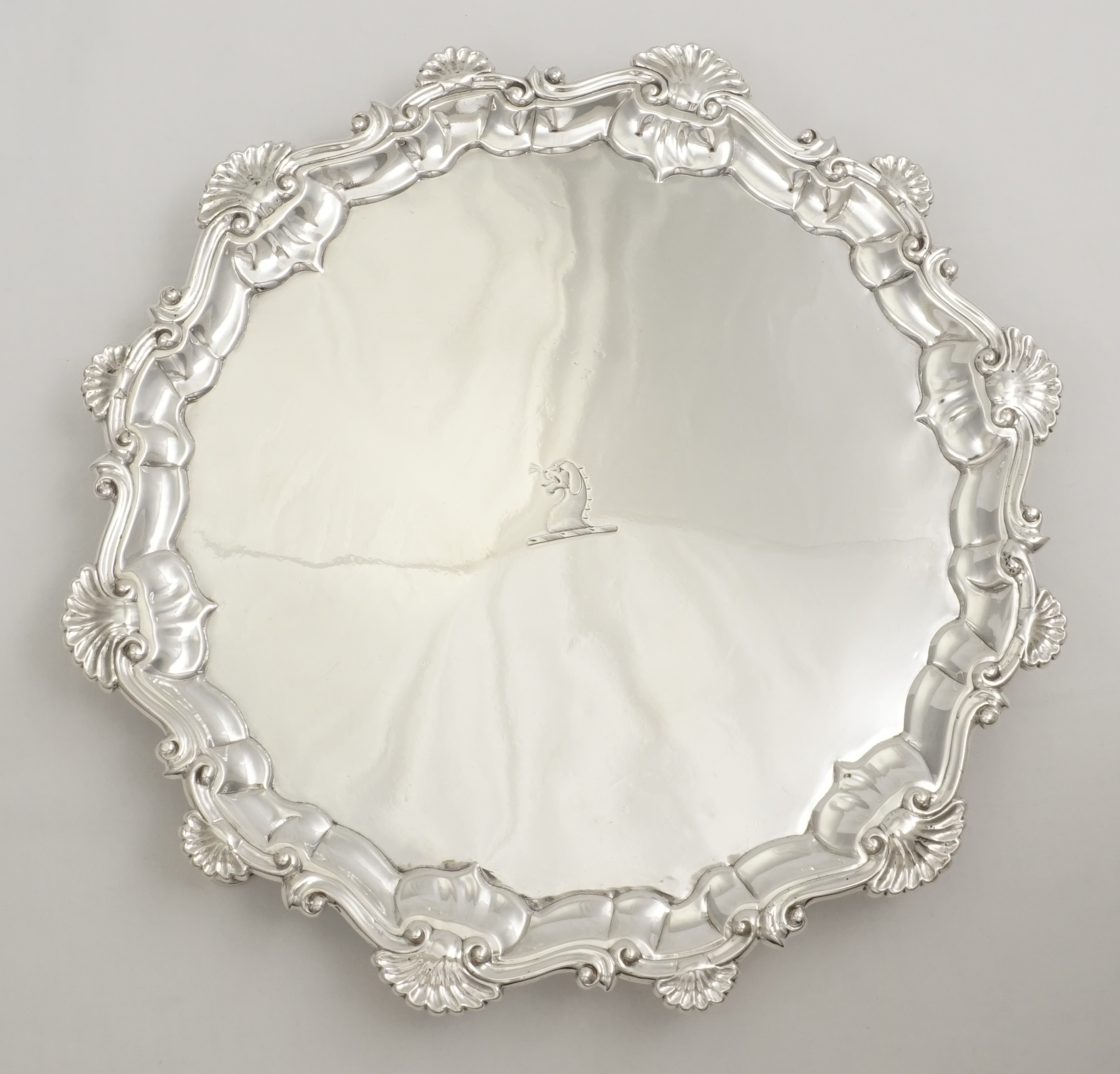 DESCRIPTION | Superb George II antique English solid sterling silver salver with a good central crest engraving and three scroll and pad feet. Three feet enable it to sit flat on any surface. Verso, wonderful, well struck and still clear hallmarks and a discreet betrothal engraving. Stylistically the betrothal initials engraving appears to be the first and original, the frontal crest (dog fish?) a generation or two later, probably as the family's status increased. |