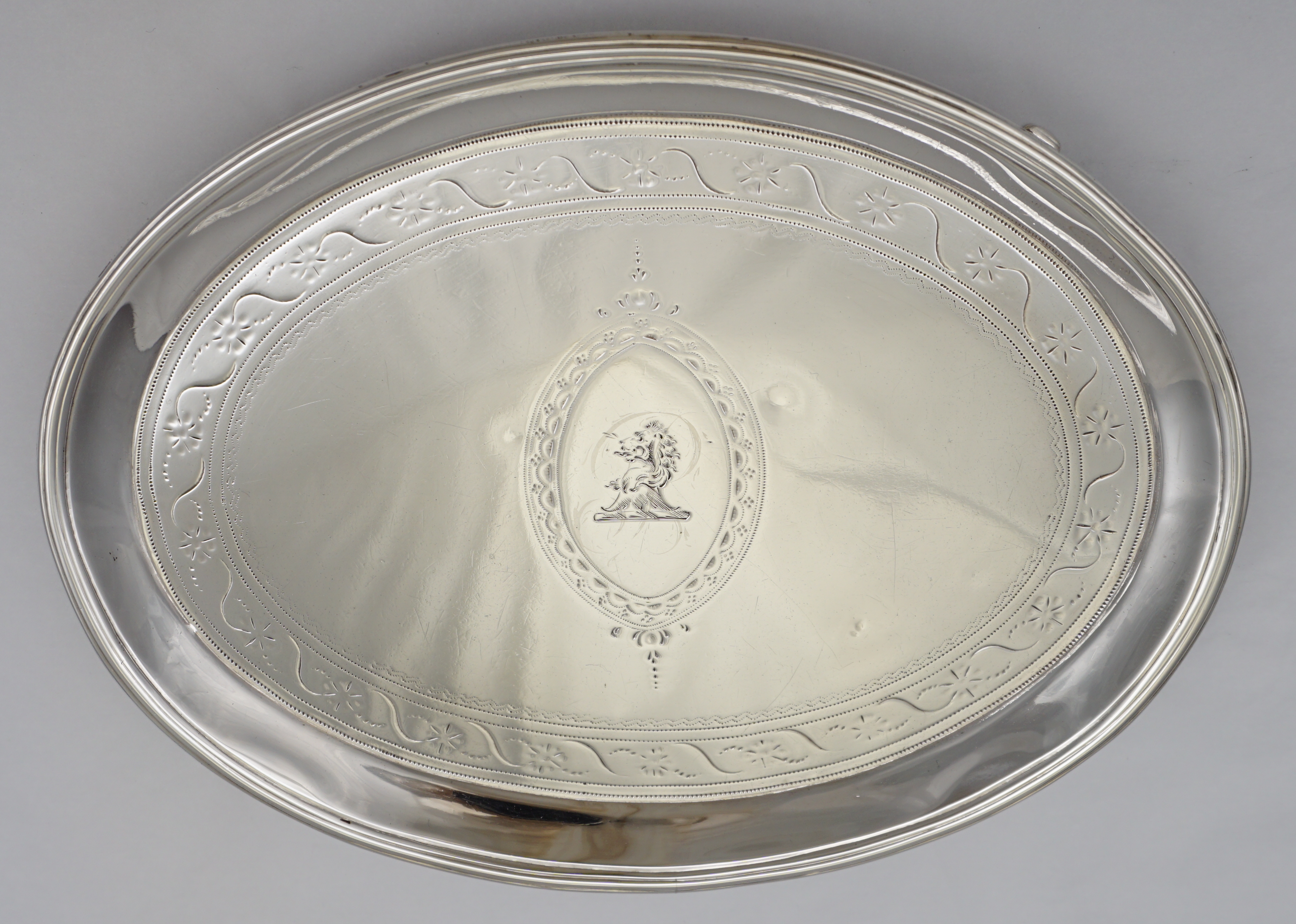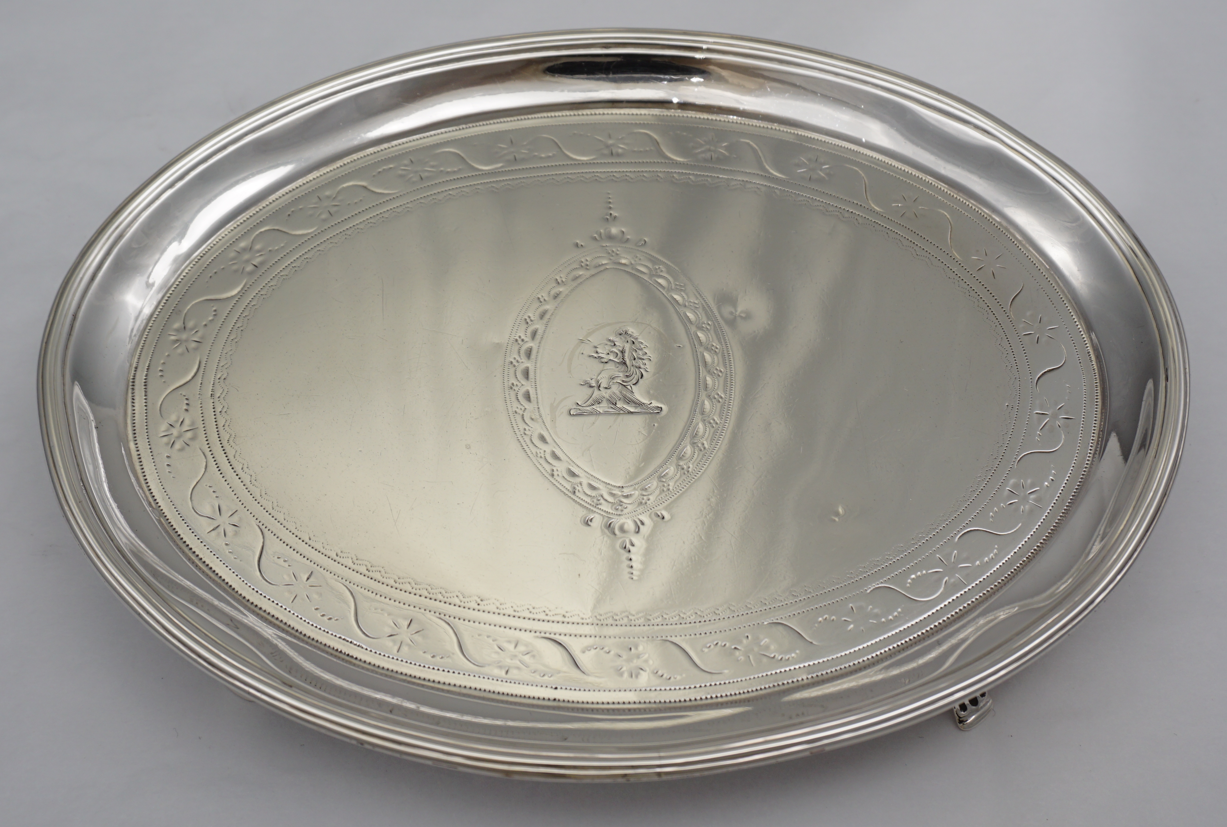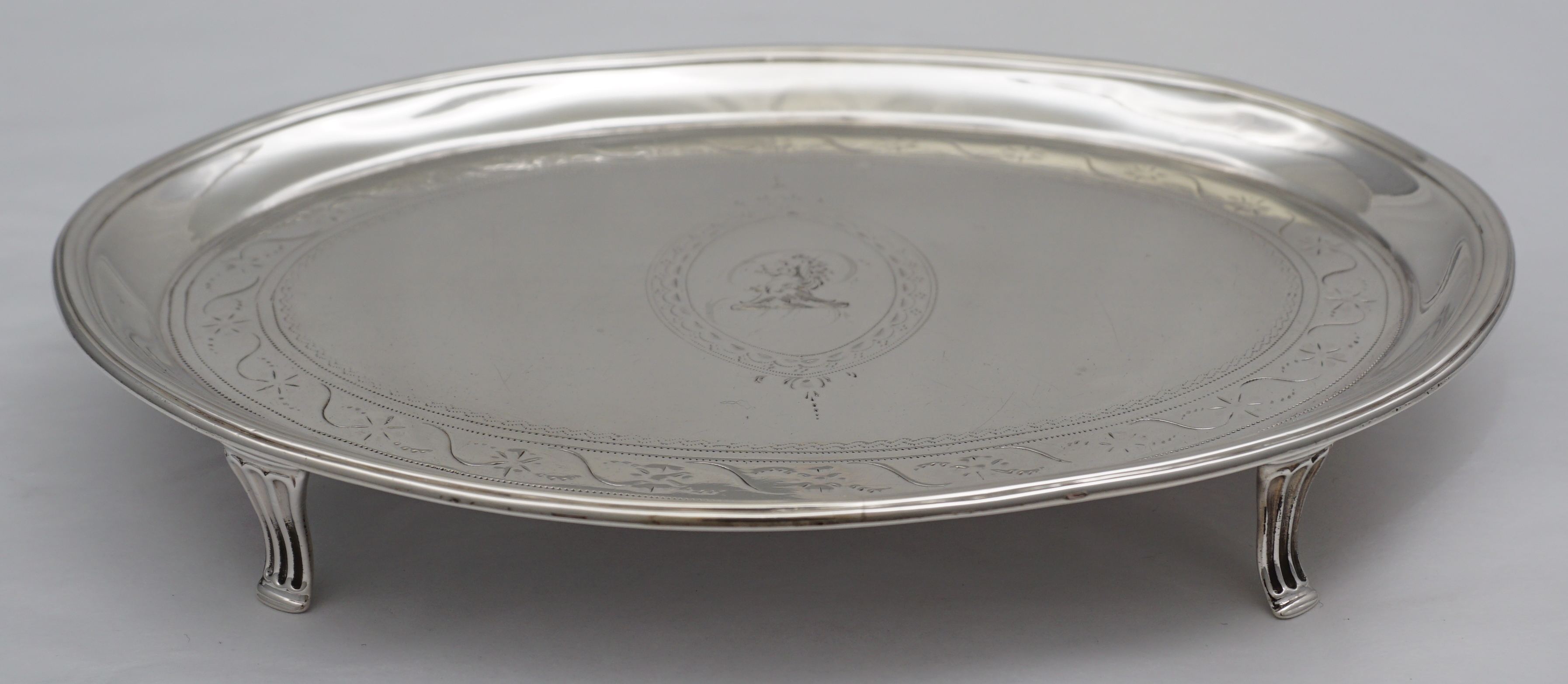 DESCRIPTION | Elegant and rare antique English Georgian solid sterling silver oval teapot stand with bright-cut engraved decoration and a good central crest over the filled original monogram. |