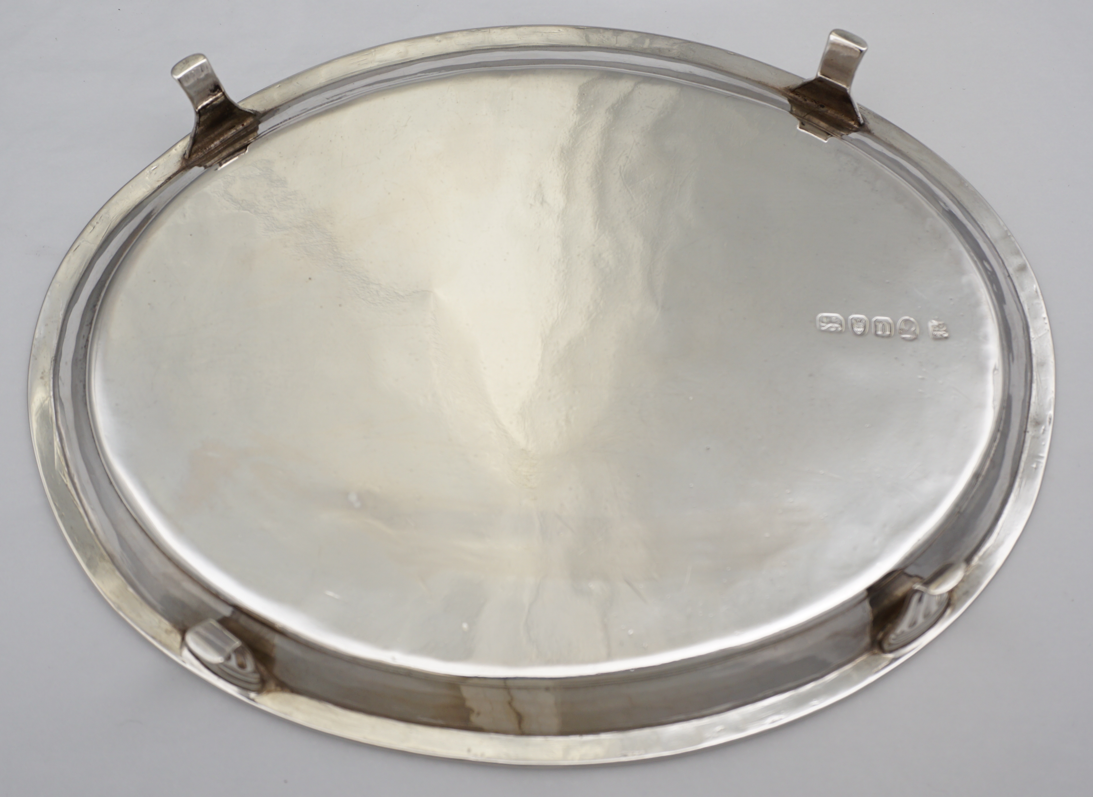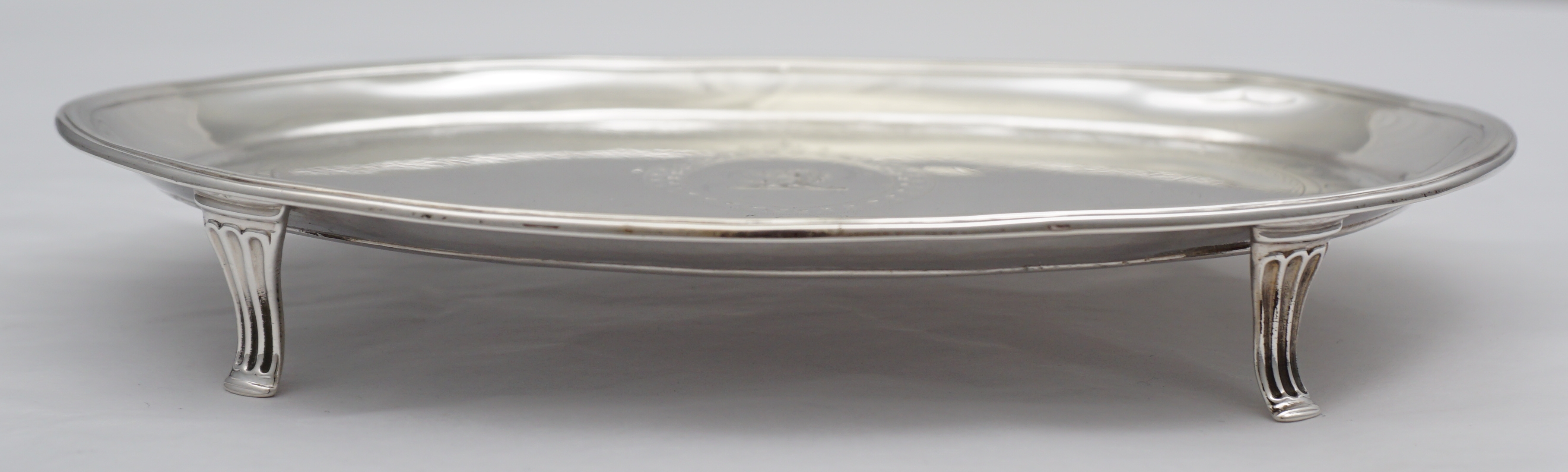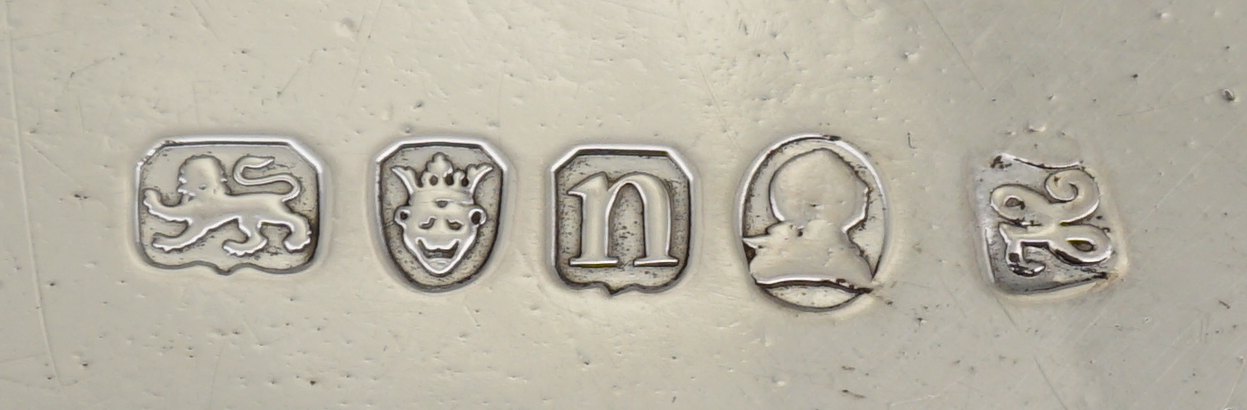 CONDITION | very good, the engraved decoration to the perimeter of the field has softened, gentle leg top impressions to rim, three little bumps/digs to the plain field. The cartouche has had the original cursive 'B' monogram filled. This is much better than erasure and a technically more difficult and expensive process indicating that this piece has always been highly prized. Immediately after a fresh professional polish and under high powered photographic lights the 'B' can just be seen but under normal circumstances you will struggle. |
