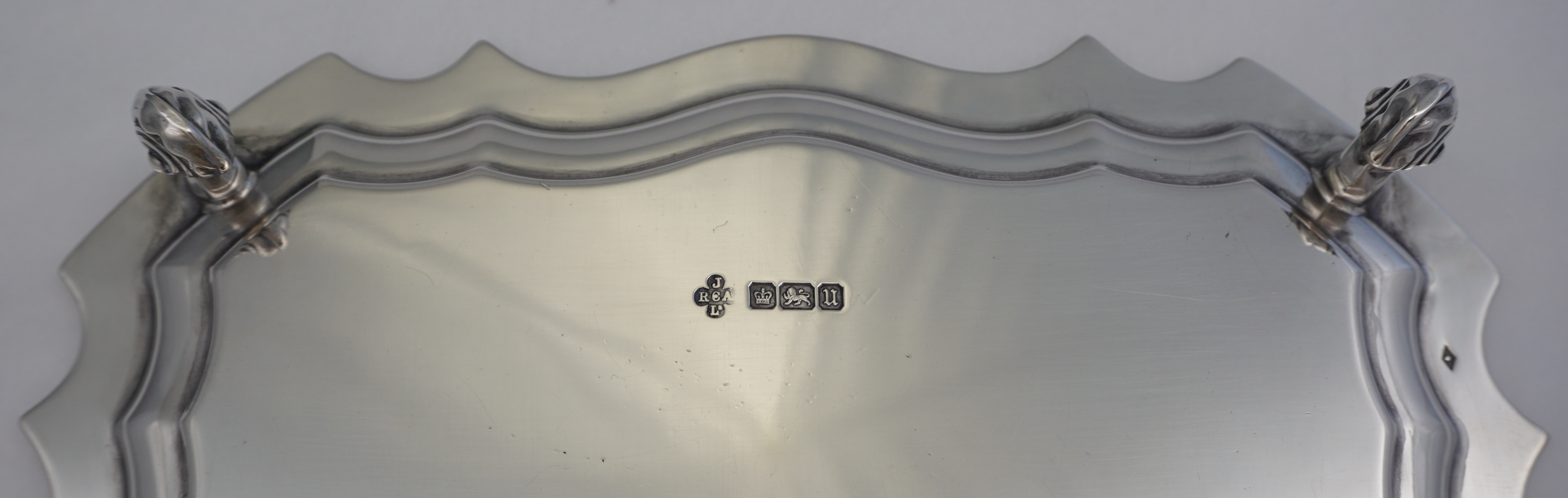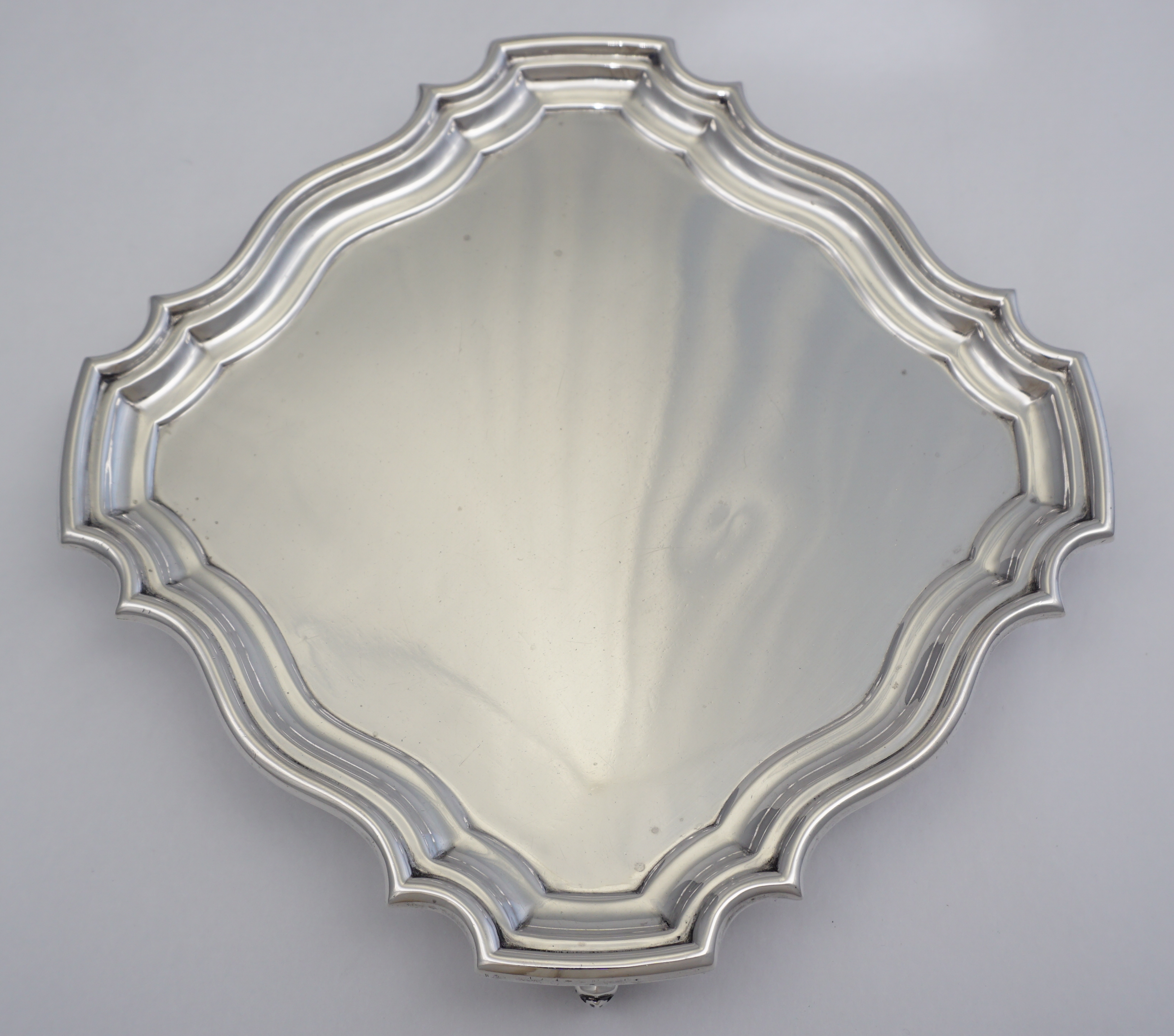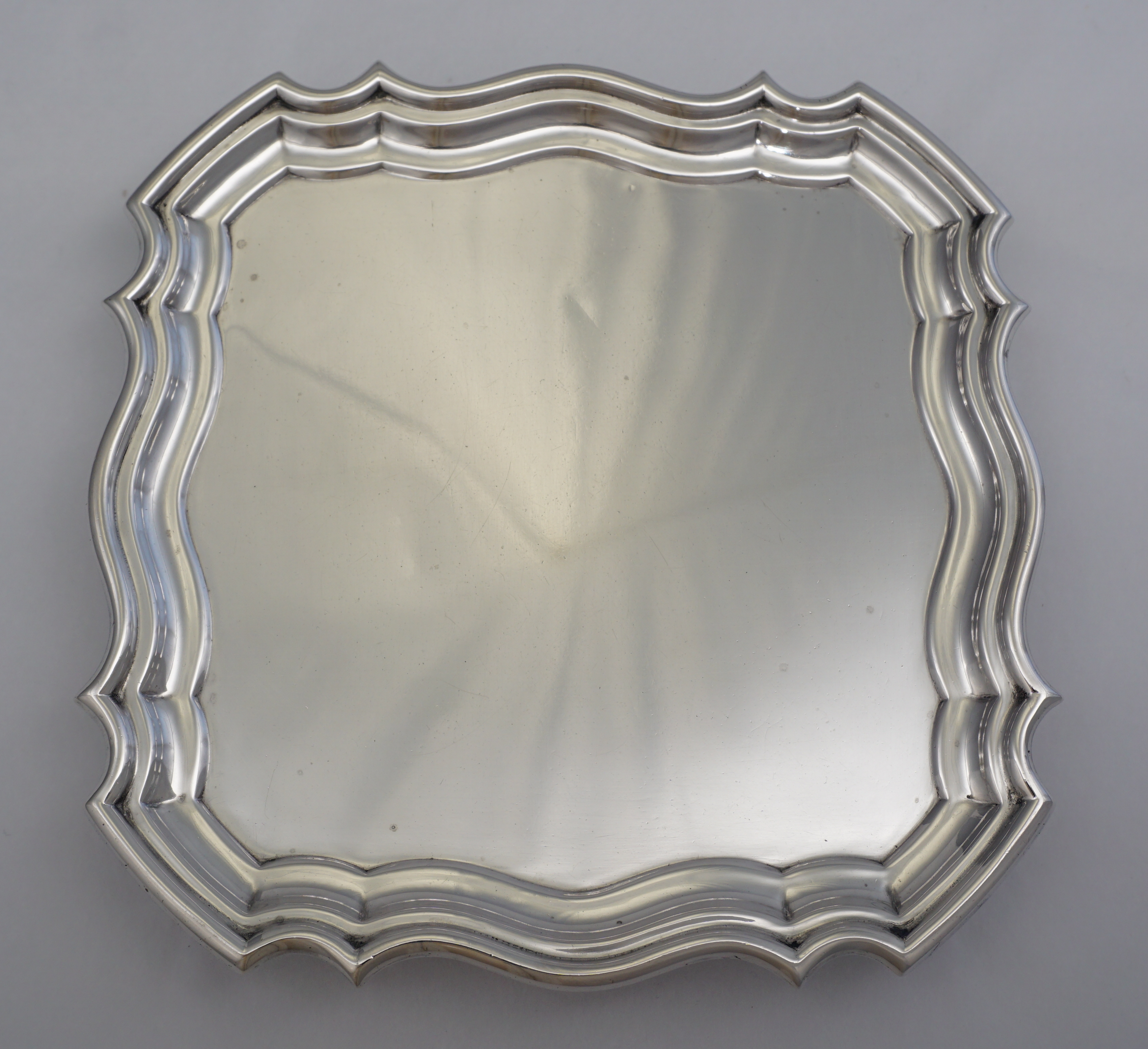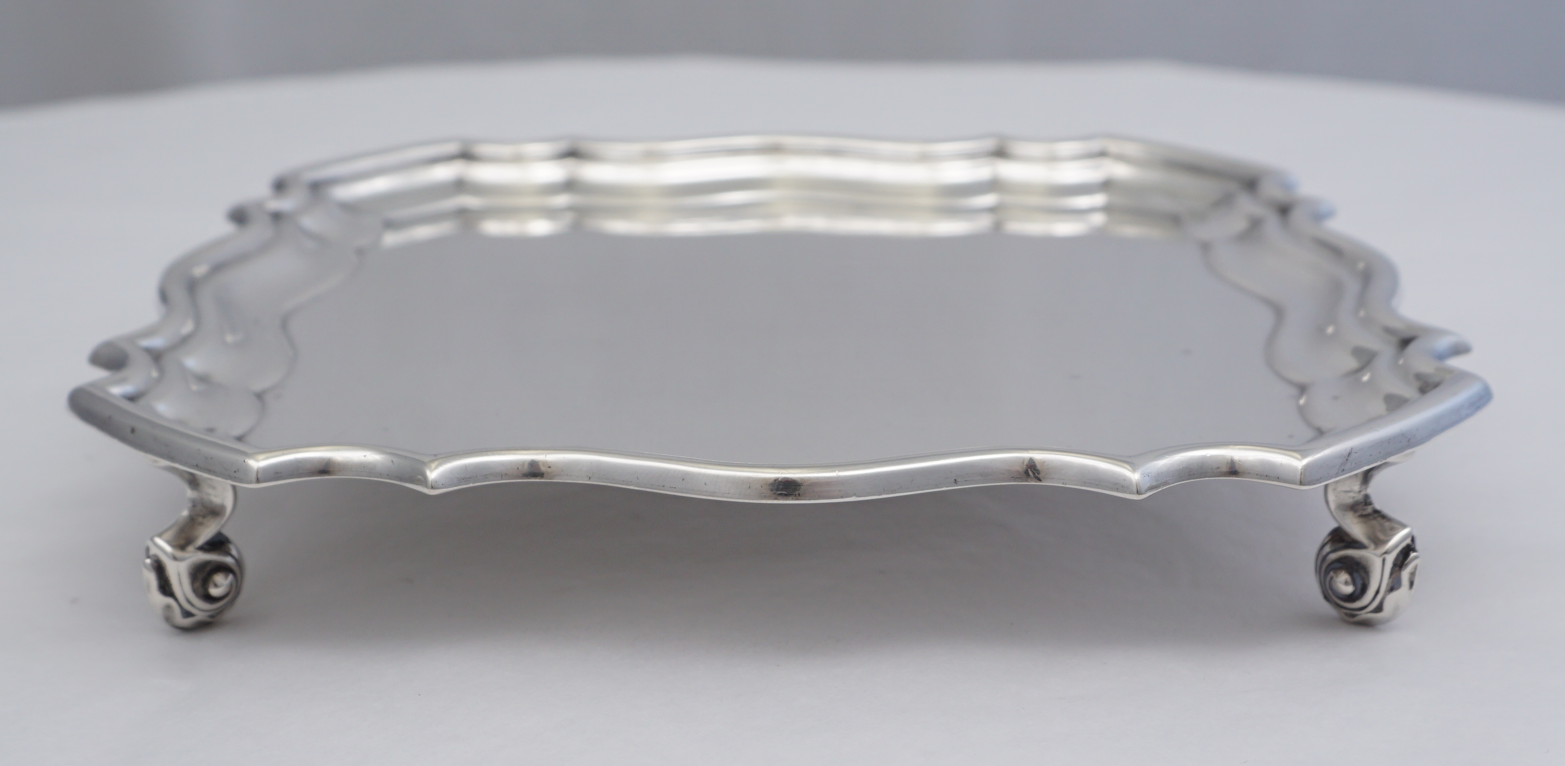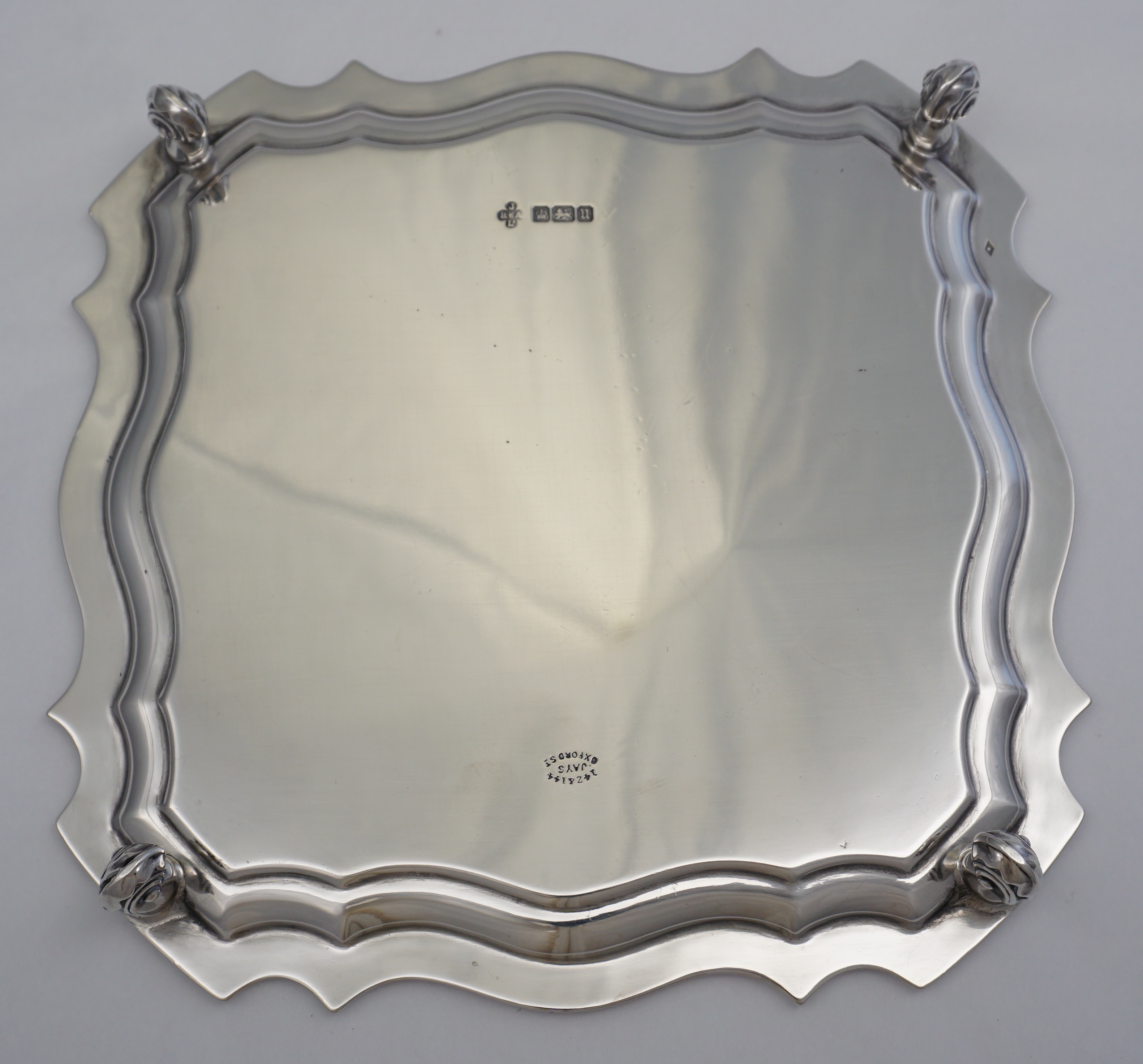 DESCRIPTION | Heavy antique English solid sterling silver square salver on four leaf capped scroll feet. |