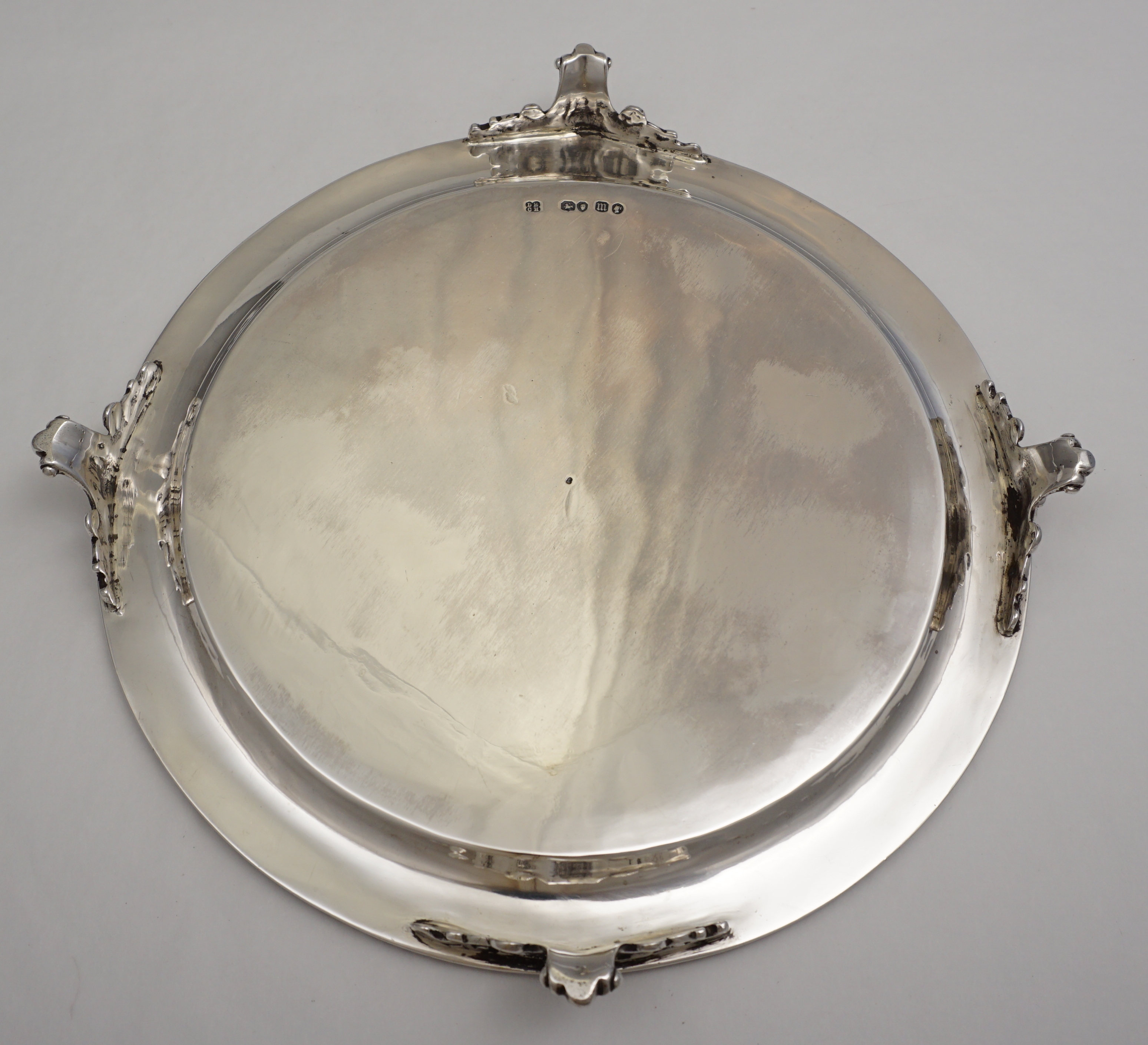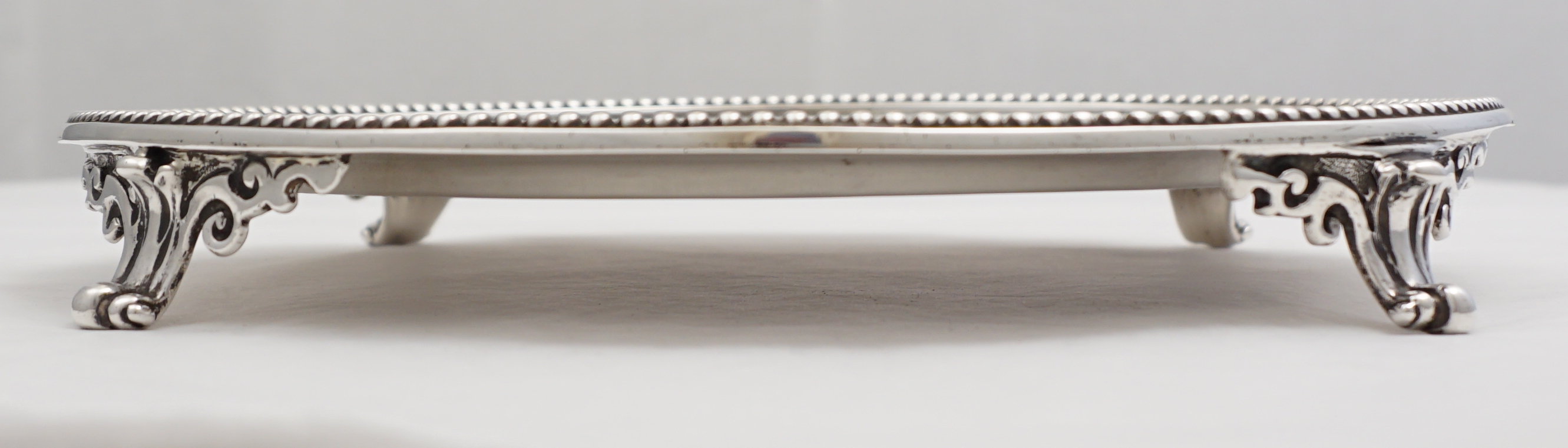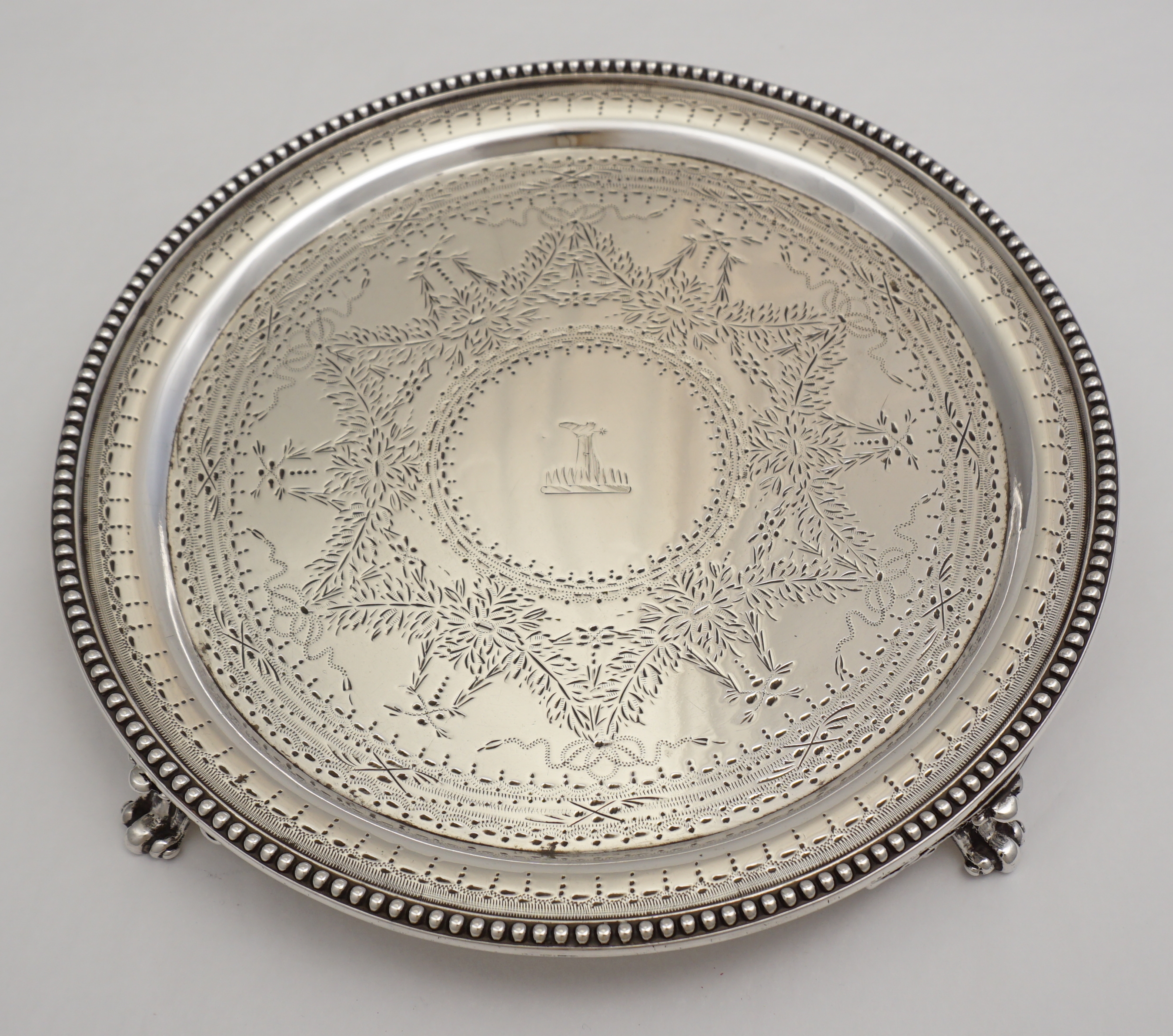 DESCRIPTION | Good antique English Victorian solid sterling silver salver with bead edge decoration, bright-cut engraving, four scrolling bracket feet and a central crest. |