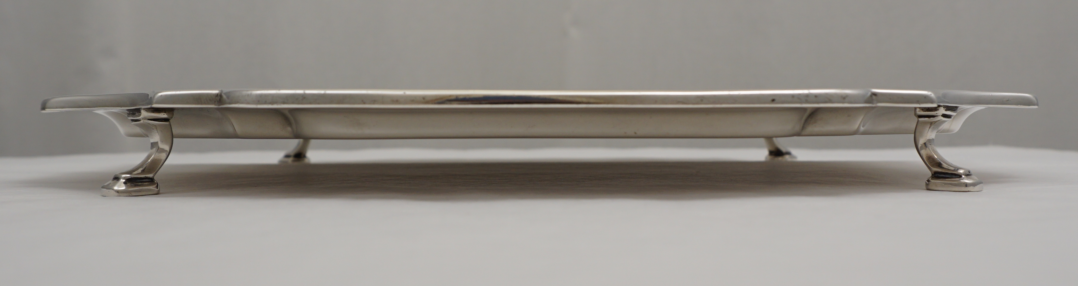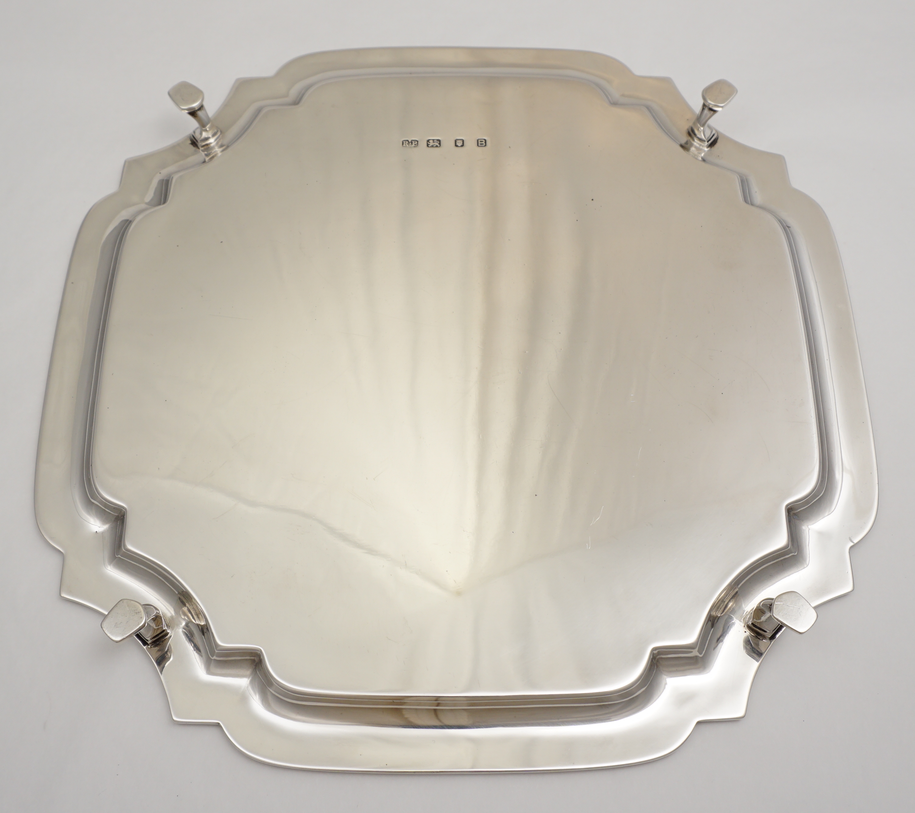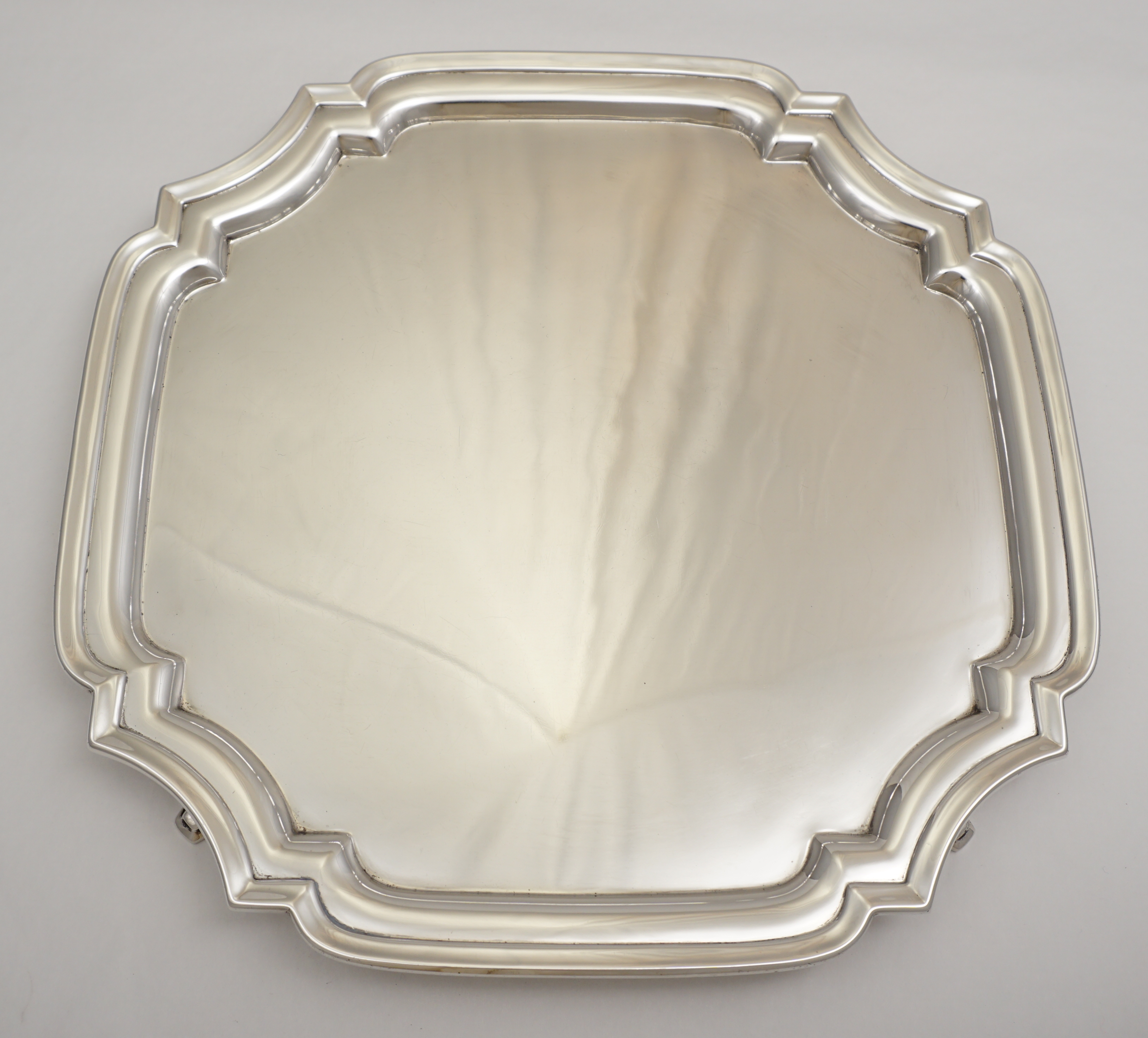 DESCRIPTION | Good vintage English solid sterling silver square salver with canted corners and no engraving or erasure. |