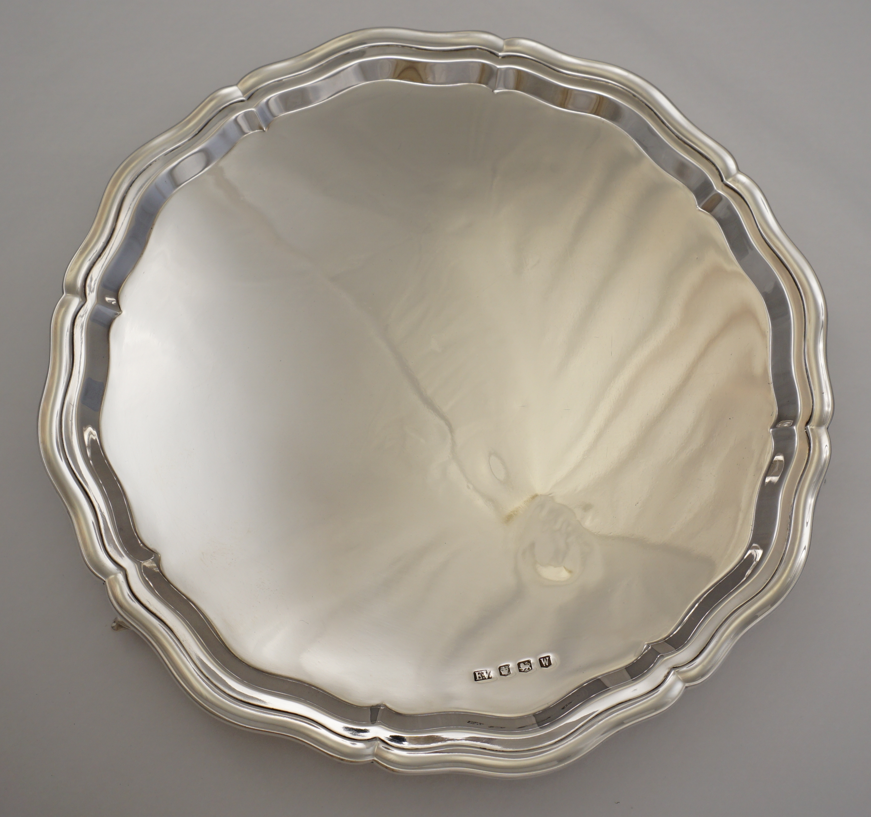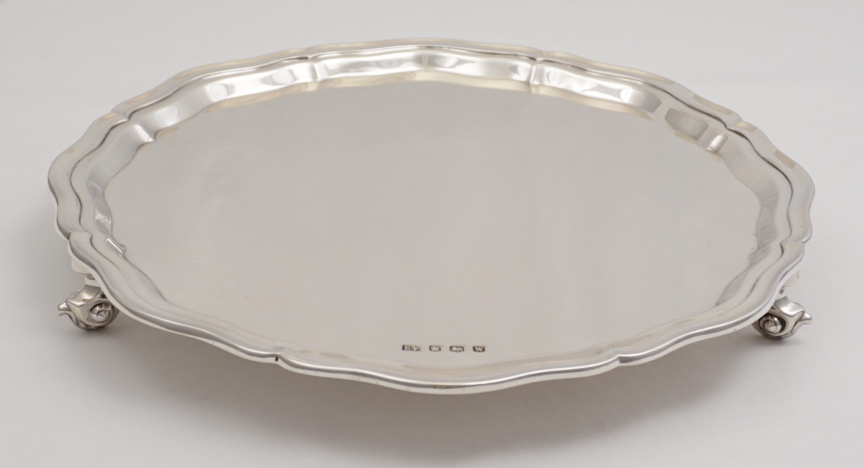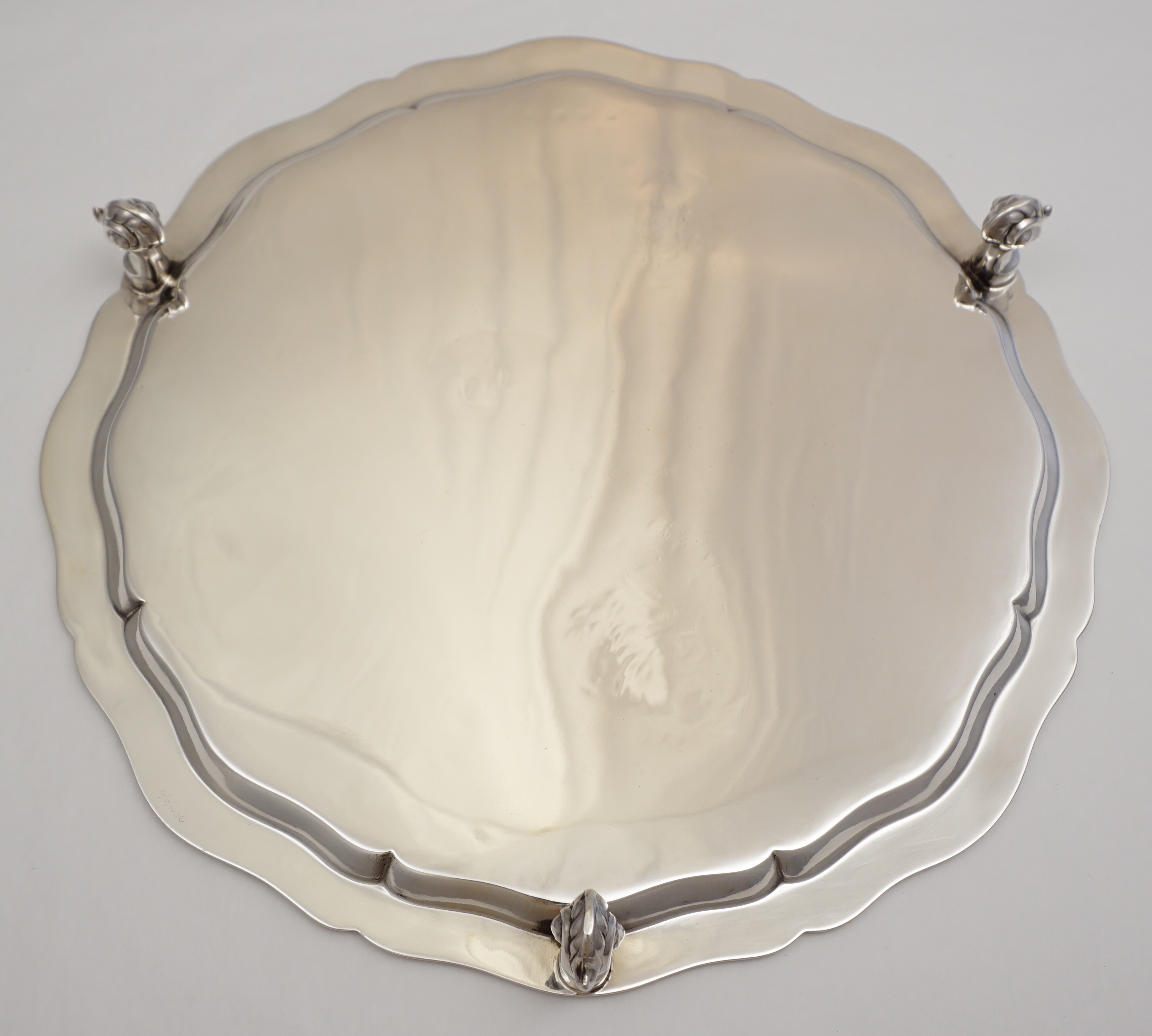 DESCRIPTION | Vintage English solid sterling silver salver with three scroll feet and no engraving. |