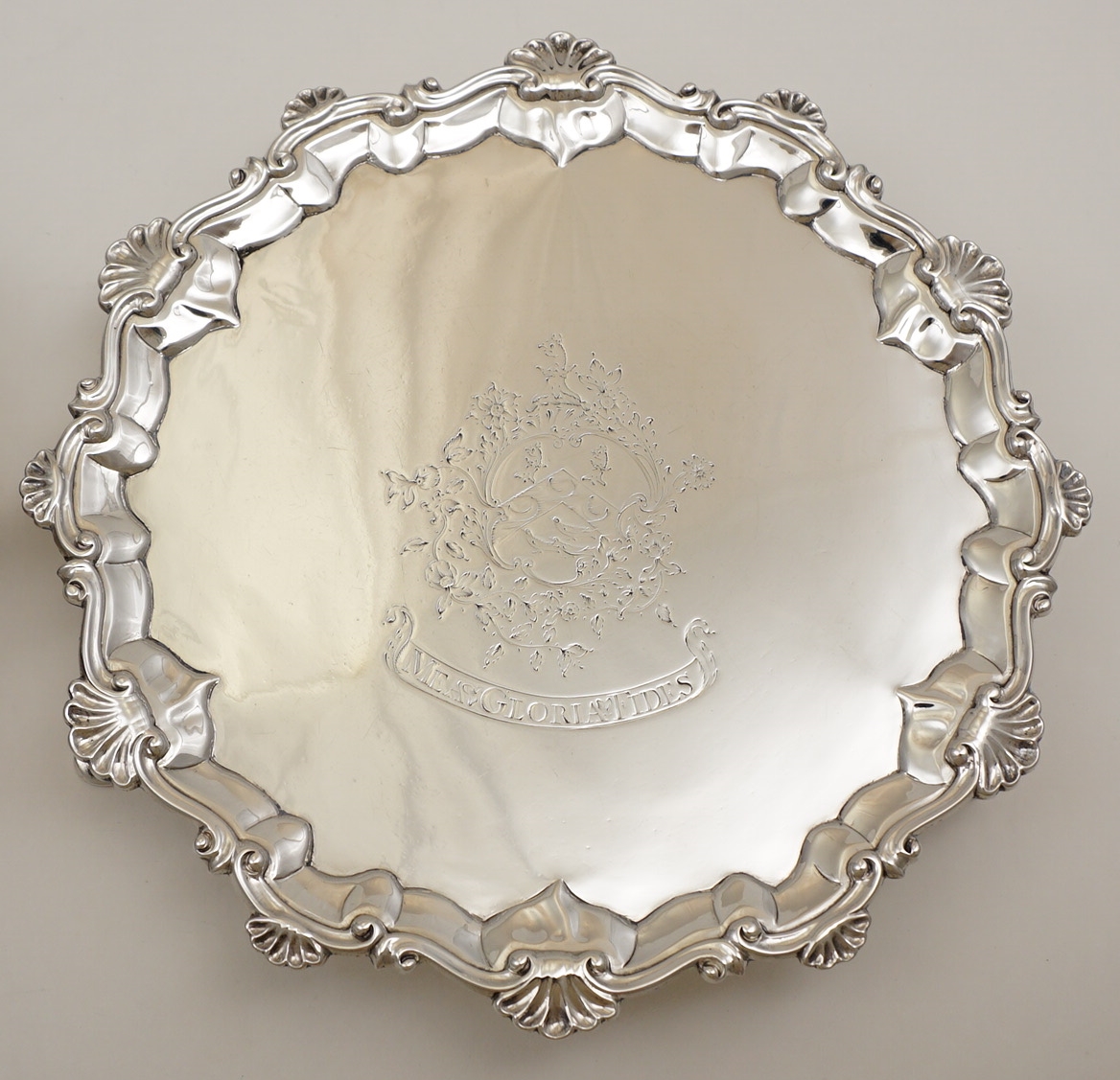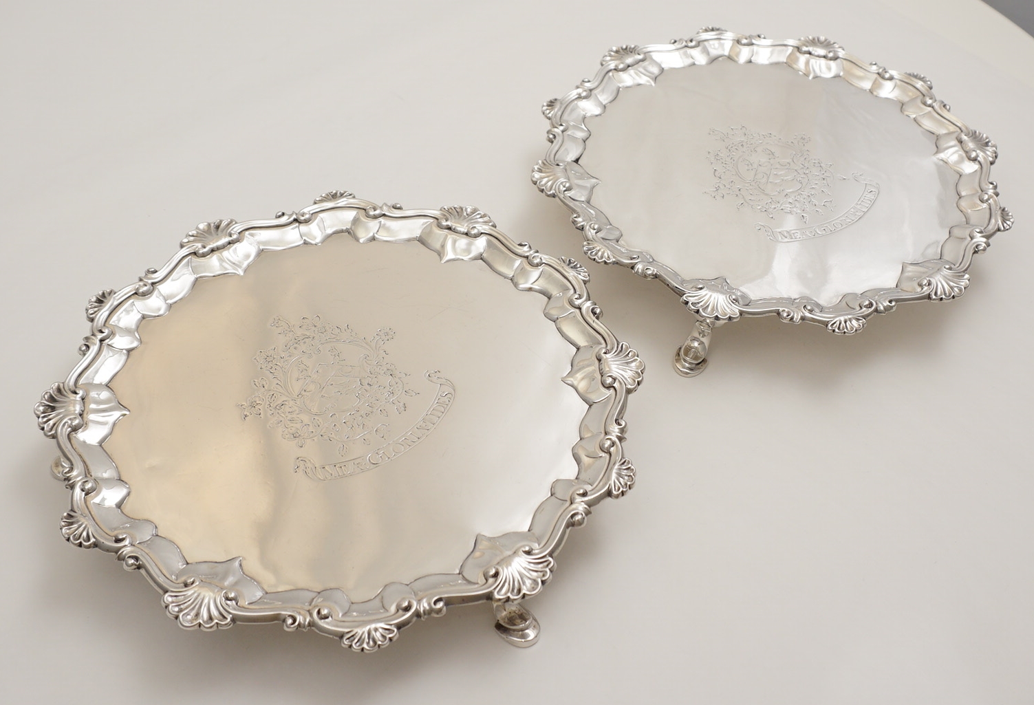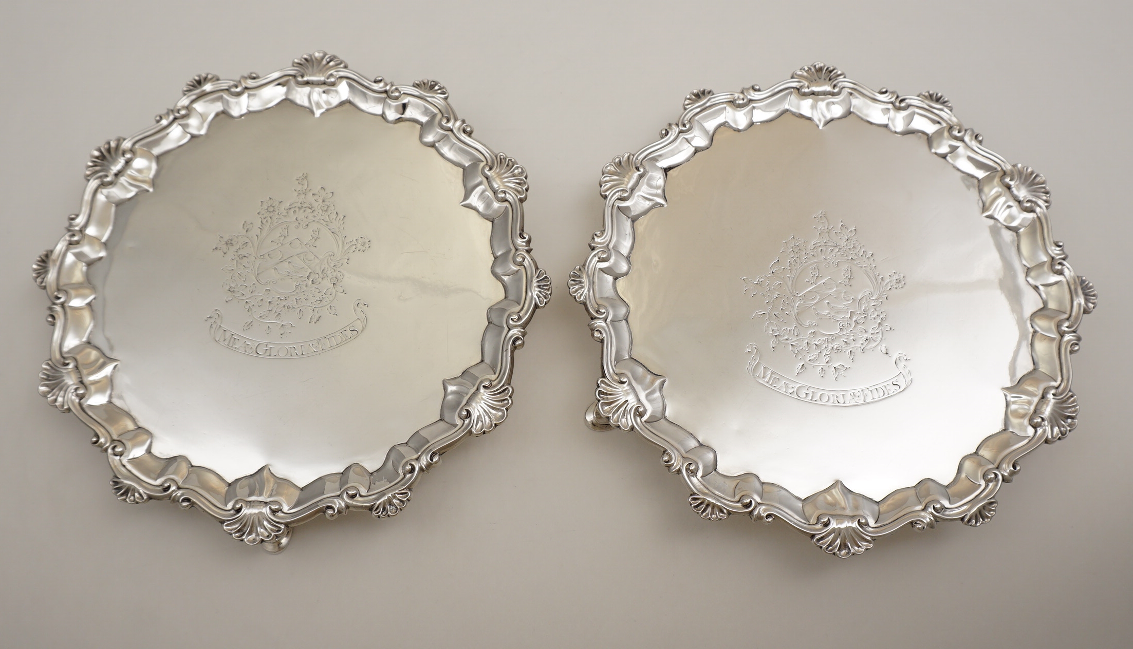 DESCRIPTION | Good and original pair of antique English Georgian solid sterling silver salvers with their original engraved armorial within mantling and motto MEA GLORIA FIDES. This crest and motto combination was used by the Watson family of Yorkshire. The engraving has softened a little but is actually excellent for its age and position. Typical, slightly clunky/crude solder joints of the period, function over beauty. Also a typical silver mix of the period with gas bubbles from the ingot evident verso. See the streaks of surface disruption on the backs. This is where the hole left by a gas bubble has been hammered and stretched out with the metal to form the salver from the ingot. There is a particularly good one image 6, left salver back, about three o'clock. These are features, not faults and just a few years later the technology of silver mixing improved and these features were only rarely seen again. That same salver back also still displays the slightly darker colour of the original surface and the broad, lighter band caused by the assayer's scrape over 250 years ago. Nice features of originality that I enjoy but are so often lost when silver is loved in the wrong way (too much polishing). Having just said that, I did need to sympathetically clean and polish these to do this description and condition report. They were black with tarnish and grime. Underneath could have been pits and repairs that could not be seen but I got lucky this time. The tarnish had sealed and protected the surface to leave us these two wonderful survivors. |