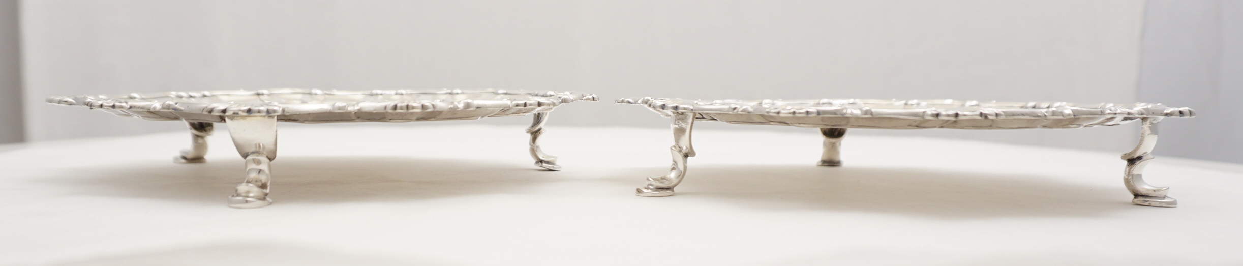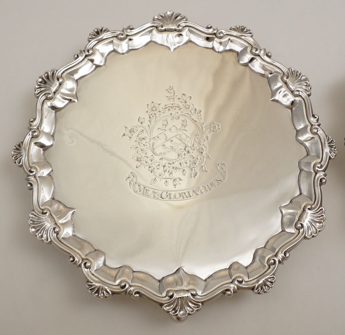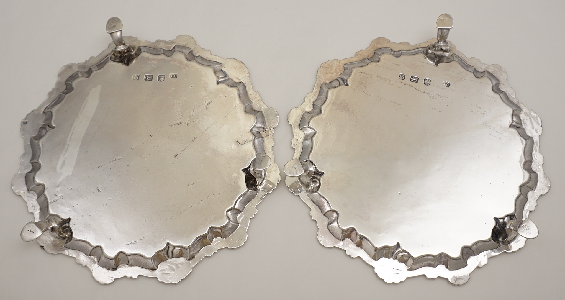 DESCRIPTION | Good and original pair of antique English Georgian solid sterling silver salvers with their original engraved armorial within mantling and motto MEA GLORIA FIDES. This crest and motto combination was used by the Watson family of Yorkshire. The engraving has softened a little but is actually excellent for its age and position. Typical, slightly clunky/crude solder joints of the period, function over beauty. Also a typical silver mix of the period with gas bubbles from the ingot evident verso. See the streaks of surface disruption on the backs. This is where the hole left by a gas bubble has been hammered and stretched out with the metal to form the salver from the ingot. There is a particularly good one image 6, left salver back, about three o'clock. These are features, not faults and just a few years later the technology of silver mixing improved and these features were only rarely seen again. That same salver back also still displays the slightly darker colour of the original surface and the broad, lighter band caused by the assayer's scrape over 250 years ago. Nice features of originality that I enjoy but are so often lost when silver is loved in the wrong way (too much polishing). Having just said that, I did need to sympathetically clean and polish these to do this description and condition report. They were black with tarnish and grime. Underneath could have been pits and repairs that could not be seen but I got lucky this time. The tarnish had sealed and protected the surface to leave us these two wonderful survivors. |