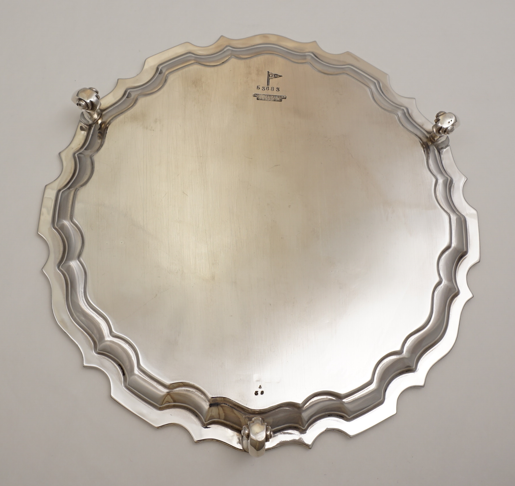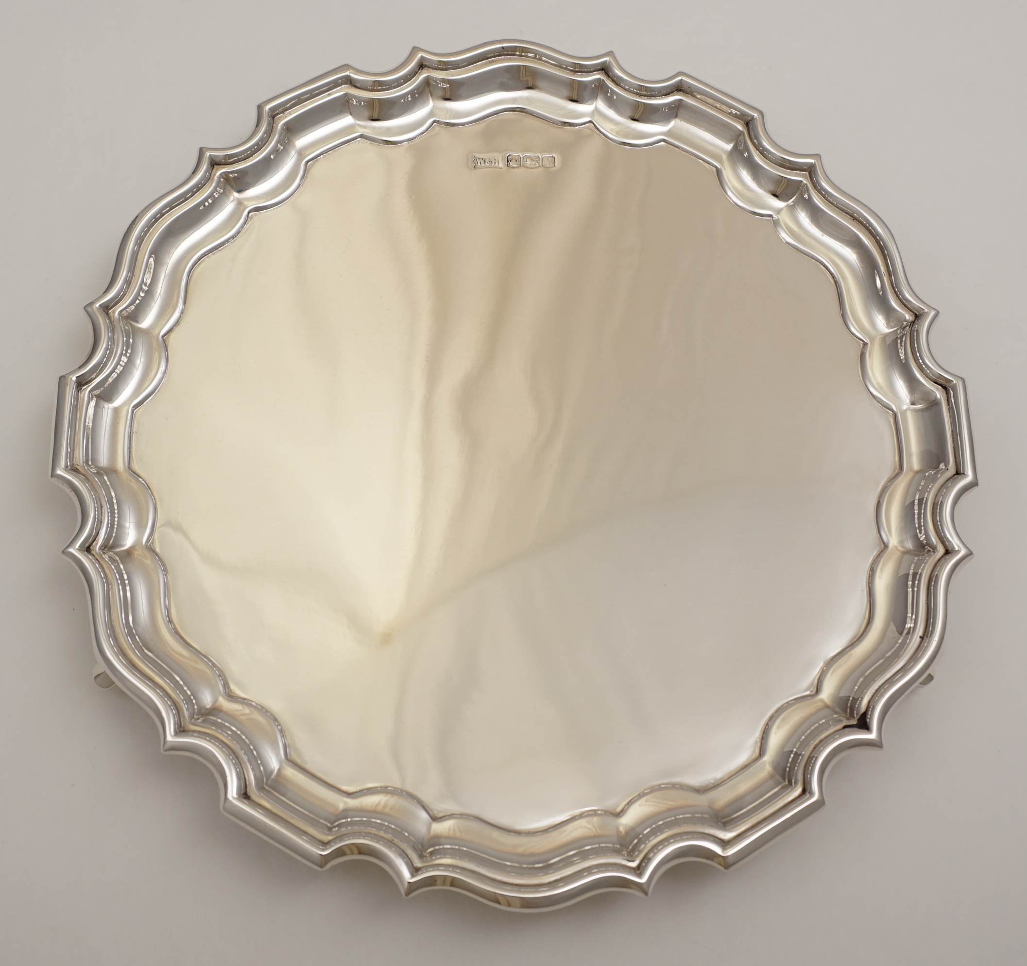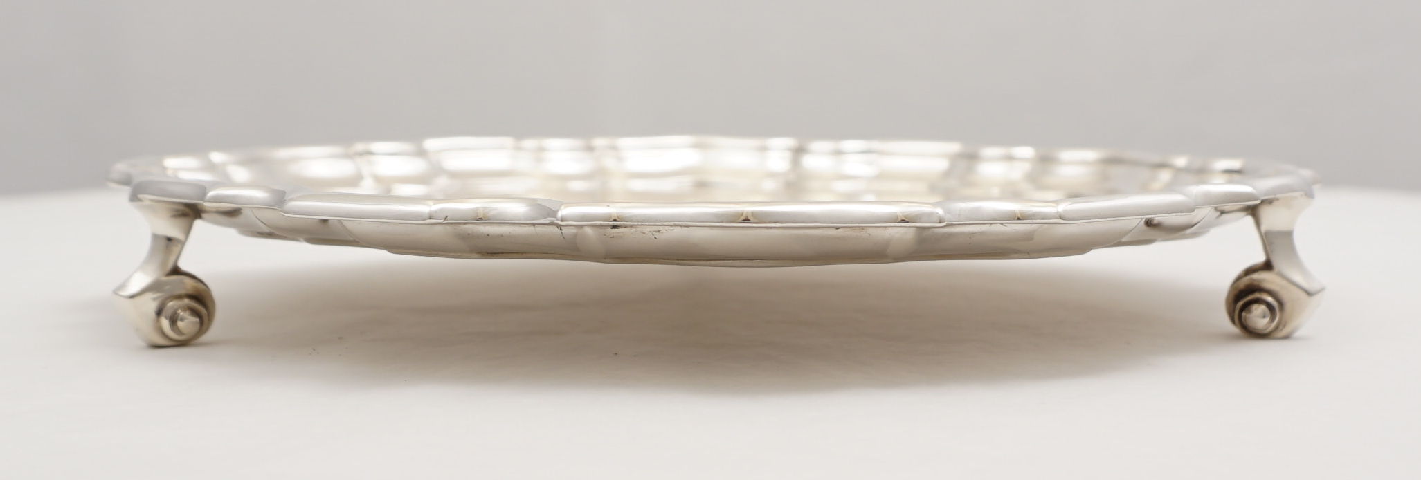 DESCRIPTION | Good vintage English solid sterling silver salver on three scroll feet. |