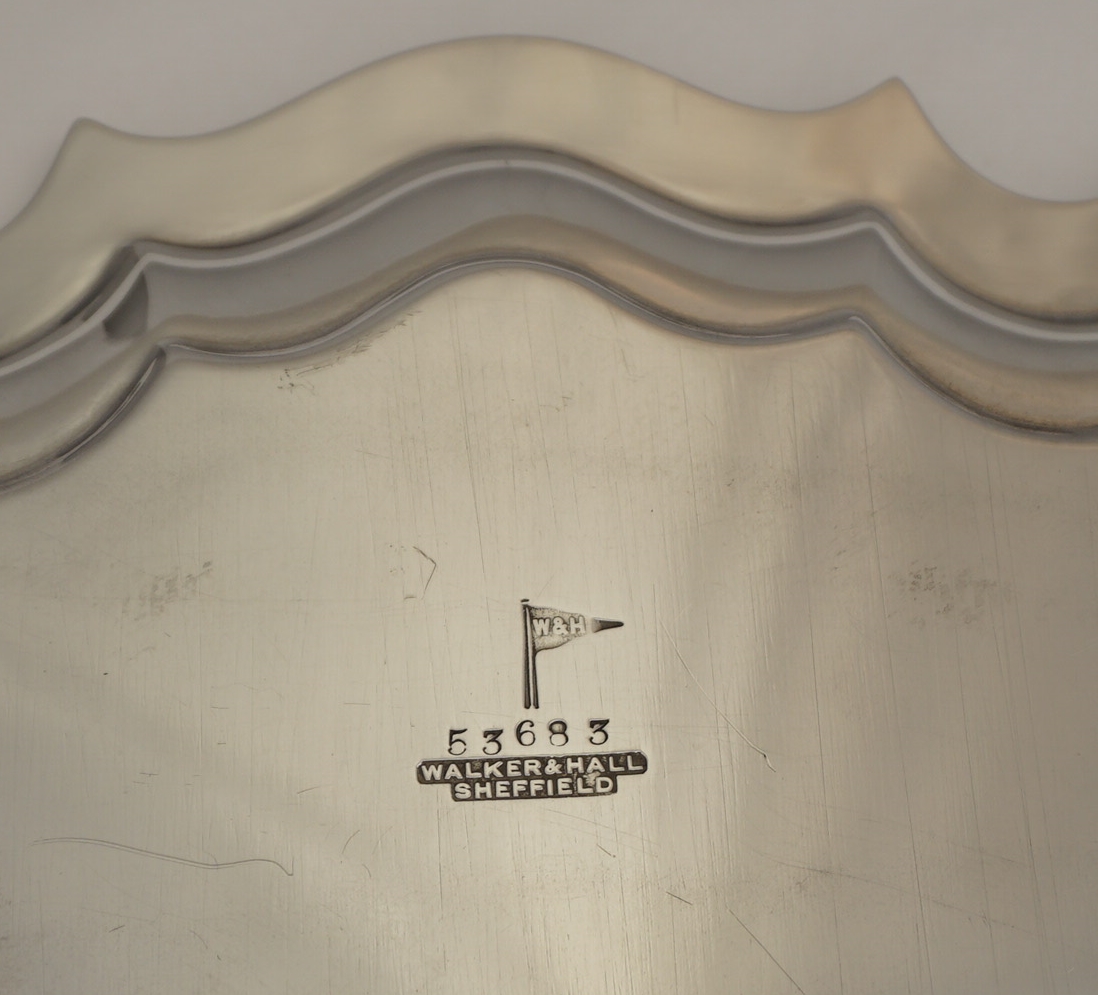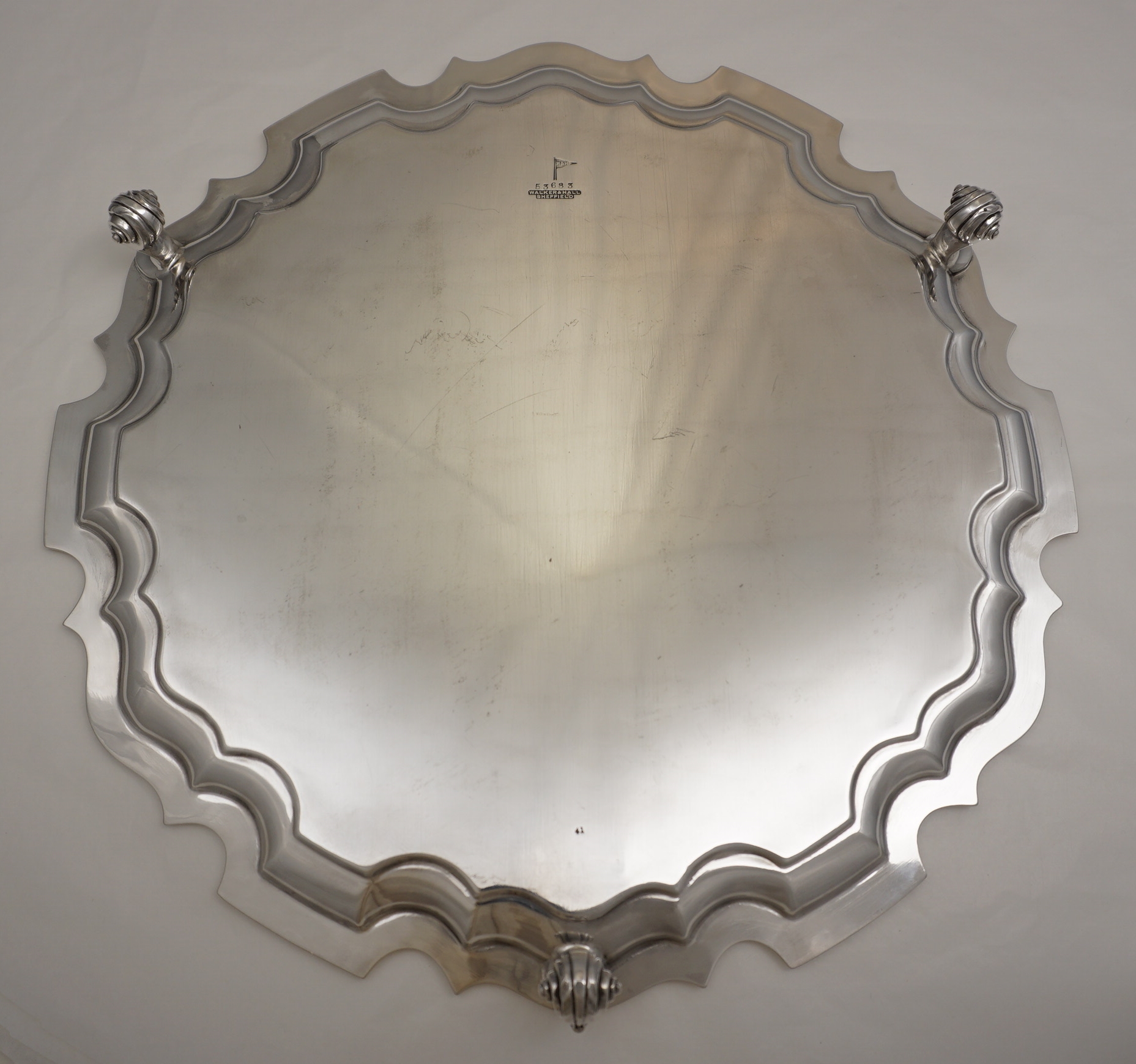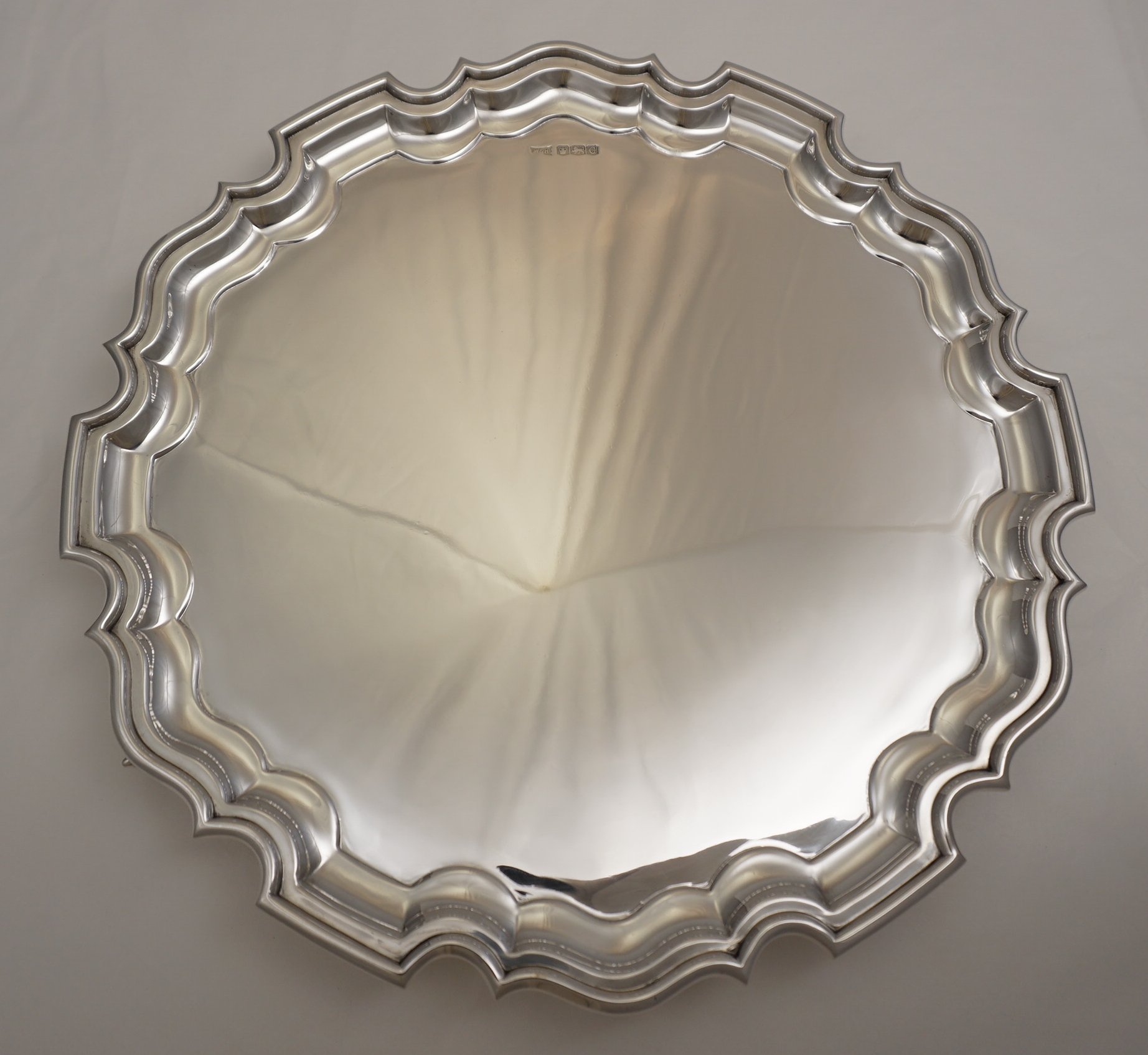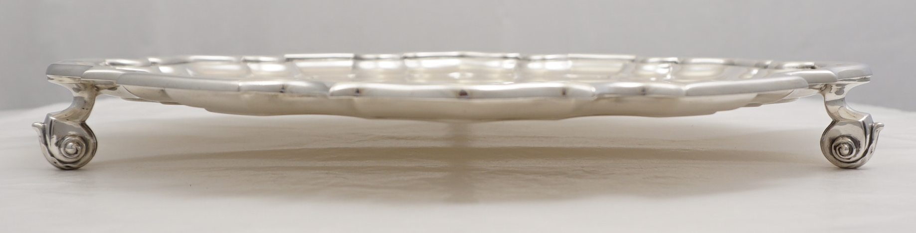 DESCRIPTION | Large, heavy and perfect vintage English solid sterling silver salver with a pie crust style border and three flying leaf capped scroll feet. |