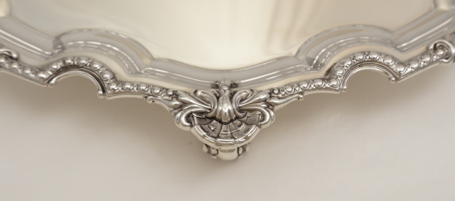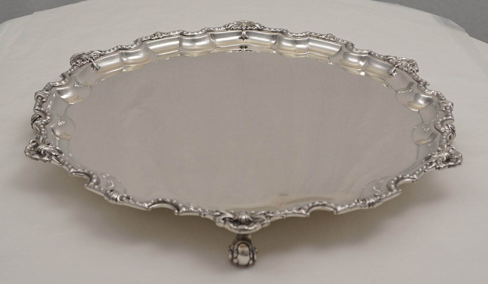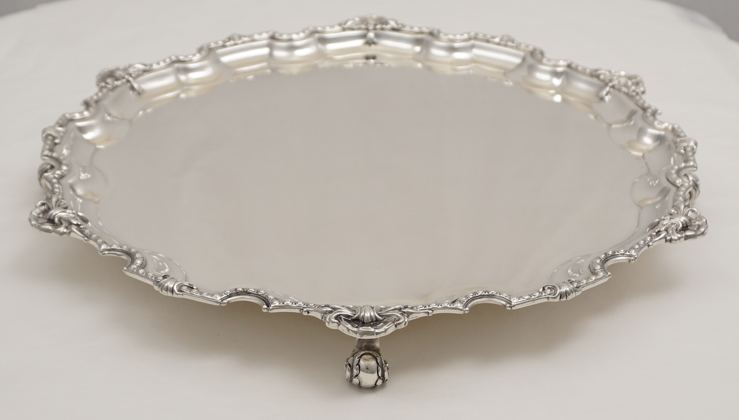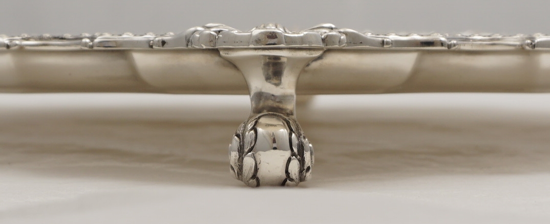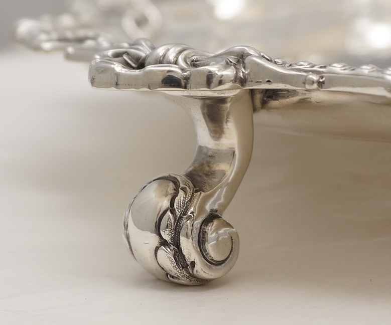 DESCRIPTION | Superb, highest quality, vintage English solid sterling silver salver with four leaf capped scroll feet and no engraving or erasure. The stunning border has egg and dart motifs interspersed with 'C' scrolls, harebells, foliage and scallops. |