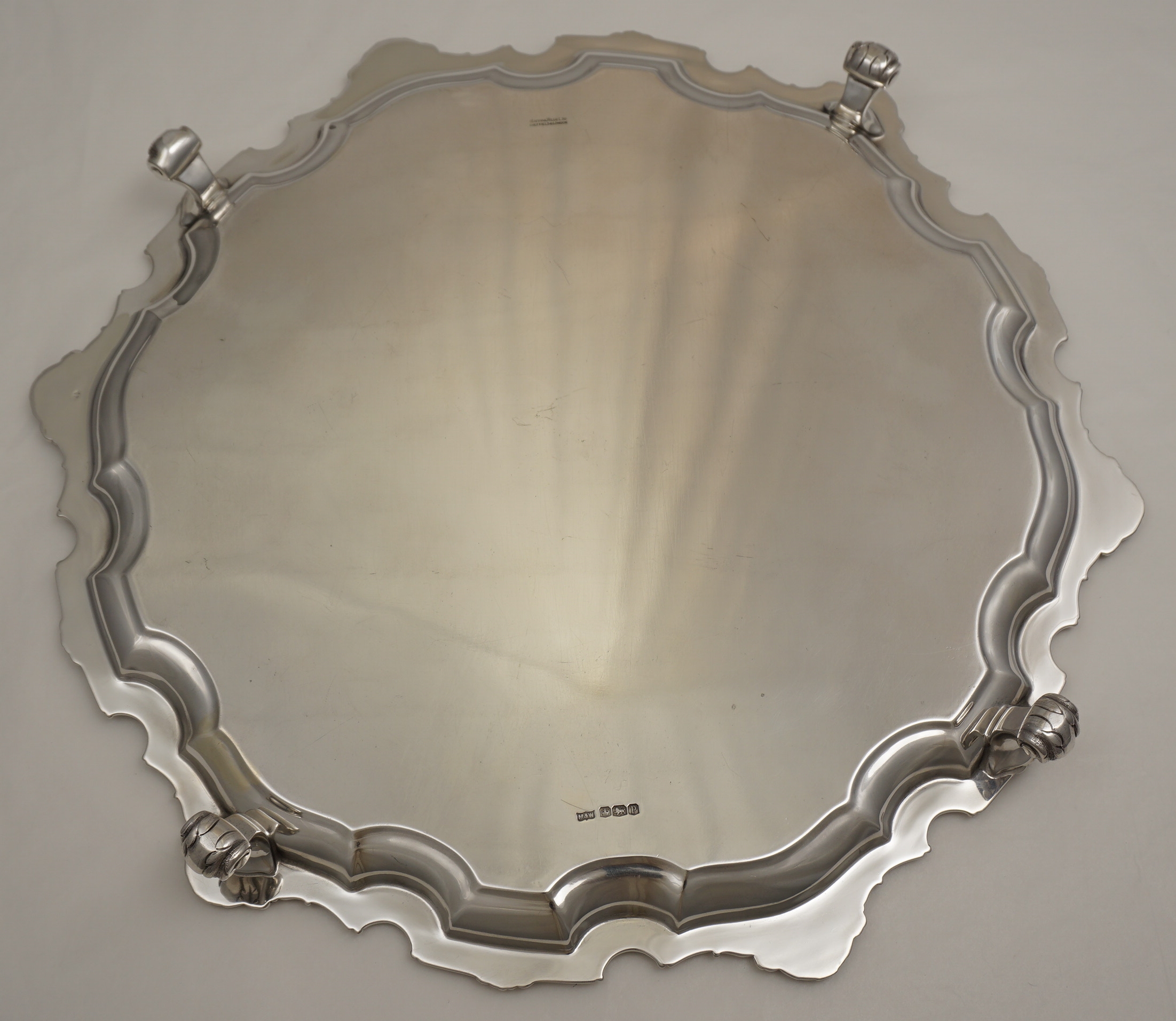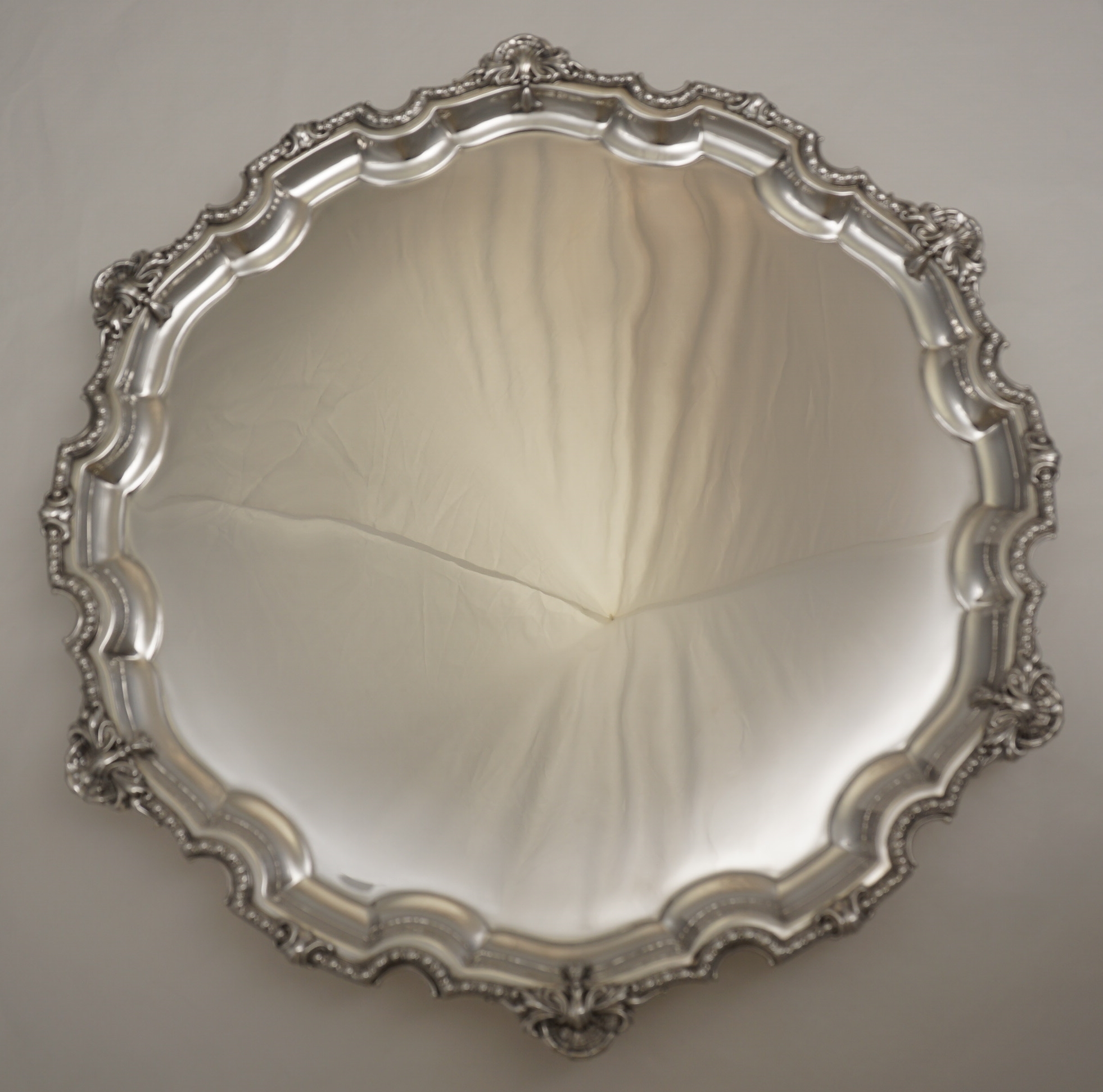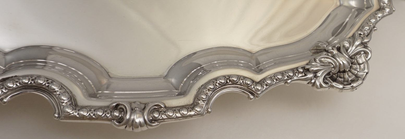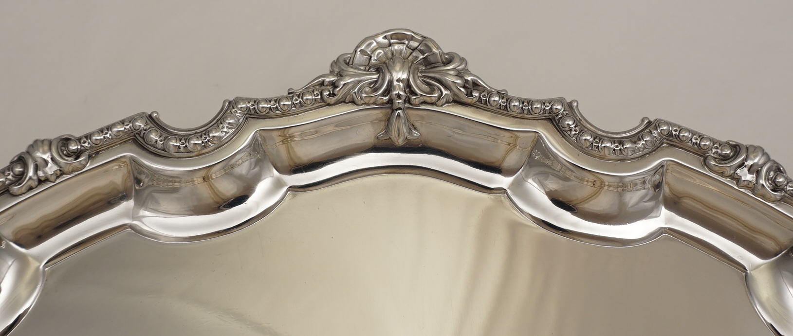 DESCRIPTION | Superb, highest quality, vintage English solid sterling silver salver with four leaf capped scroll feet and no engraving or erasure. The stunning border has egg and dart motifs interspersed with 'C' scrolls, harebells, foliage and scallops. |