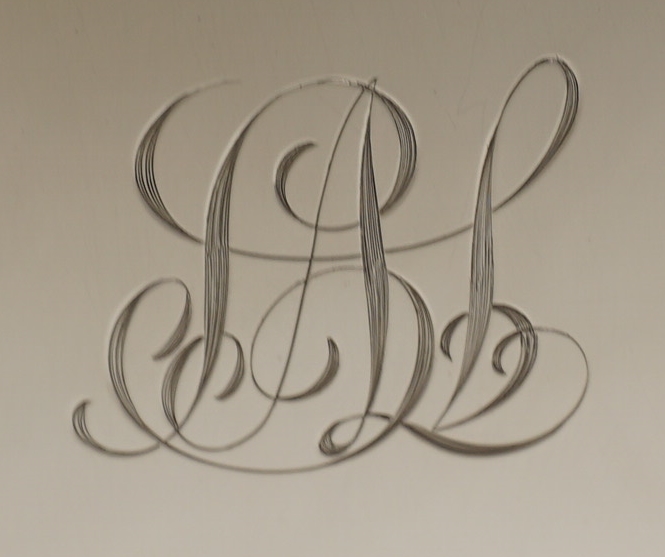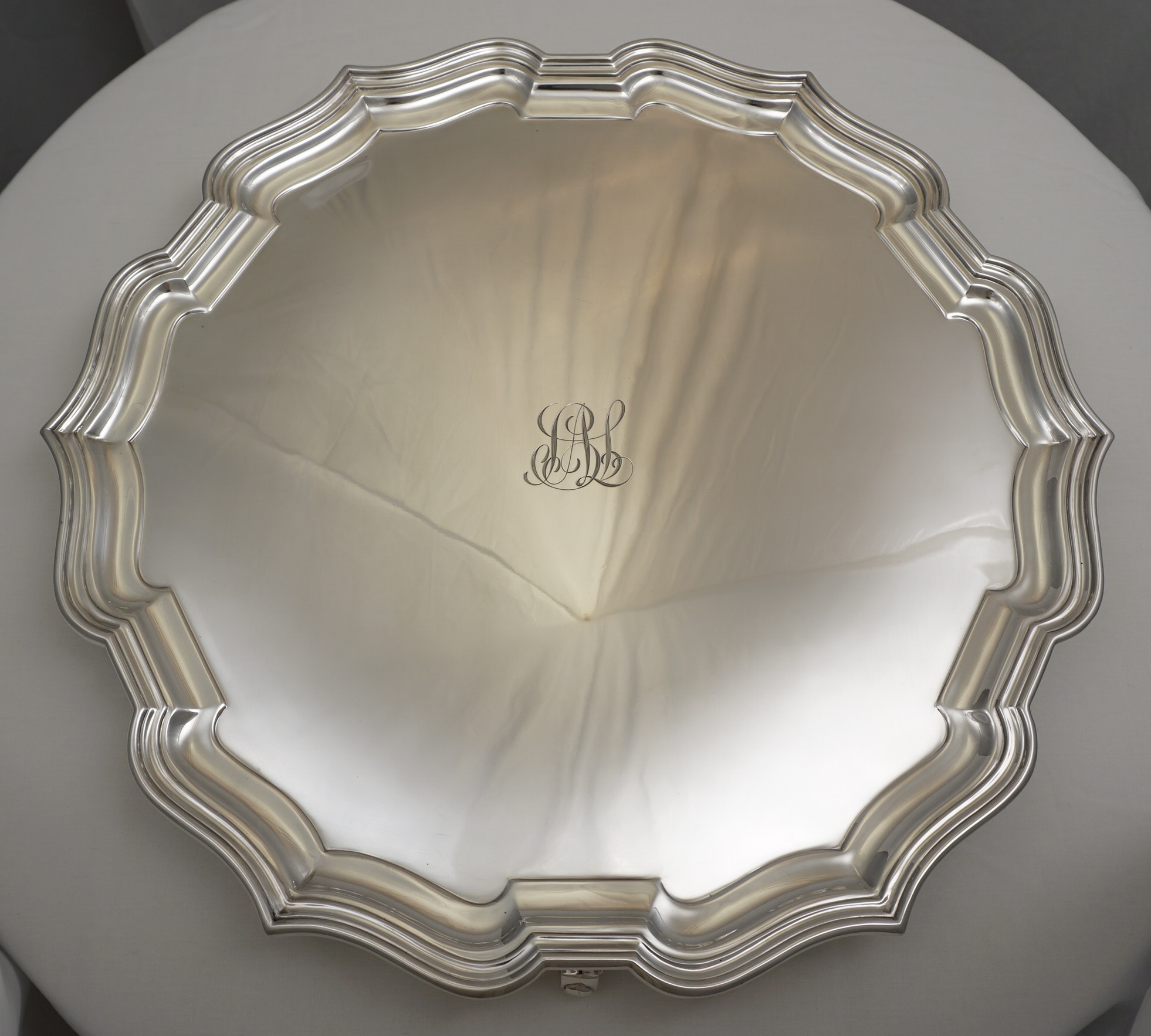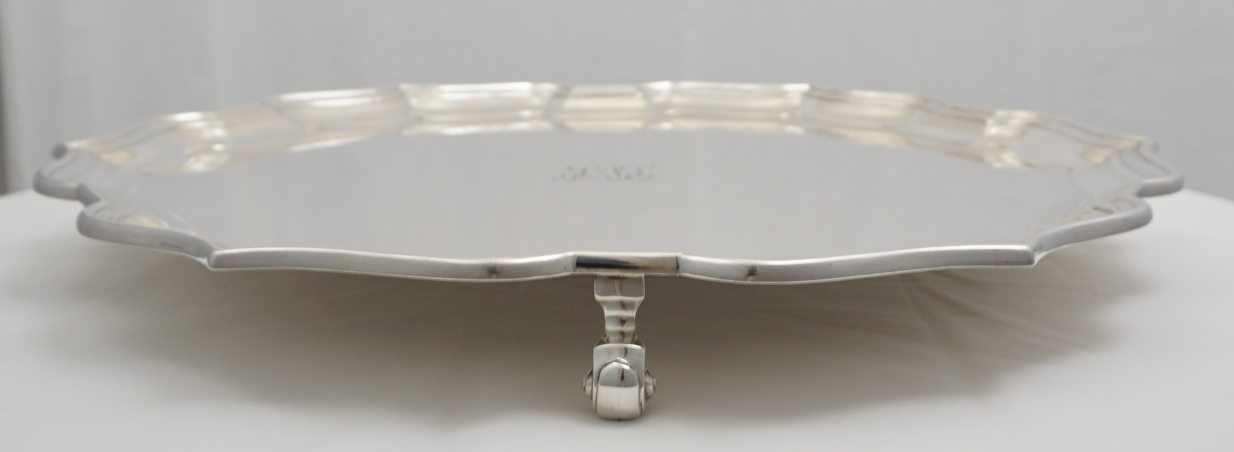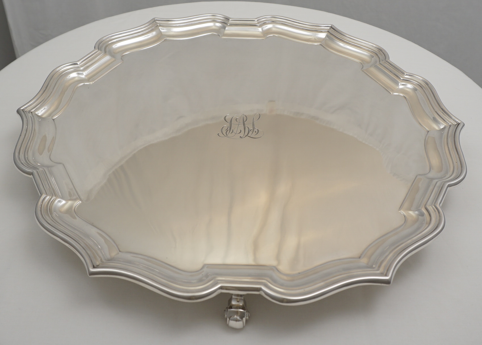 DESCRIPTION | Large and massive vintage English solid sterling silver salver on three scroll feet and with the original central monogram engraving. Traditional Georgian form with a Chippendale border yet in a slightly simplified Art Deco style. Comes in the original green felt bag that although now a bit moth nibbled is still a pleasing and rare item to find. |