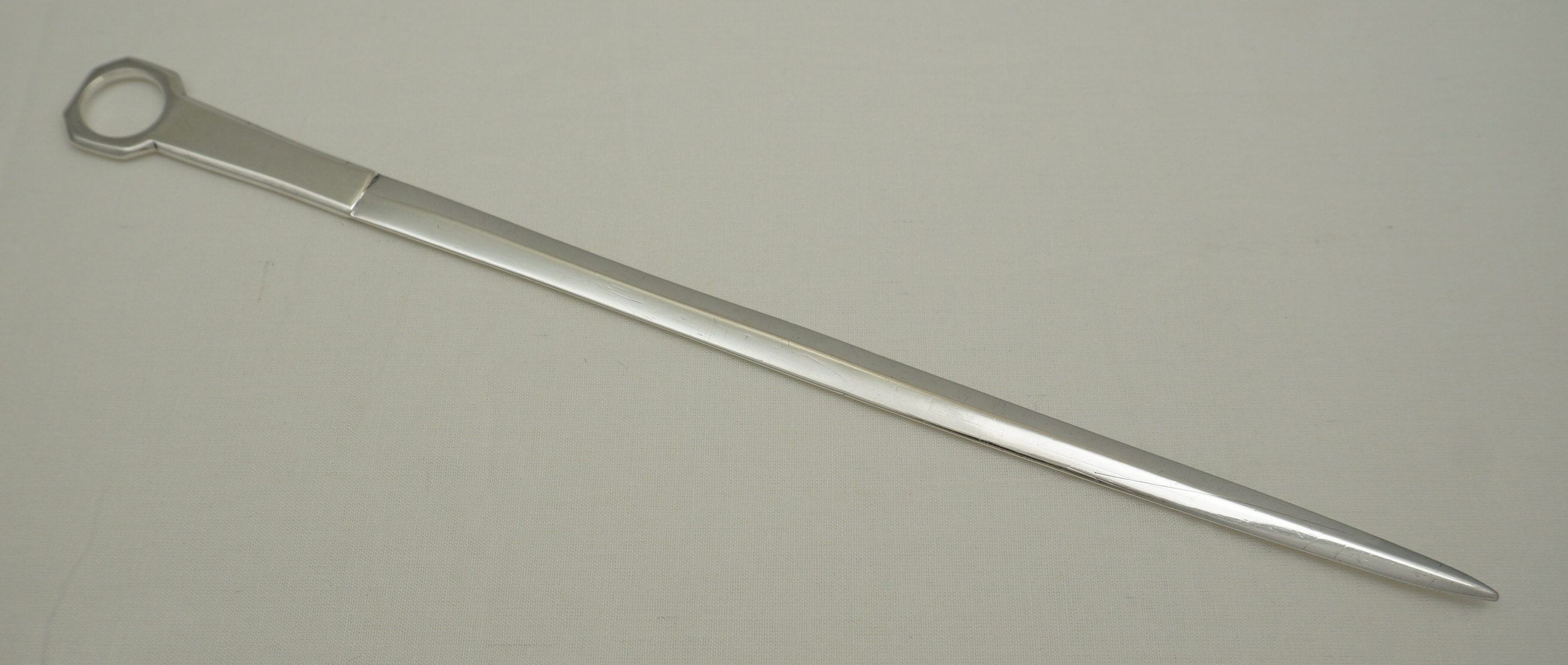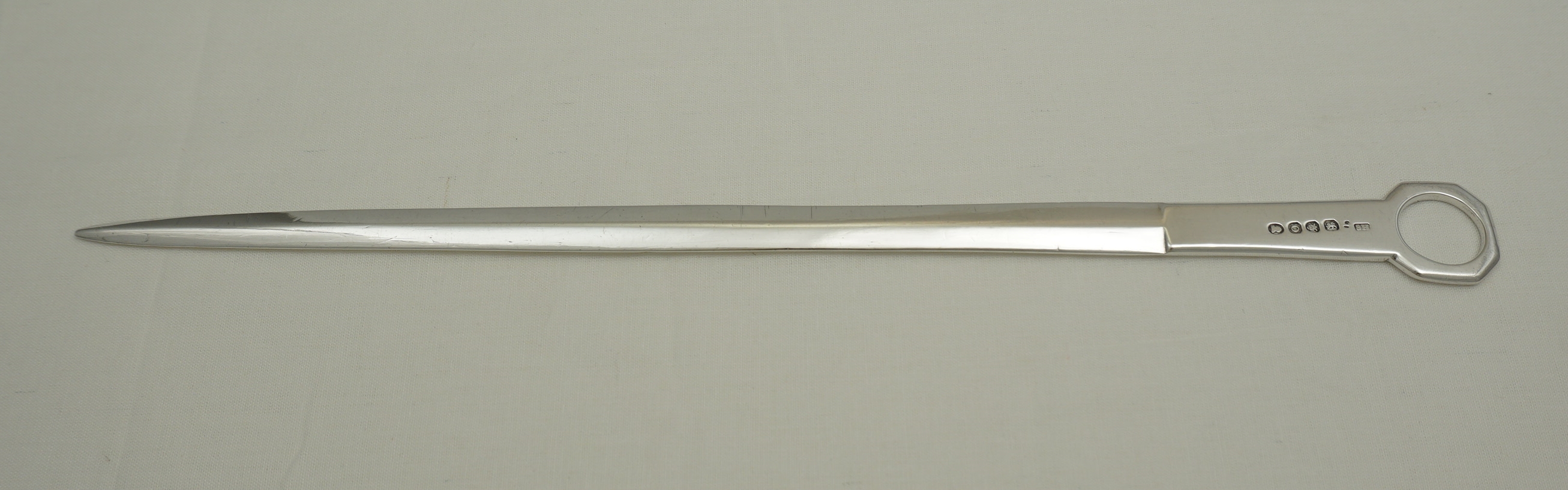 DESCRIPTION | Antique English Georgian solid sterling silver meat skewer with an unusual octagon handle an no engraving or erasure. These are used to ensure that the centres of large roasting joints are safely cooked. I have found that they can also reduce the cooking time by 20% so are energy saving too. |