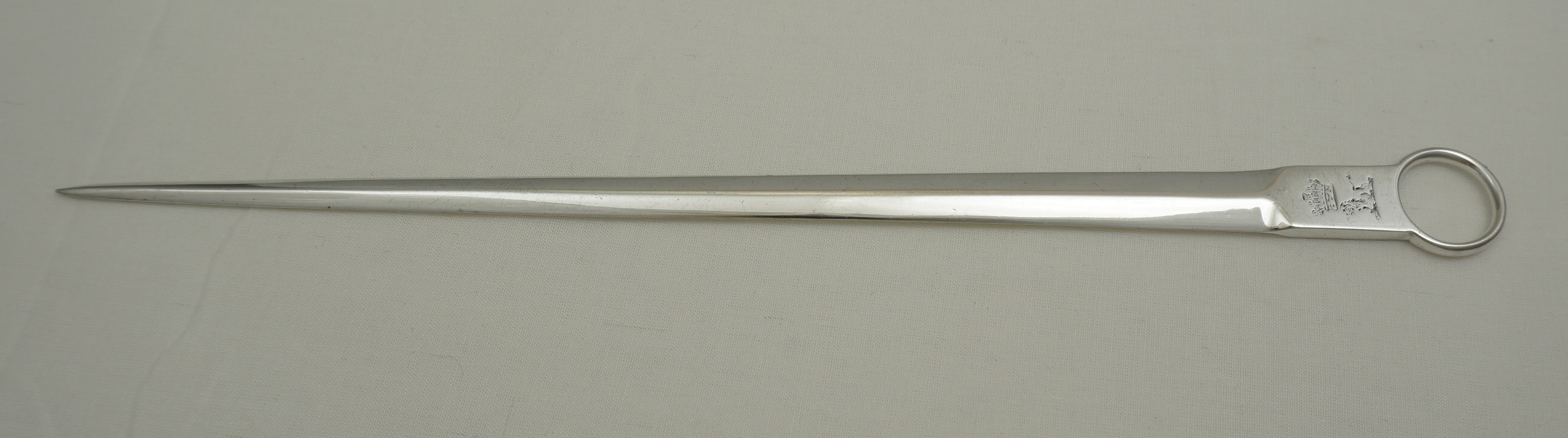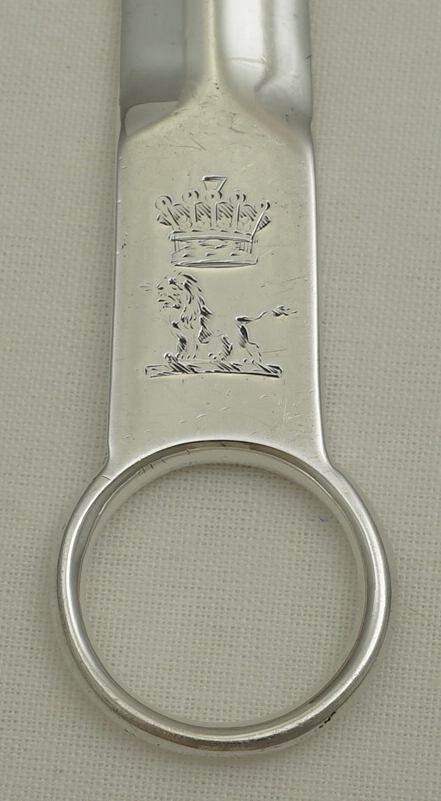 DESCRIPTION | Very good antique English Georgian solid sterling silver meat skewer with the original lion crest below an Earl's coronet engraving to the terminal and a ring handle. These are used to ensure that the centres of large roasting joints are safely cooked. I have found that they can also reduce the cooking time by 20% so are energy saving too. |