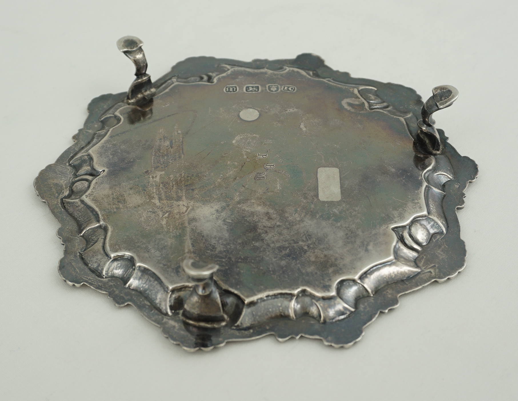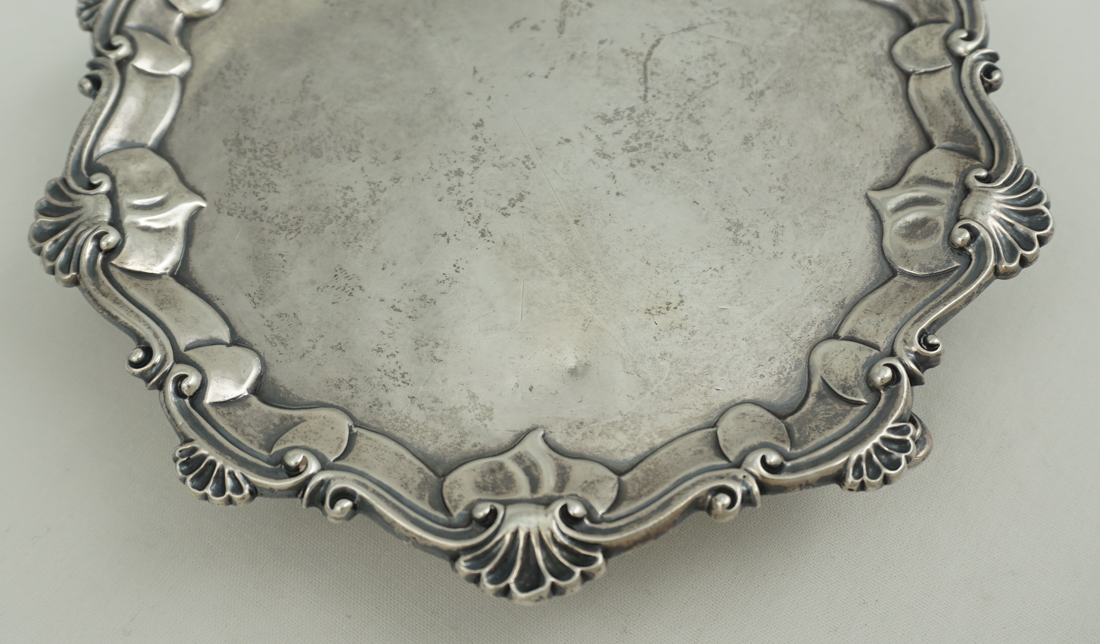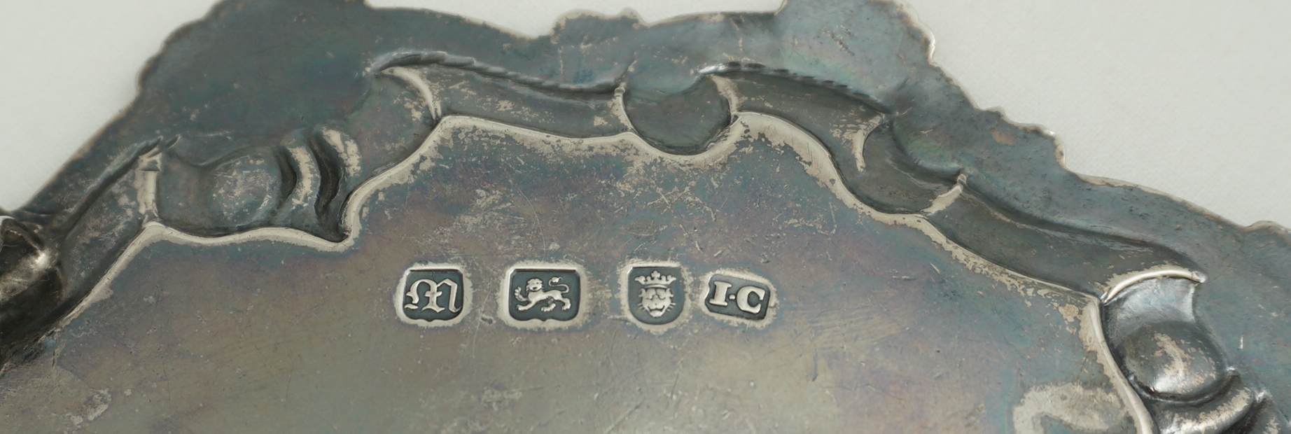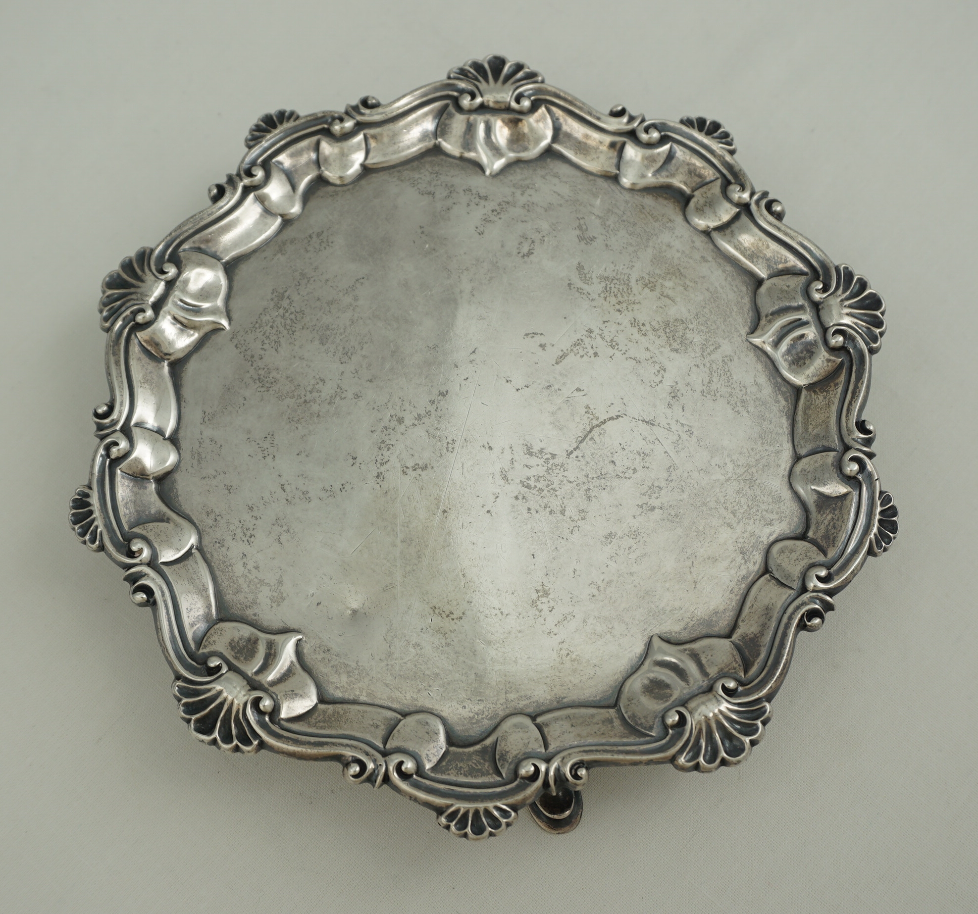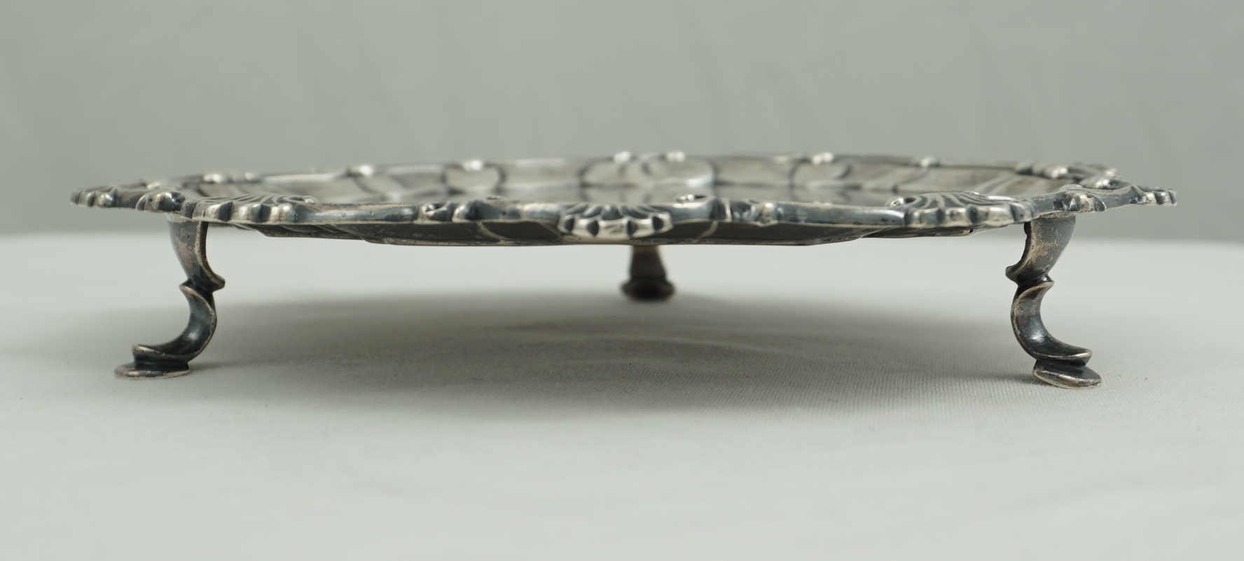 CONDITION | excellent, no erasure, pleasingly thick silver, patinated but would be easy to polish up, two legs slightly bent, a little bend/wobble to the shell and scroll rim, tiny bump and surface marks commensurate with use, a really good example. |