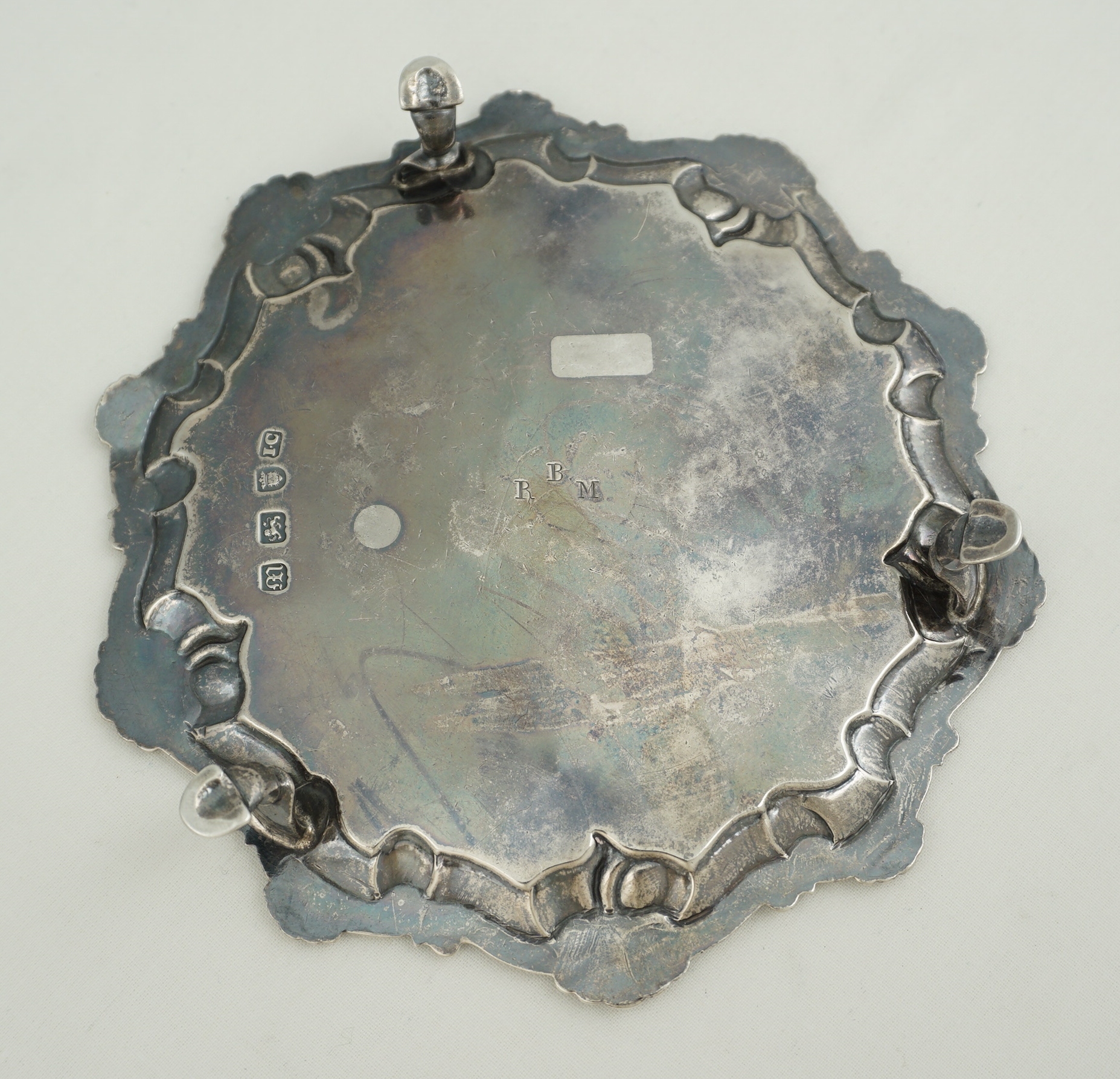 DESCRIPTION | Very good antique English Georgian solid sterling silver salver on three hoof feet and with the original initials engraving discreetly situated verso. B over R M so Mr. R. B. marries Mrs. M. B. Quite possibly this was a wedding gift. It is extremely unusual to find the upper surface unadorned with no engraving or erasure, the silver is still pleasingly thick. The underside is deeply patinated and between the two feet below the engraving can still be seen the original assay scrape. The hallmarks are beautifully struck and well preserved and the odd little circle and rectangle are where old stickers were attached. Little salvers/waiters such as this are sometimes called 'card waiters/salvers'. They would sit in your hallway near the front door for your servant to place the calling cards of visitors on so that you knew who had visited that day if you had been out or simply not in the mood for guests. |