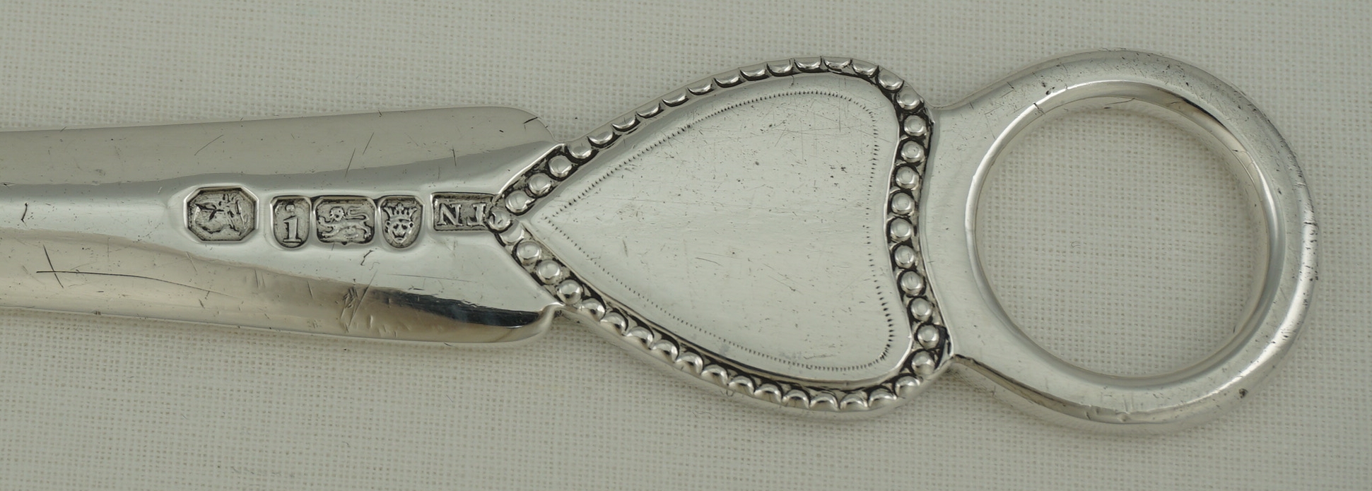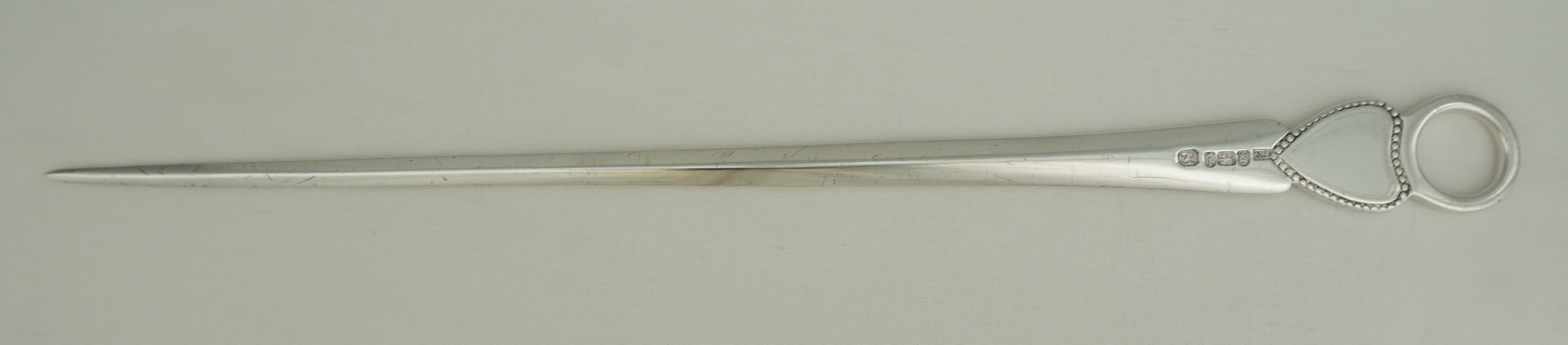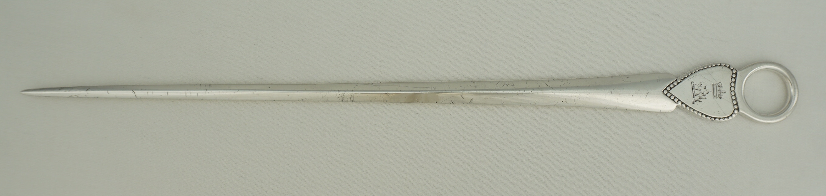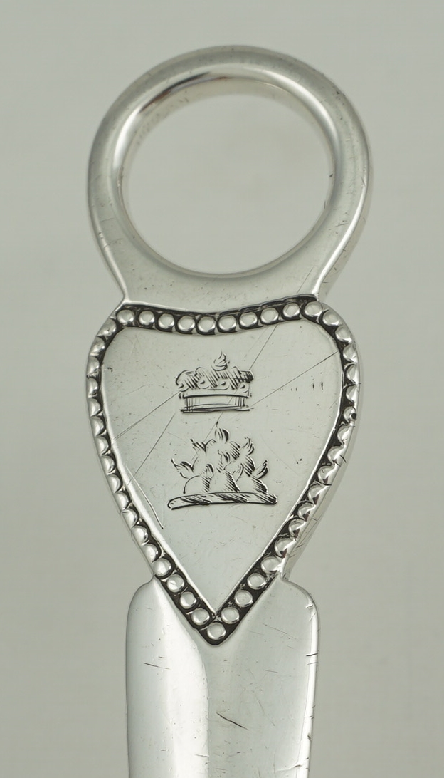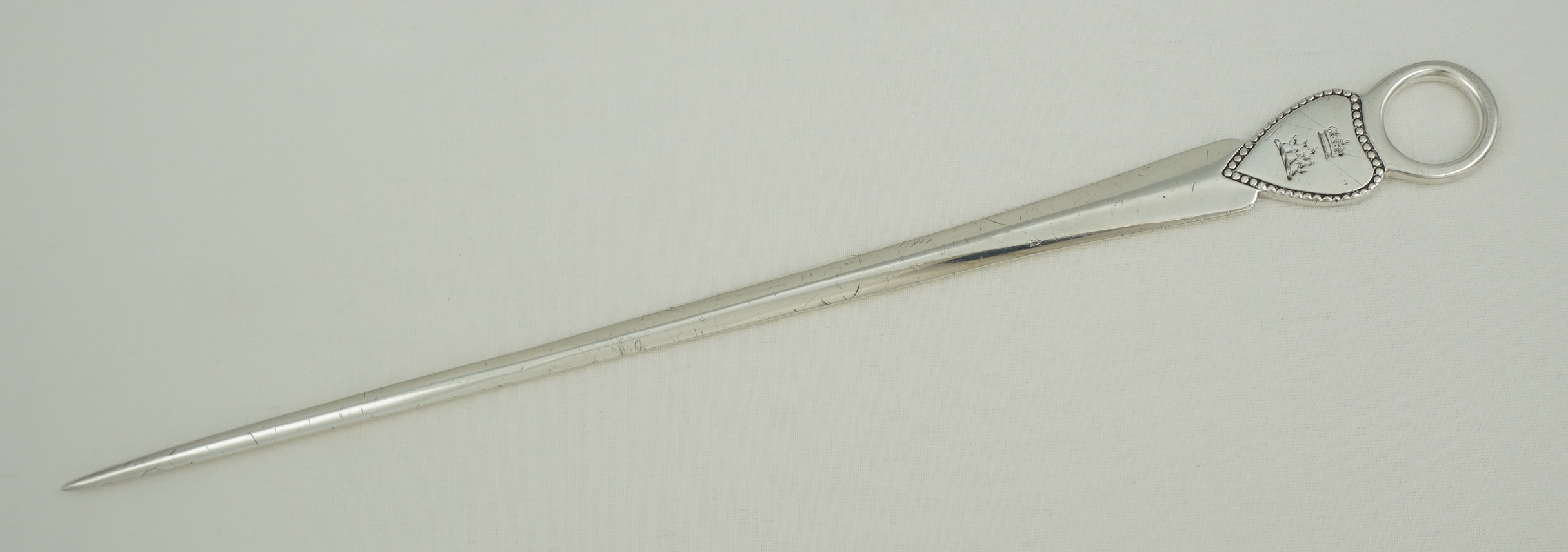 DESCRIPTION | Very unusual antique English Georgian solid sterling silver meat skewer with a Bead Edge heart form terminal engraved to one side with a crest below a Baron's Coronet and hallmarked with the scarce incuse duty mark. These items are used to ensure that the centres of large roasting joints are safely cooked. I have found that they can also reduce the cooking time by 20% so are energy saving too. |
