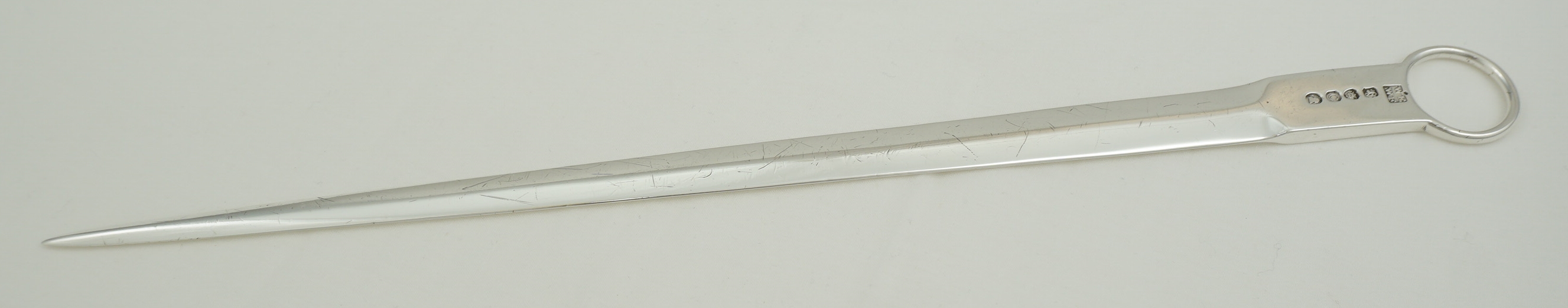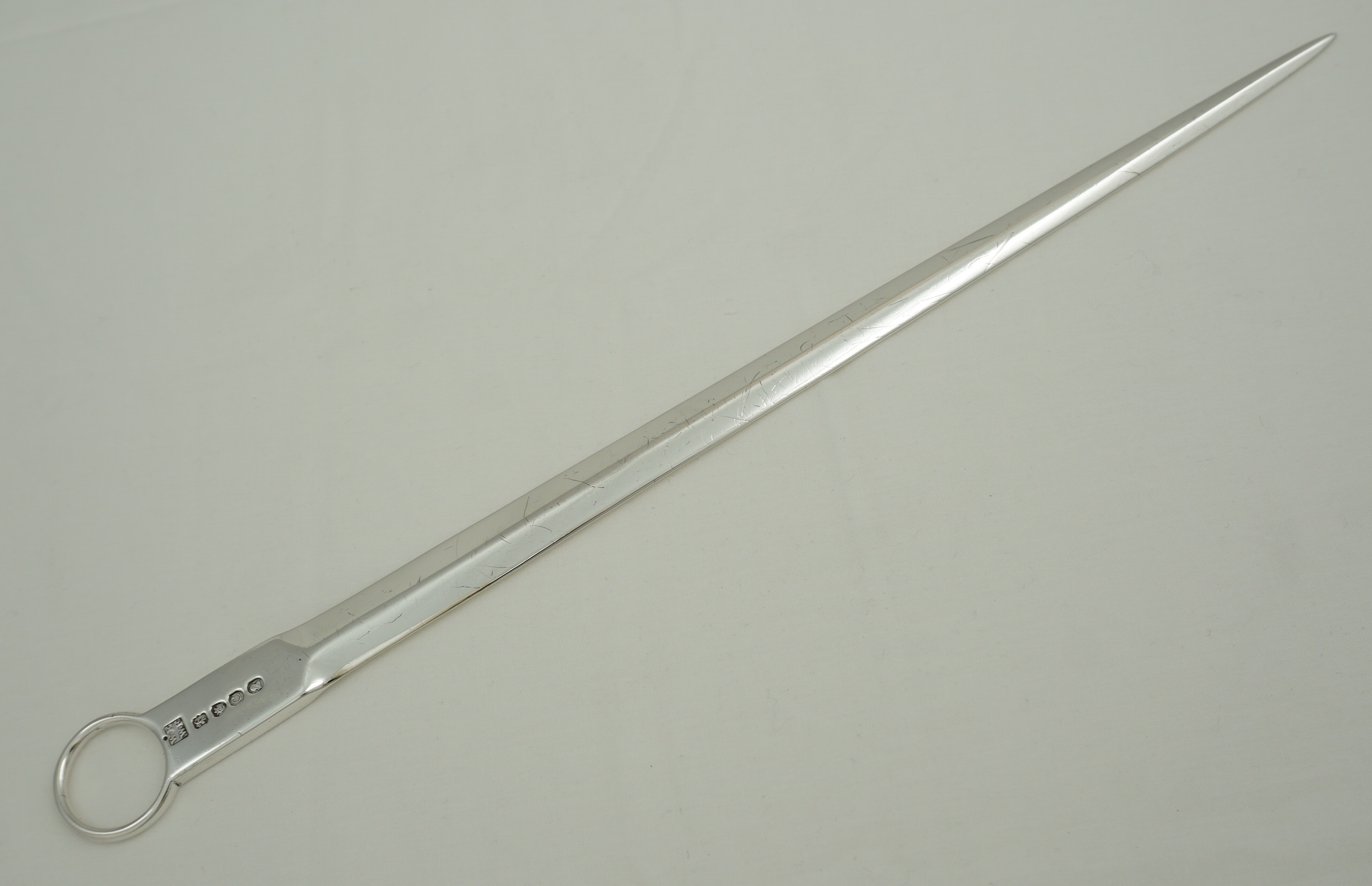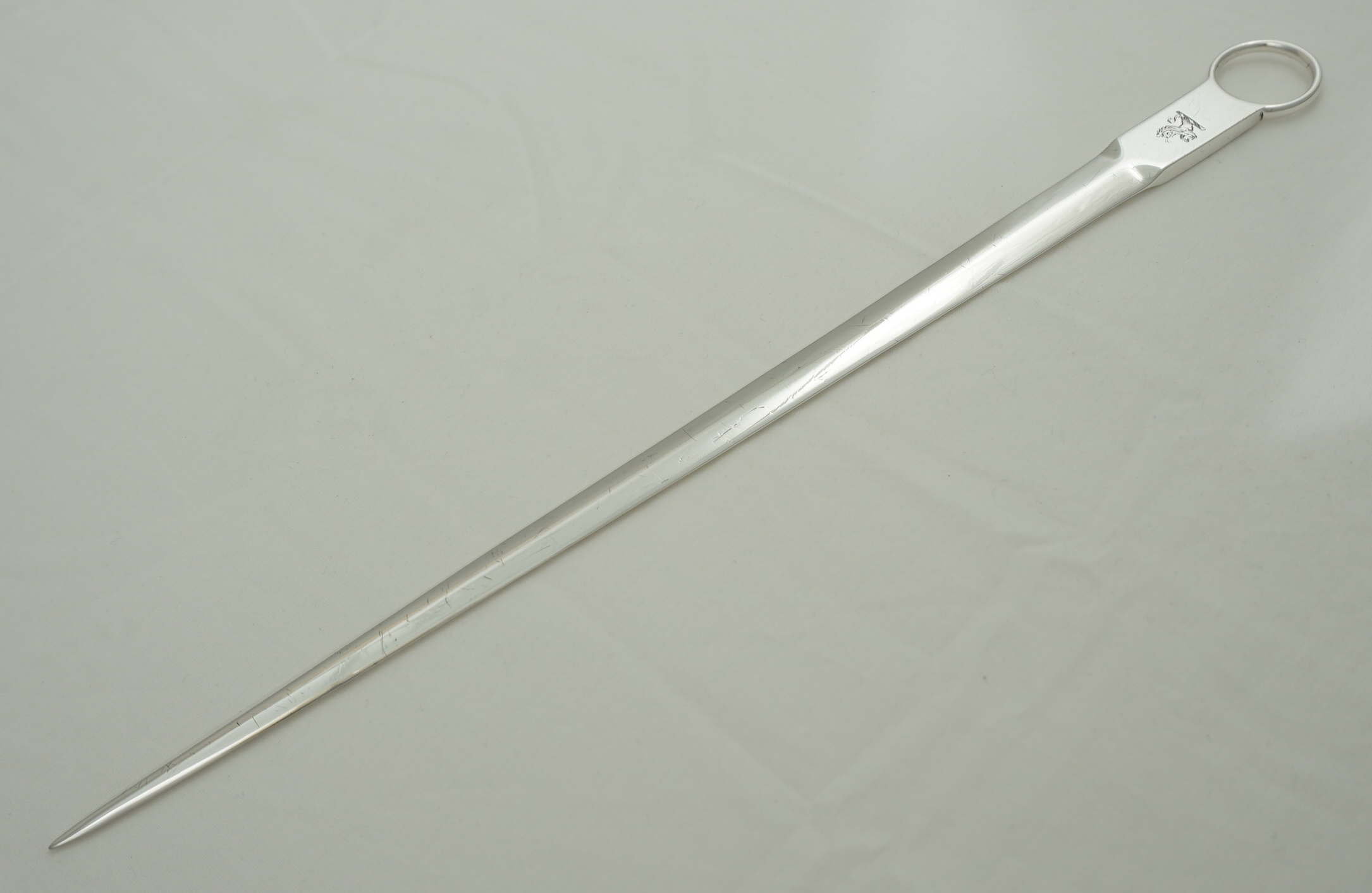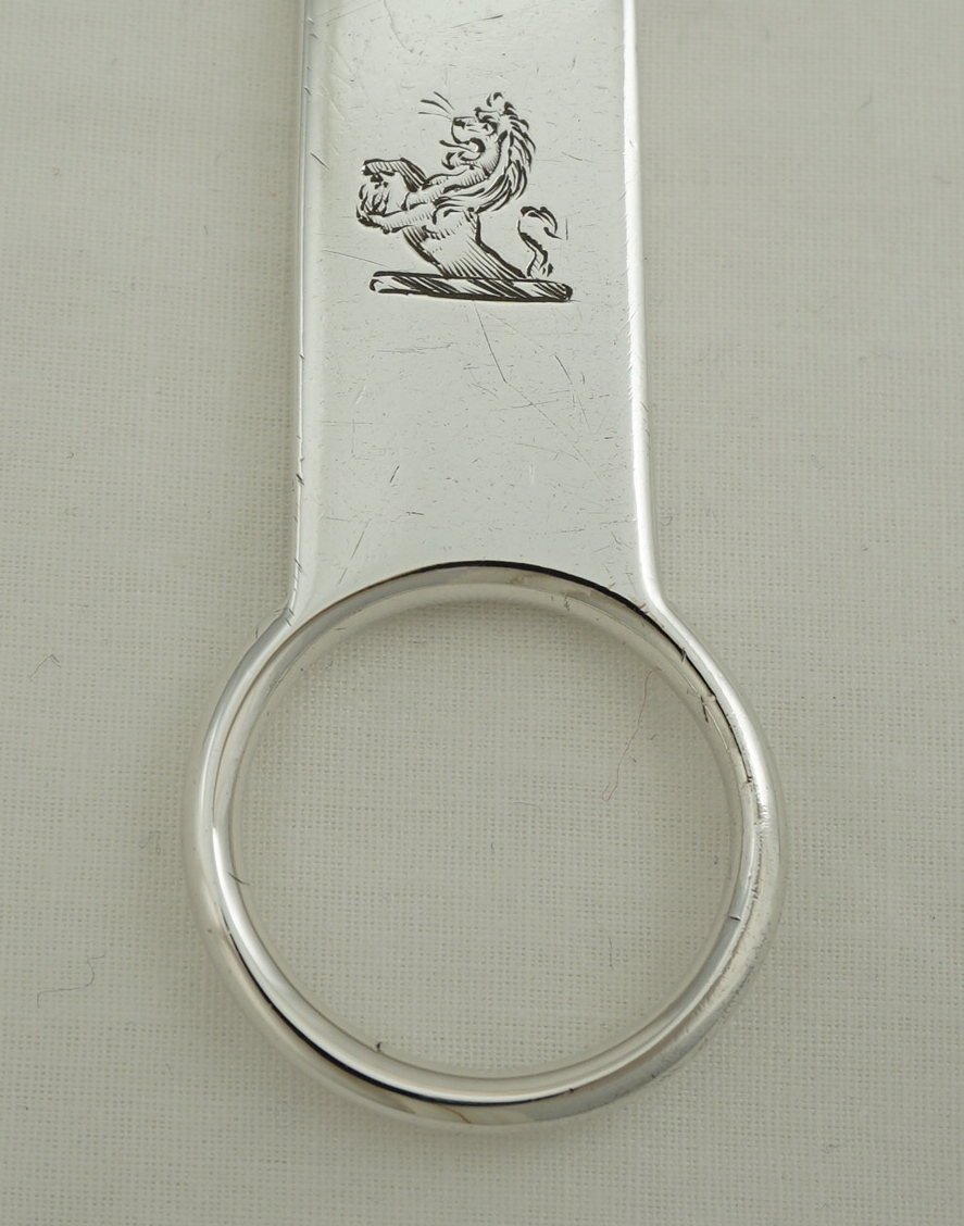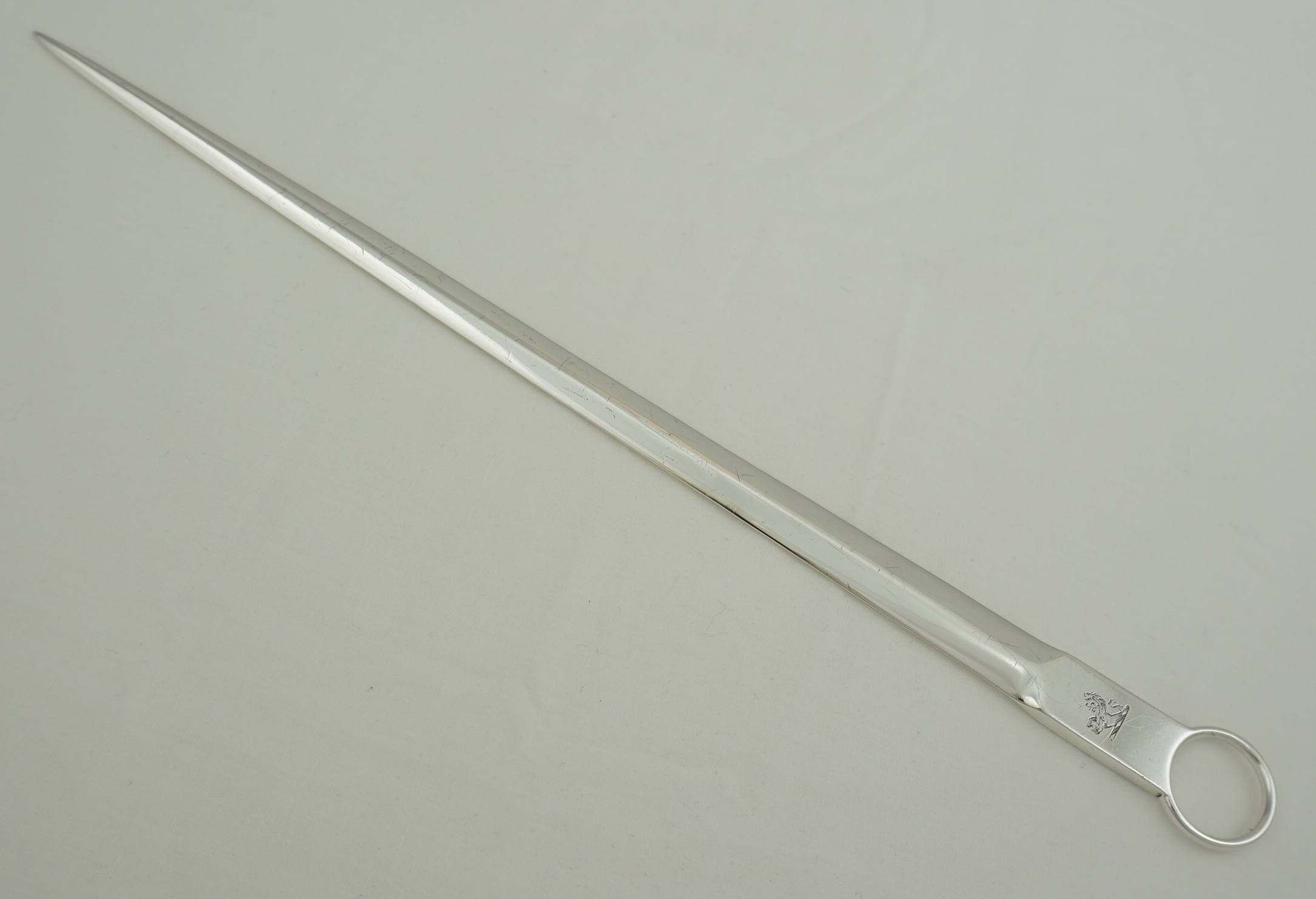 DESCRIPTION | Antique English Georgian solid sterling silver meat skewer with a good and original crest engraving to the terminal and a ring handle. These are used to ensure that the centres of large roasting joints are safely cooked. I have found that they can also reduce the cooking time by 20% so are energy saving too. |