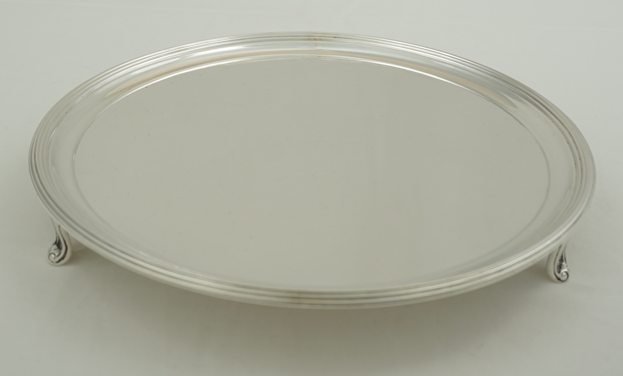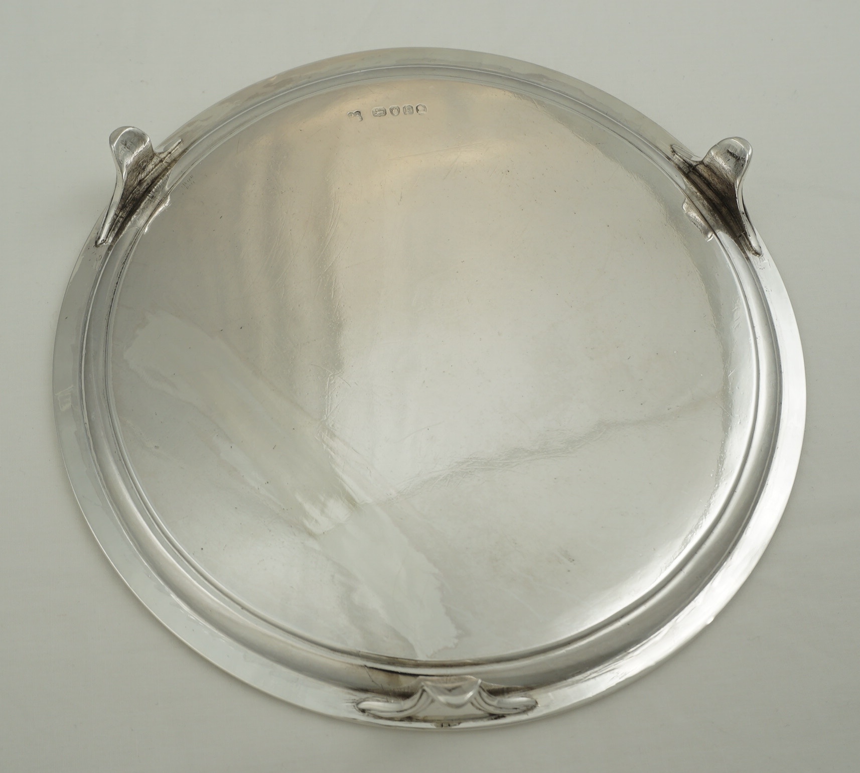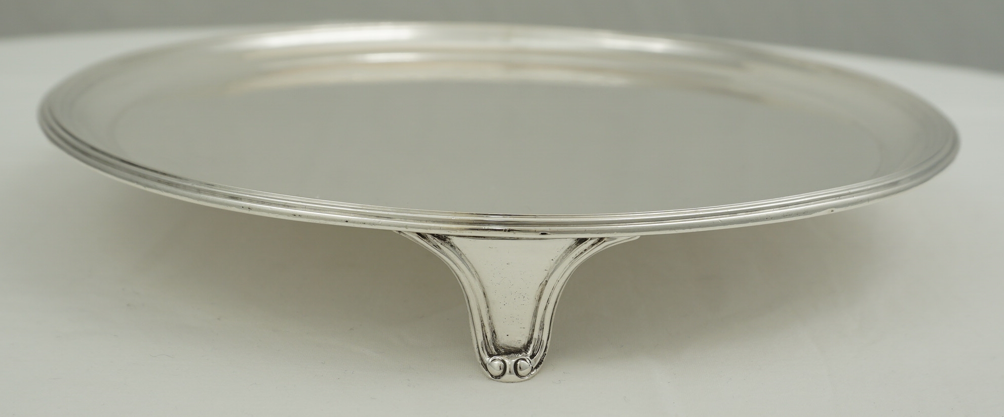 DESCRIPTION | Good antique English Georgian solid sterling silver salver on three scroll and thread feet and with no engraving or erasure. Nice feature is the original assayer's scrape still visible to the underneath. |