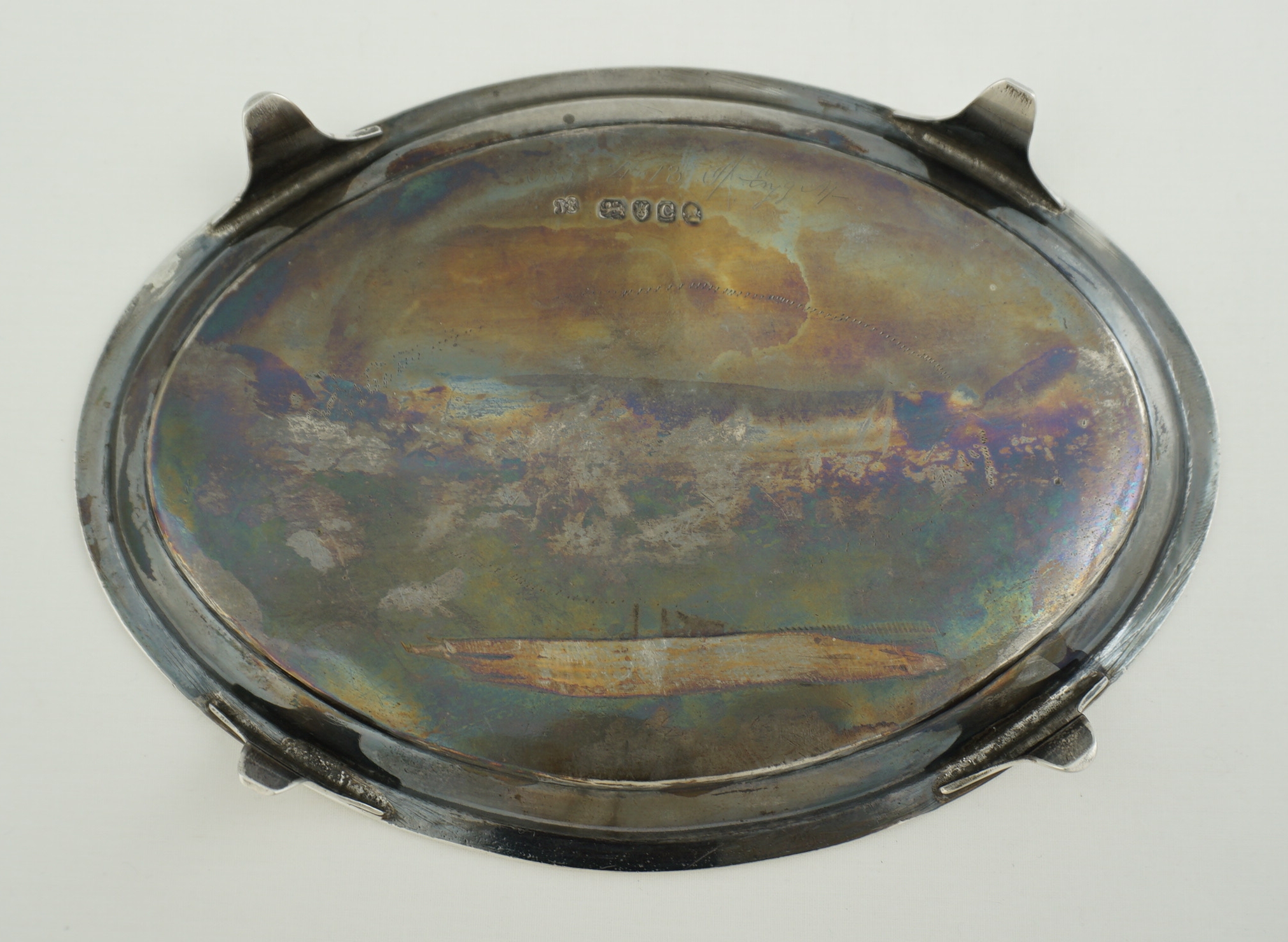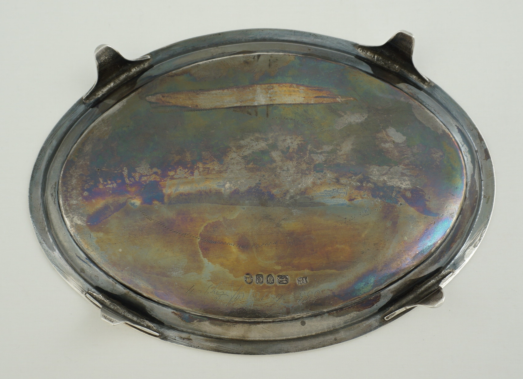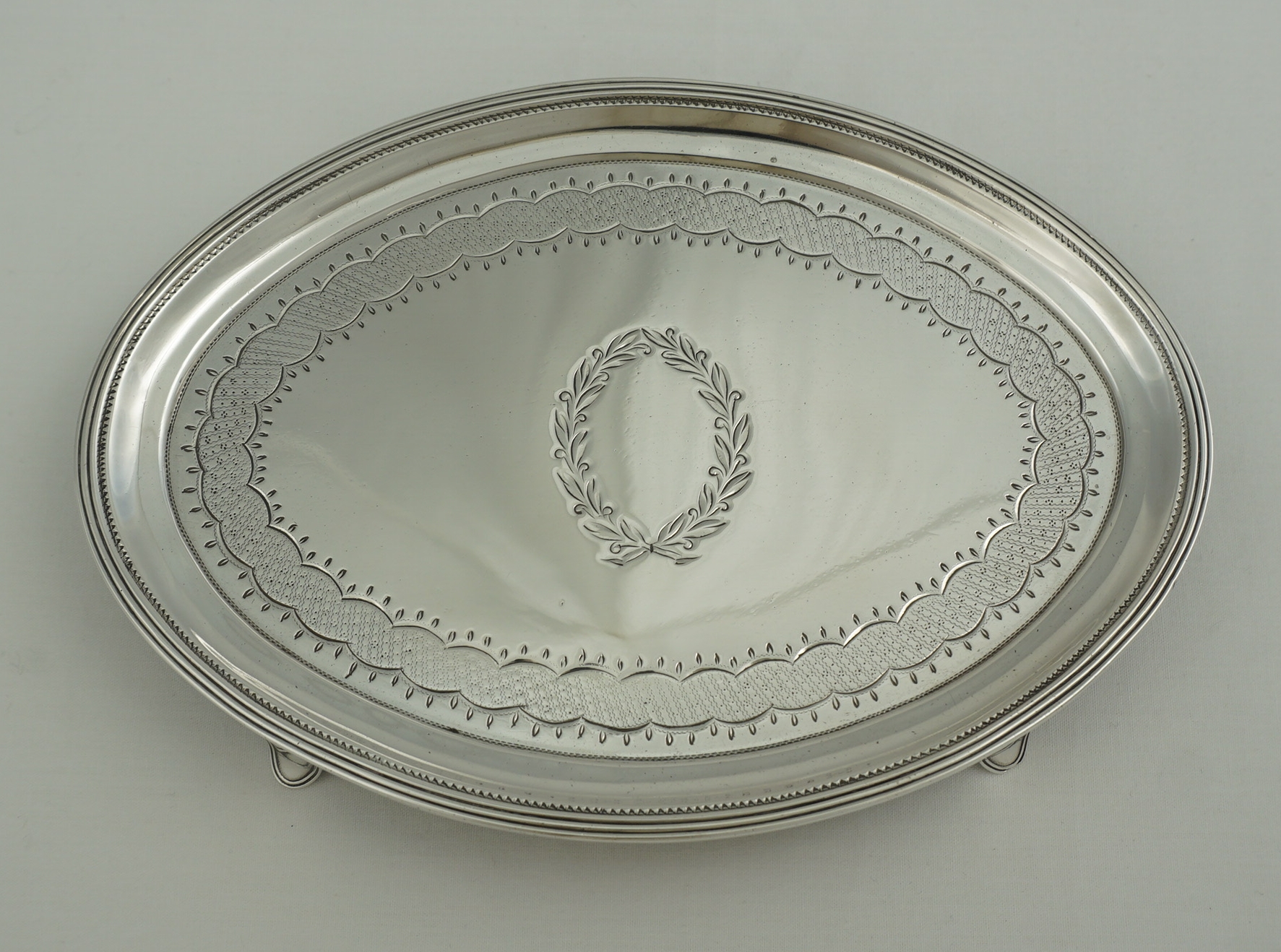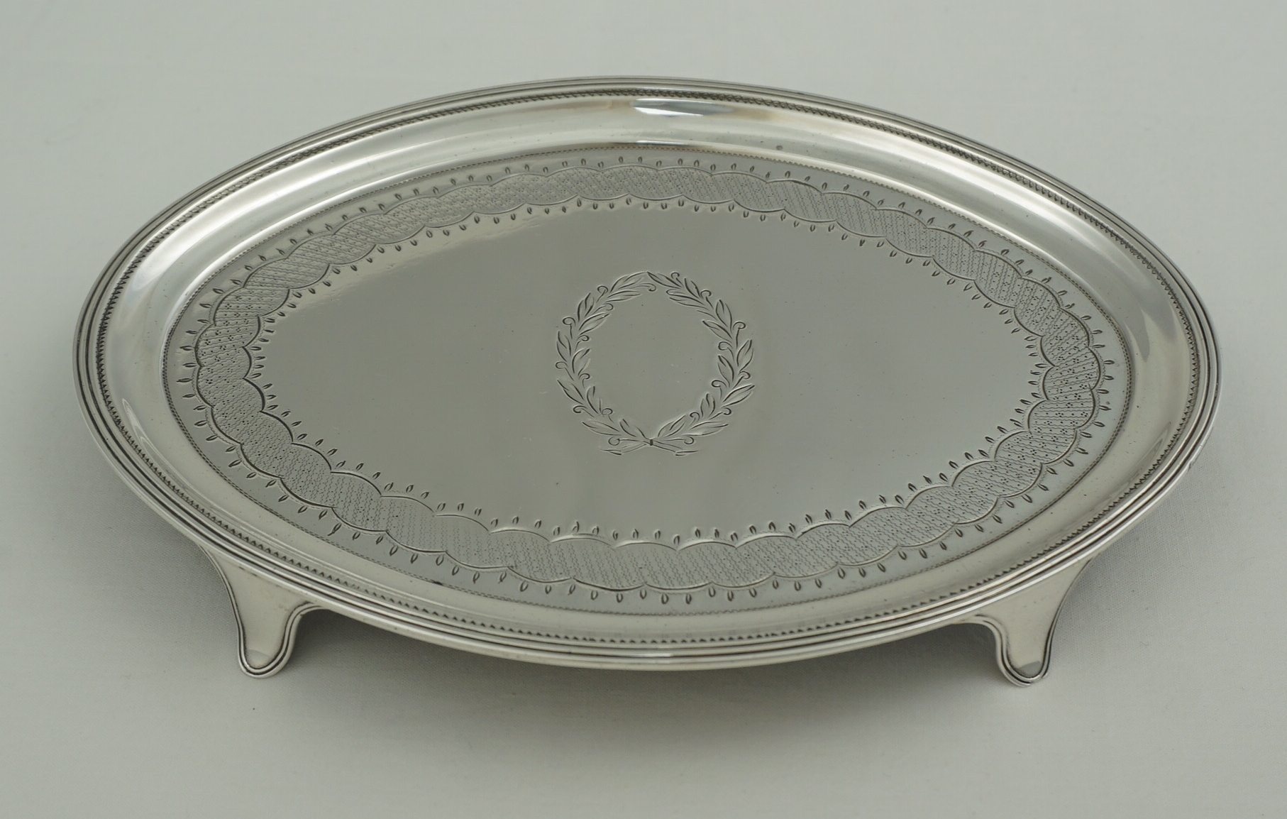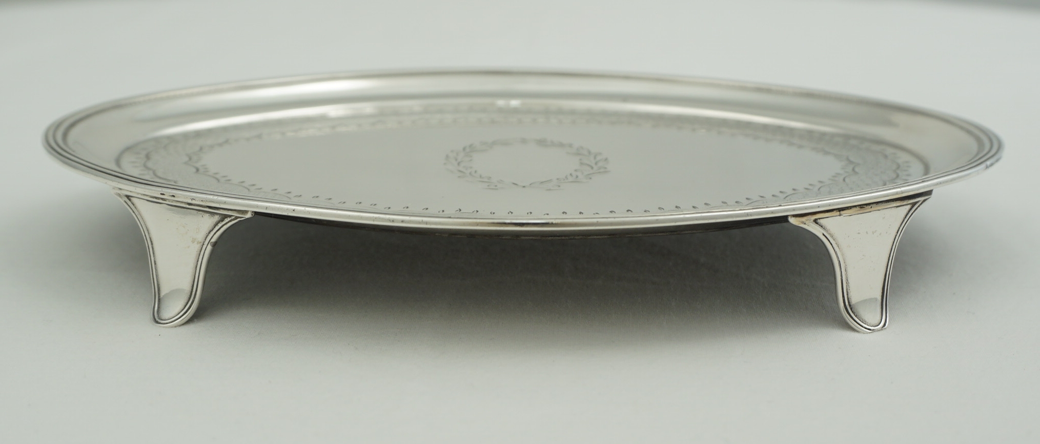 DESCRIPTION | Very good antique English Georgian solid sterling silver tea pot stand with bands of thread, bead and engraved decoration and a central laurel leaf cartouche that has never been engraved or erased. The underside I have left patinated and nicely displaying the original assayer's scrape. There are some later dealers' scratch markings that could easily be removed but not without harming the patination so I have left them in situ. Also there is a strange ellipse of very lightly engraved dashes that have no connection to the engravings on the top. Best guess here is that these are from a later mechanical engraving tool that was absent-mindedly played over the underside for no reason. Could be easily removed but, again, not without removing the patination. Quite interesting fact; these stands were made to hold the newly fashioned flat-bottomed and legless oval tea pots and protect your polished mahogany table. The tea pots were made for a couple of years before the someone thought to make the first stand. |