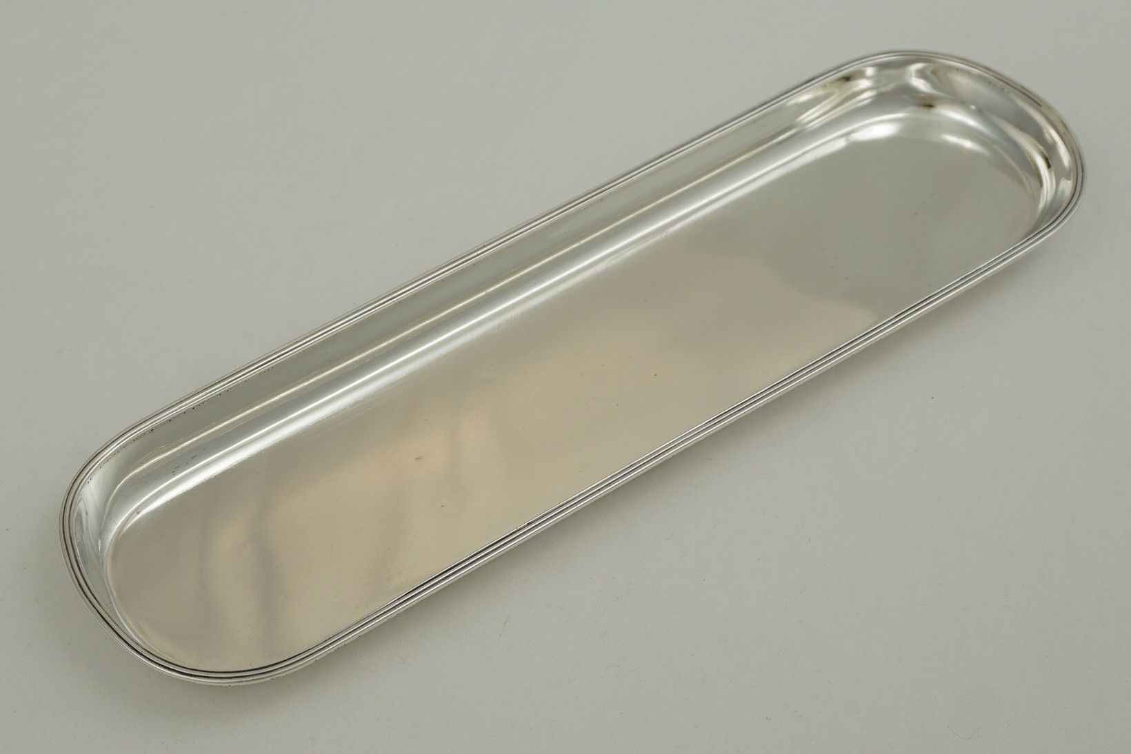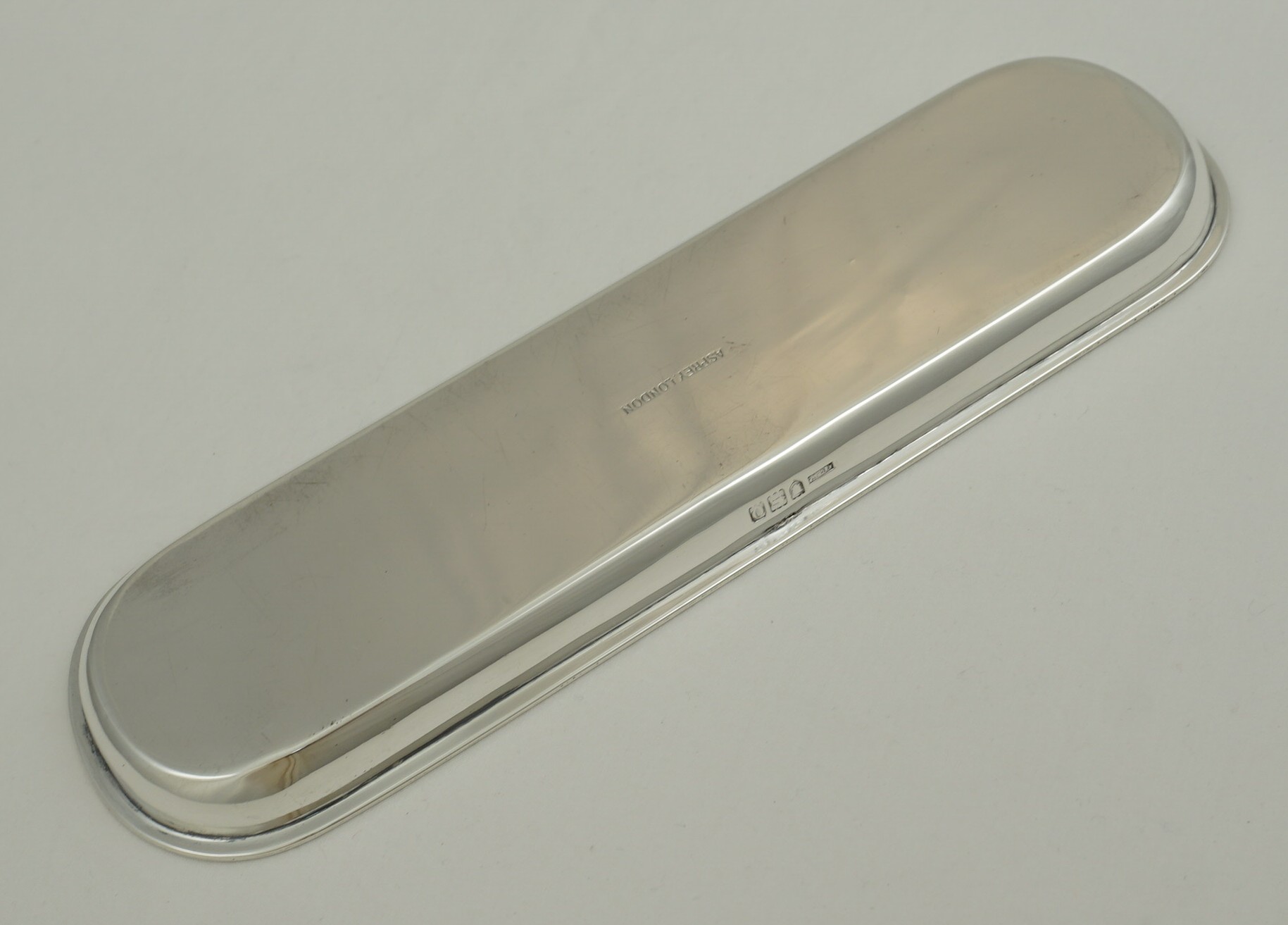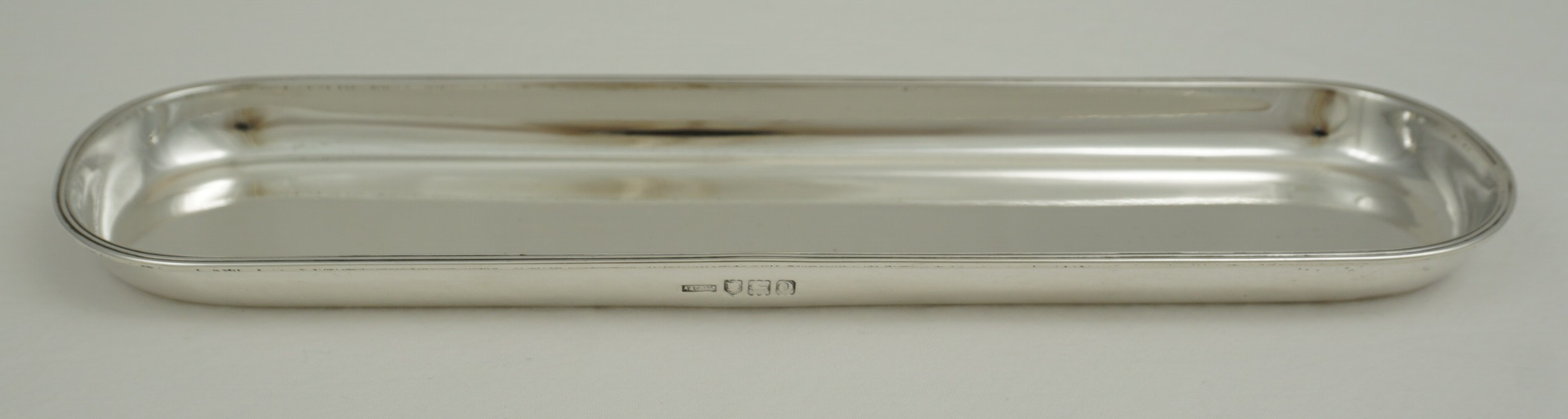 | DESCRIPTION | High quality antique English Edwardian solid sterling silver pen tray with thread decorated rim. |