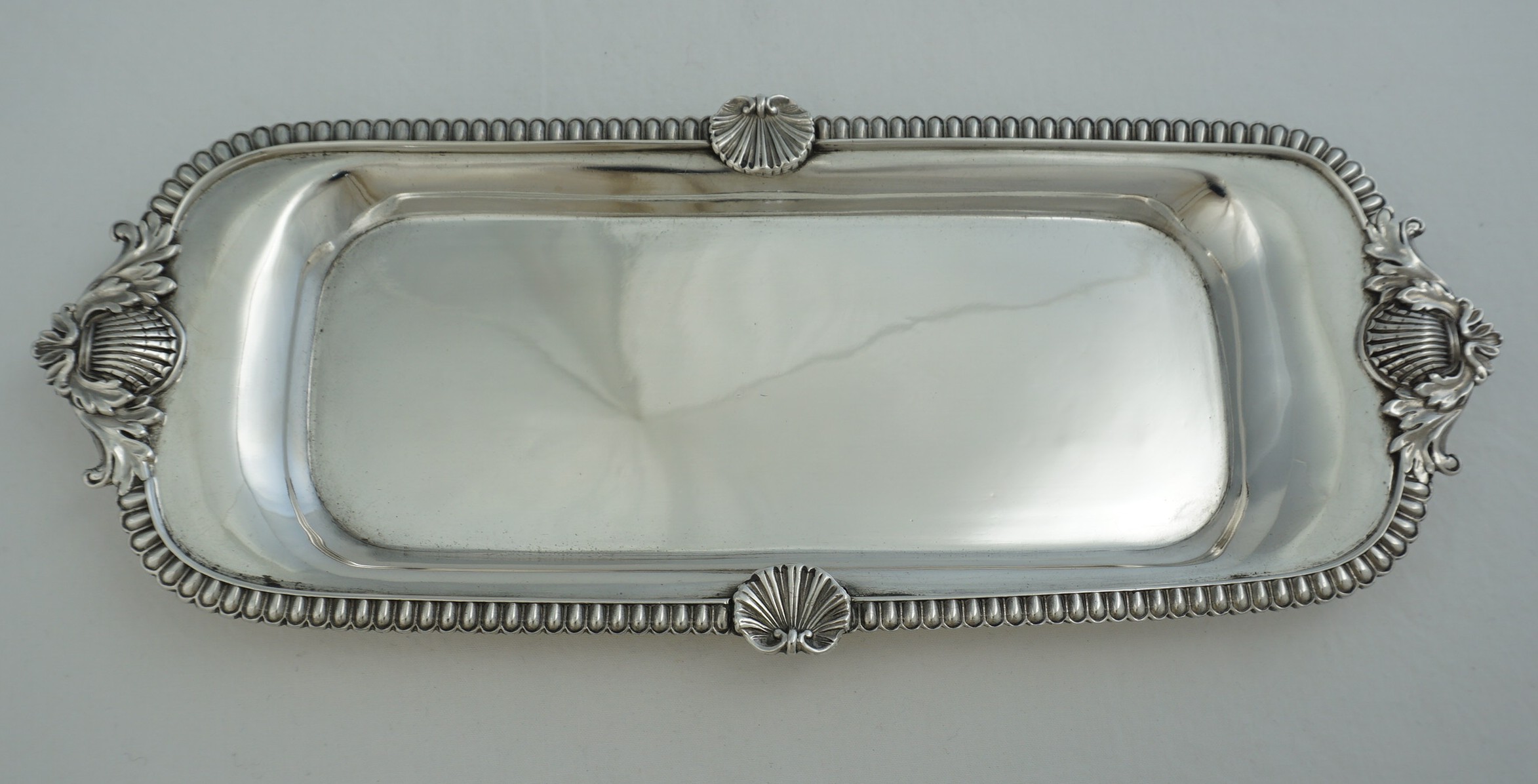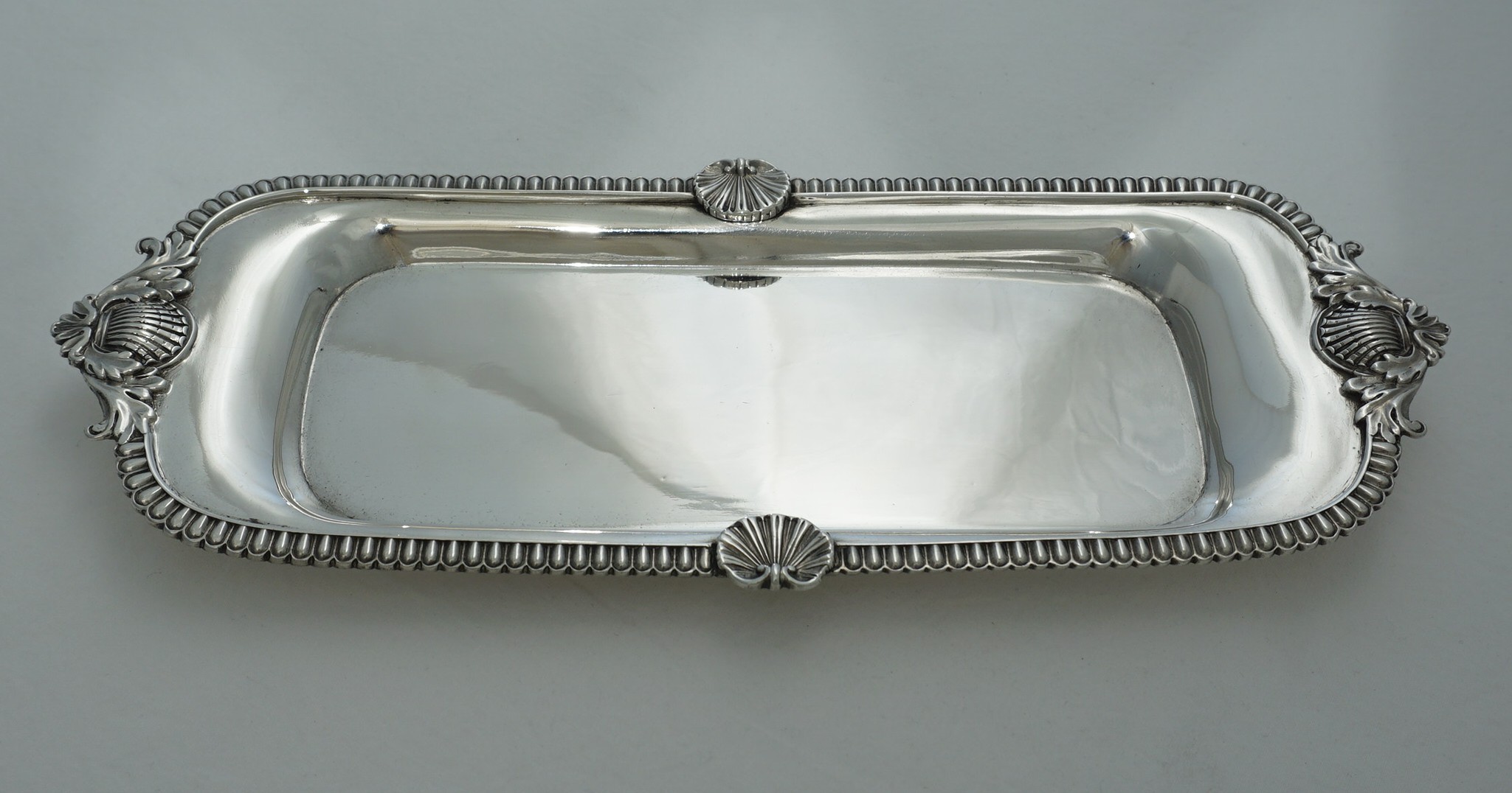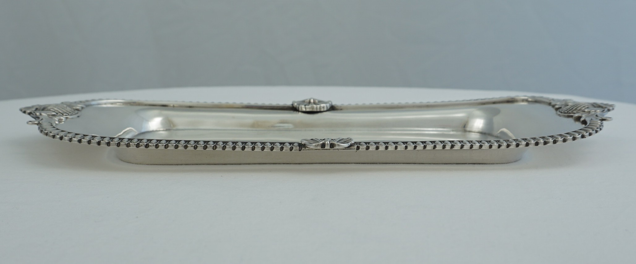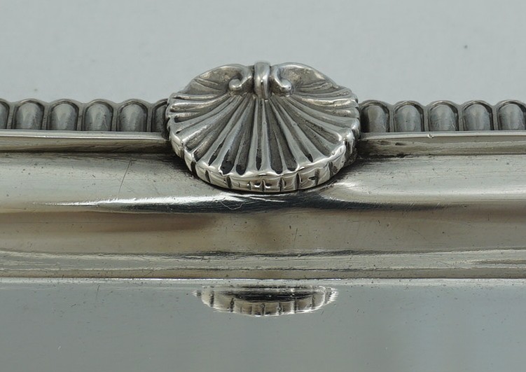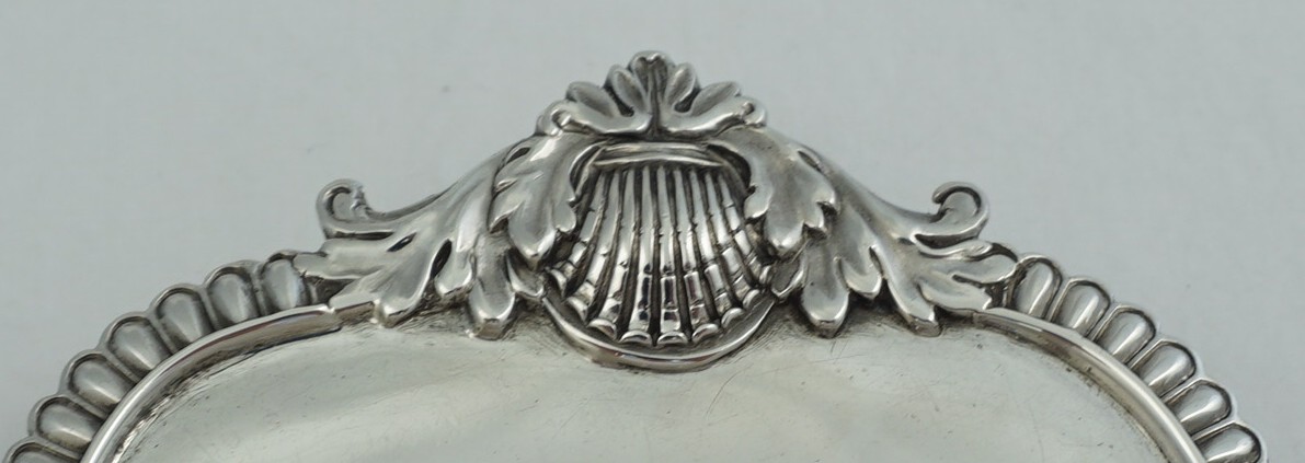 | DESCRIPTION | Superb quality antique English Georgian solid sterling silver snuffer's tray with gadroon and shell decoration. |