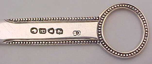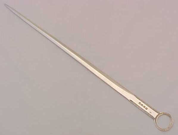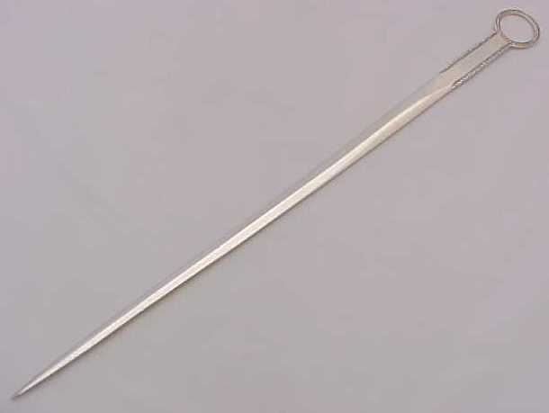 Long Victorian silver meat skewer with a thread and bead bordered ring handle. |