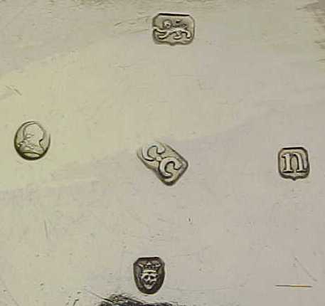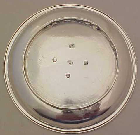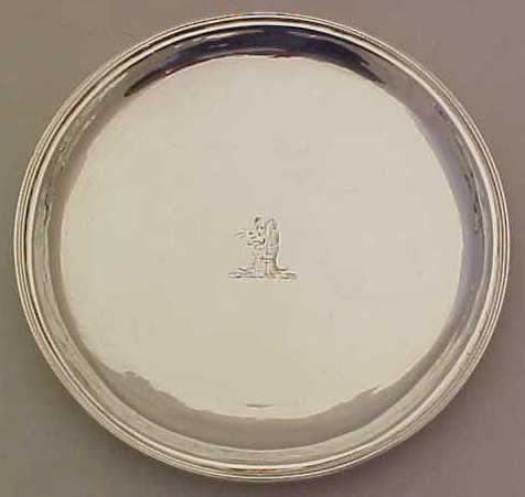 Crested Georgian silver counter dish with a threaded foot rim. |