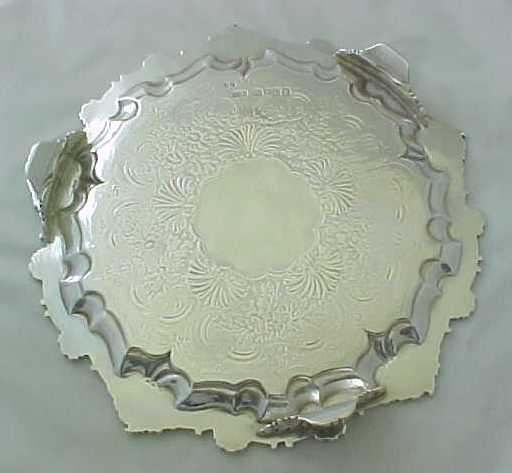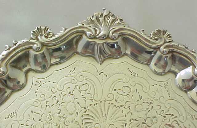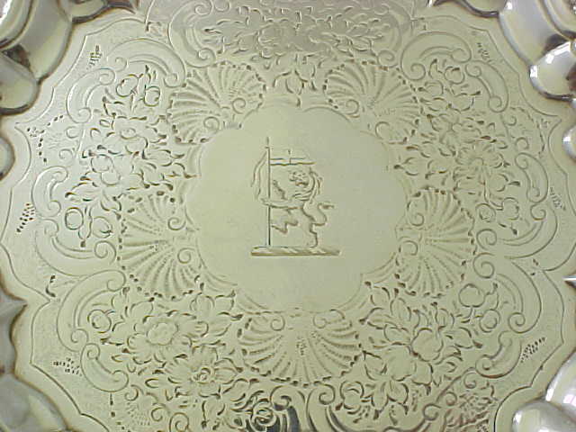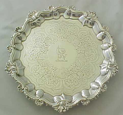 Hefty William IV silver salver with a shell and scroll border, flat-chasing and an engraved central crest. |