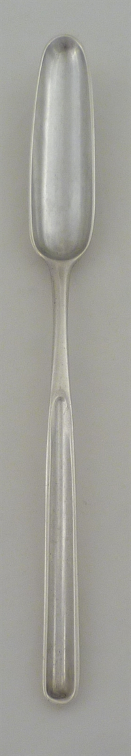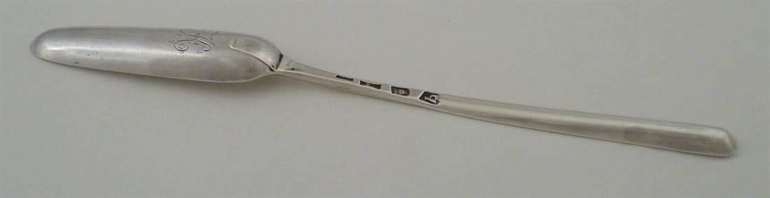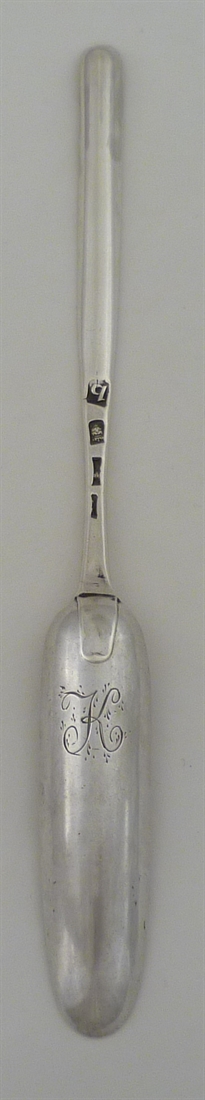 DESCRIPTION | Good Georgian solid silver marrow scoop with a long drop and monogram engraving to the back of the beef bowl. |