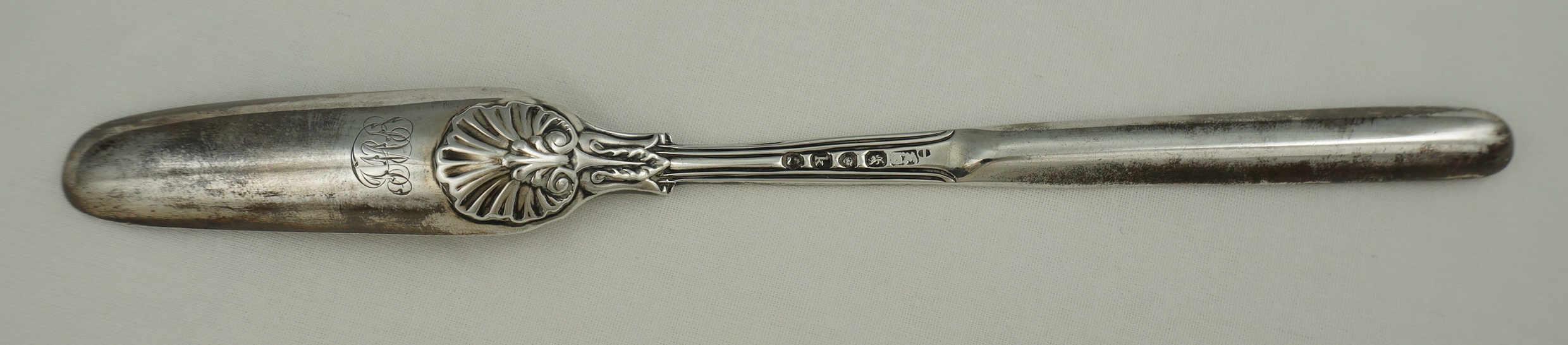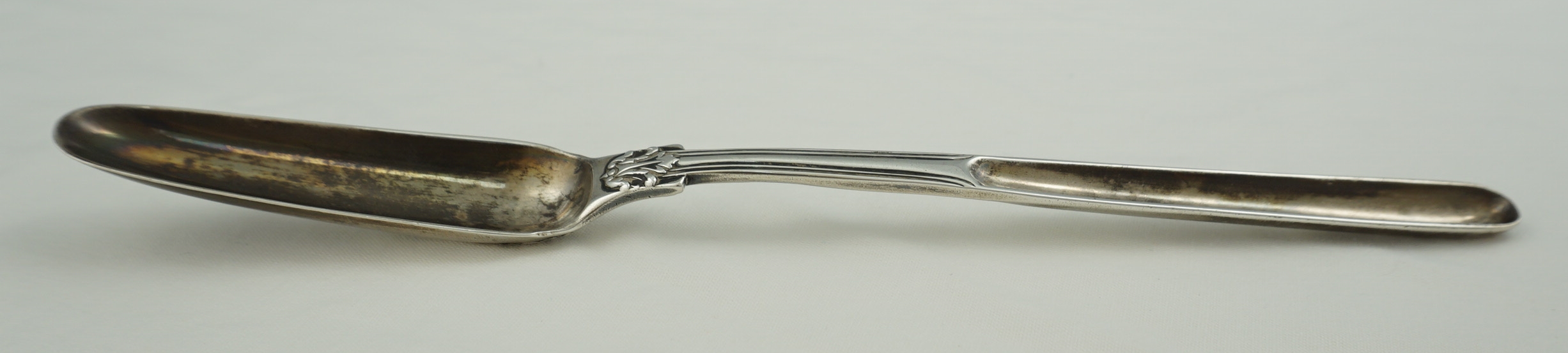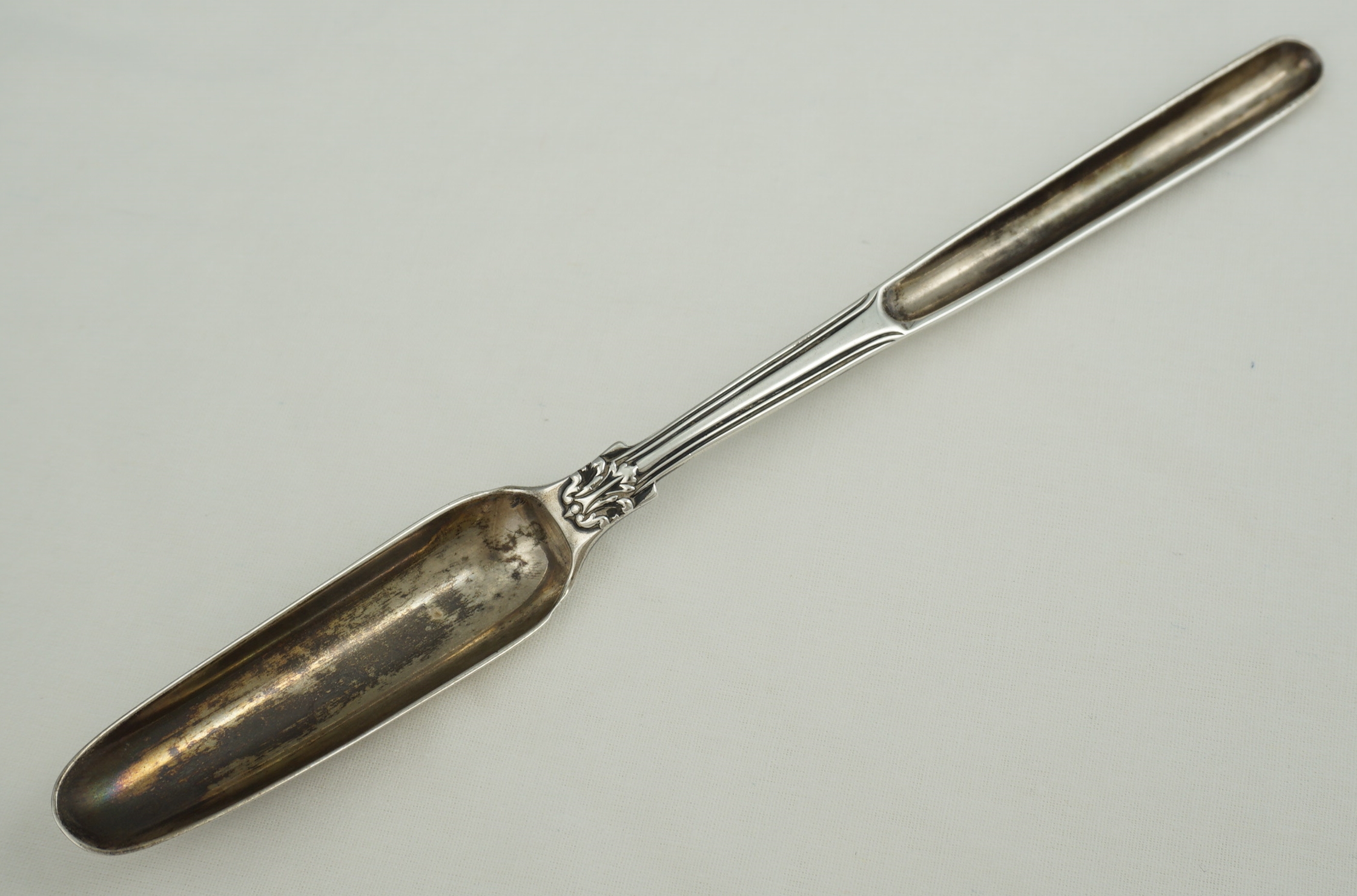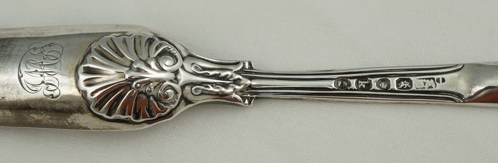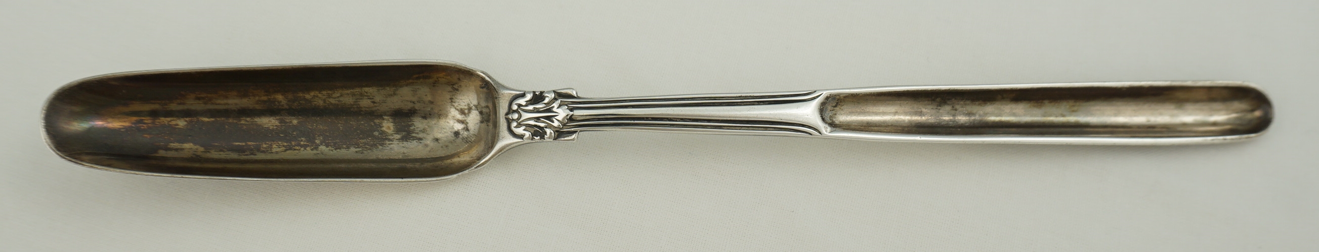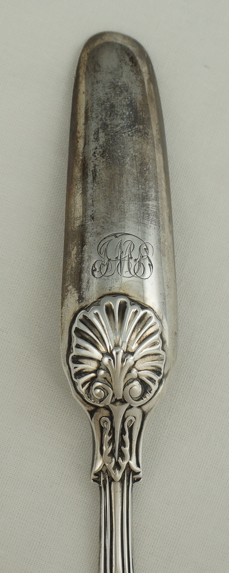 DESCRIPTION | English Georgian solid sterling silver marrow scoop in the extremely scarce Fiddle Husk or Husk Shell with husk heel pattern. Original monogram to the beef bowl. Yellow within both bowls hints at gilding but strong patination can also cause that appearance too so I reserve my judgement. |