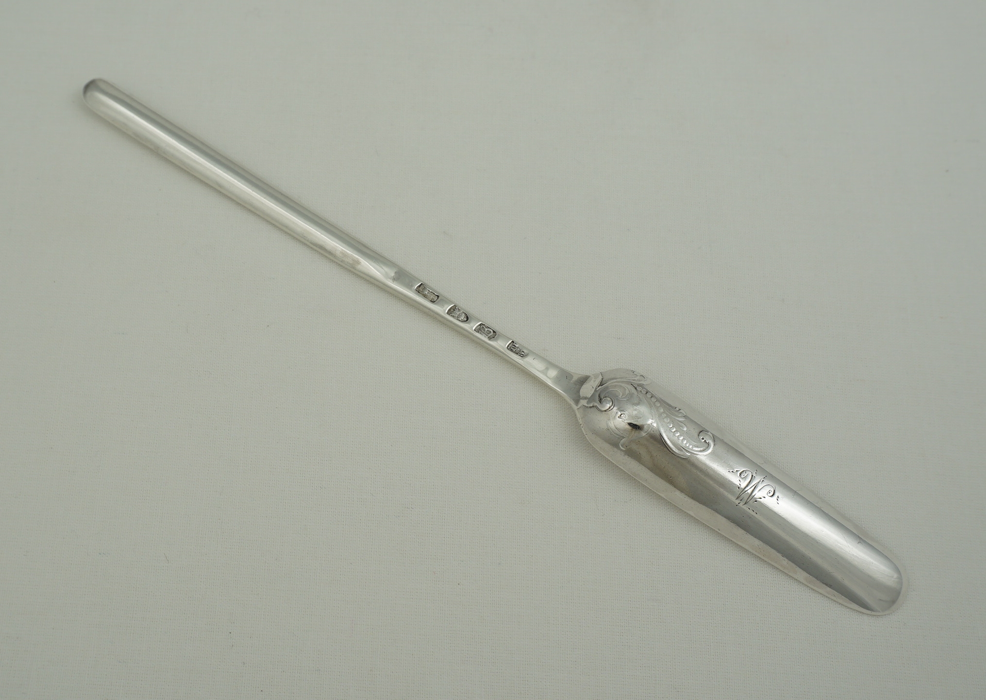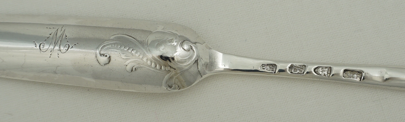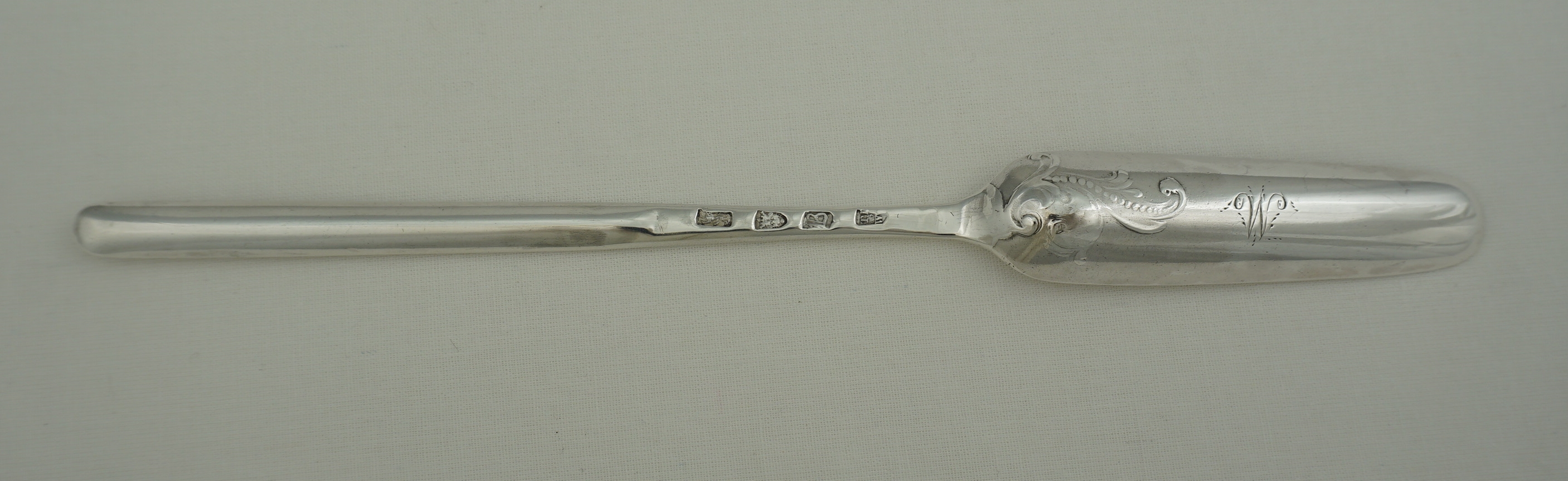 DESCRIPTION | Rare Georgian solid sterling silver marrow scoop with a fancy back beef bowl also engraved 'W'. Fancy back spoons of this period can still be found but a marrow scoop is rare. I think this is the first example that I have seen outside a reference book. The metal to the bowl around the fancy is extra thick and there is not even a hint of the fancy pattern within the bowl so we can be certain that this is a genuine George II example and not later decorated. The initial engraving is the original and from the period. Beautifully well struck and preserved hallmarks except for the maker's which is a little off-centre. |