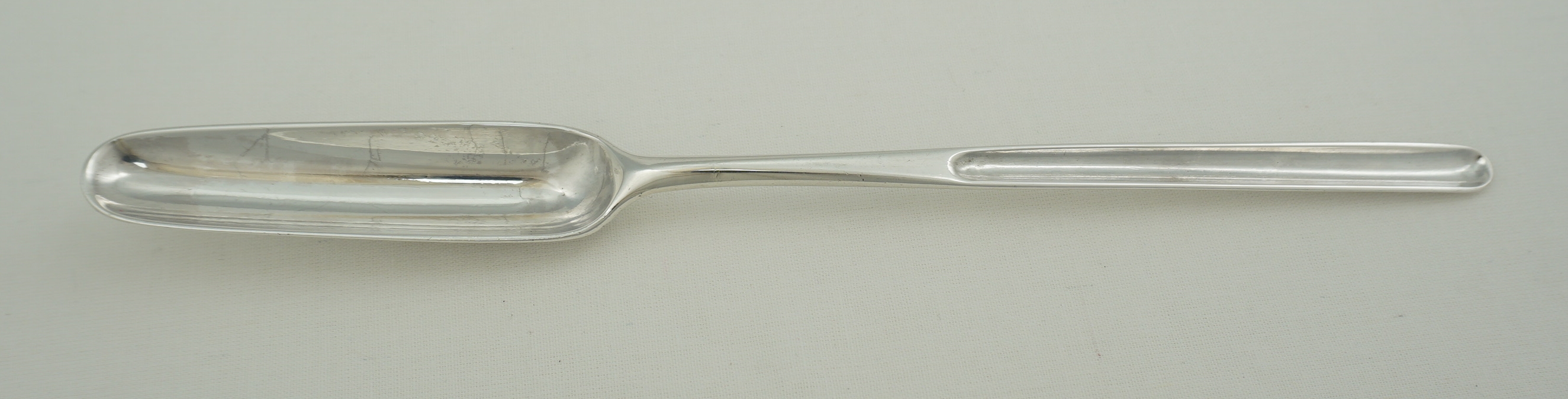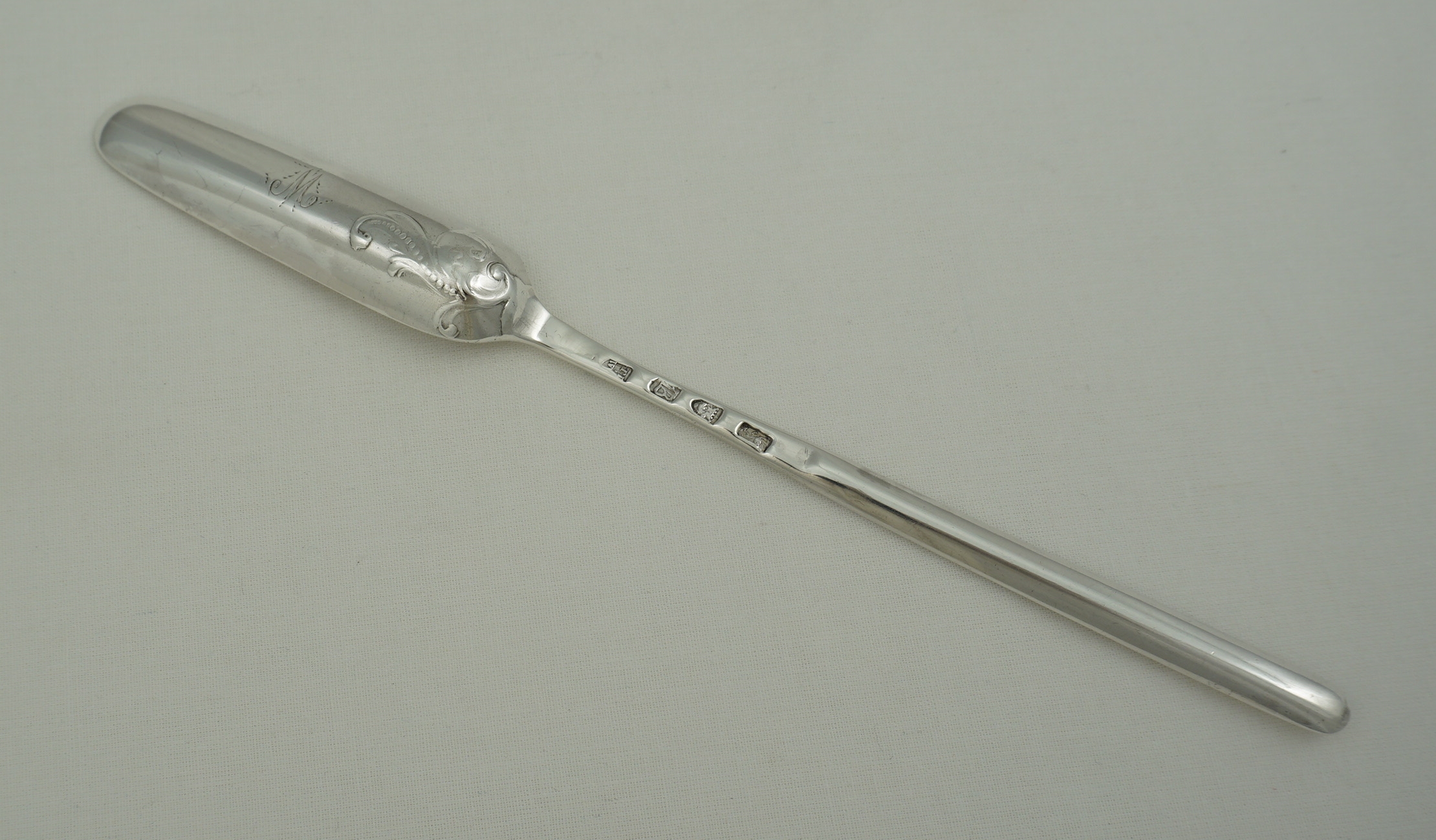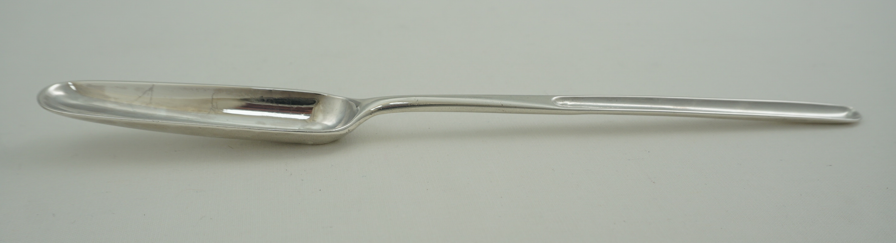 DESCRIPTION | Rare Georgian solid sterling silver marrow scoop with a fancy back beef bowl also engraved 'W'. Fancy back spoons of this period can still be found but a marrow scoop is rare. I think this is the first example that I have seen outside a reference book. The metal to the bowl around the fancy is extra thick and there is not even a hint of the fancy pattern within the bowl so we can be certain that this is a genuine George II example and not later decorated. The initial engraving is the original and from the period. Beautifully well struck and preserved hallmarks except for the maker's which is a little off-centre. |