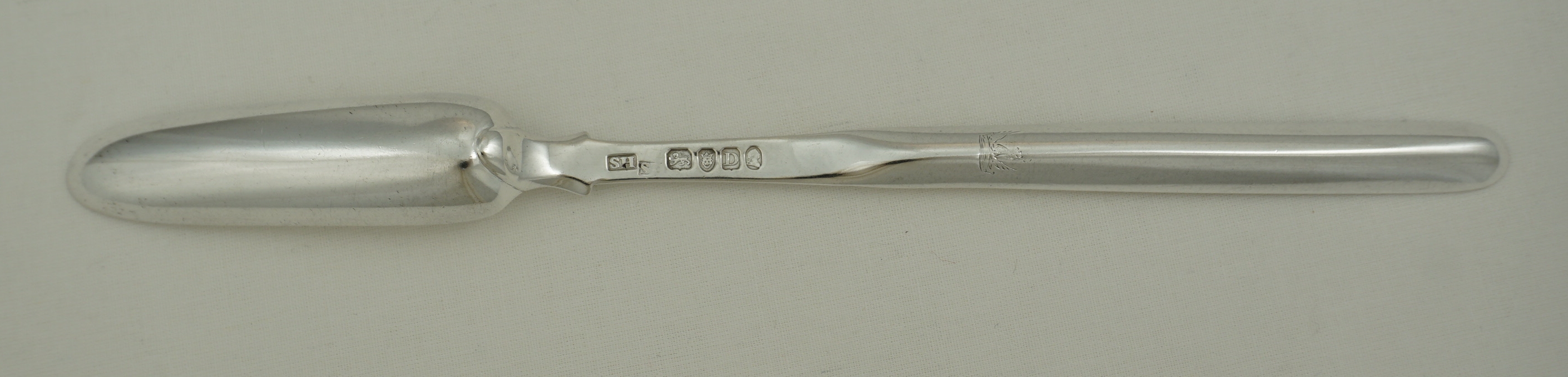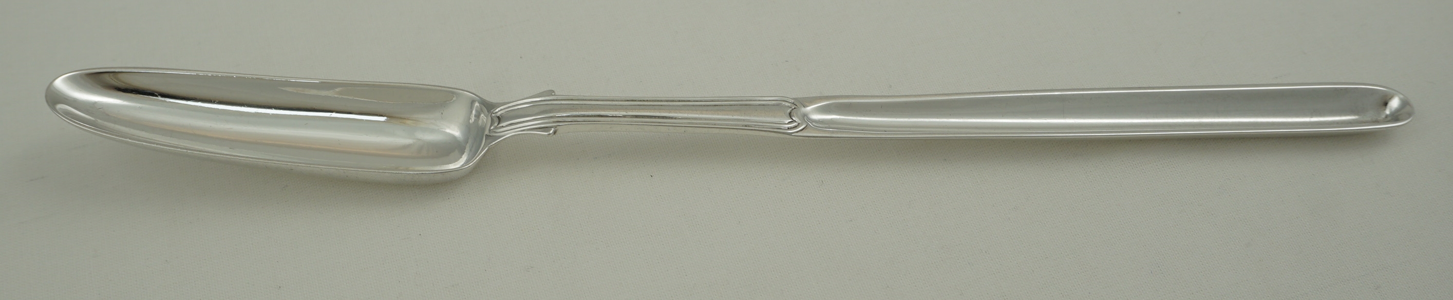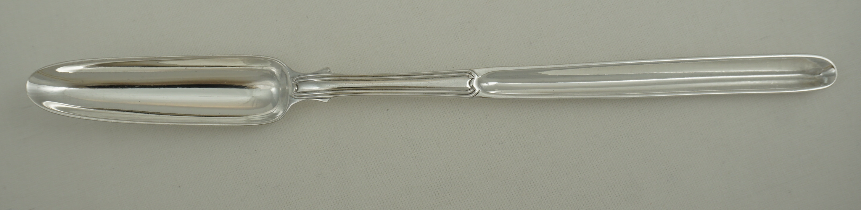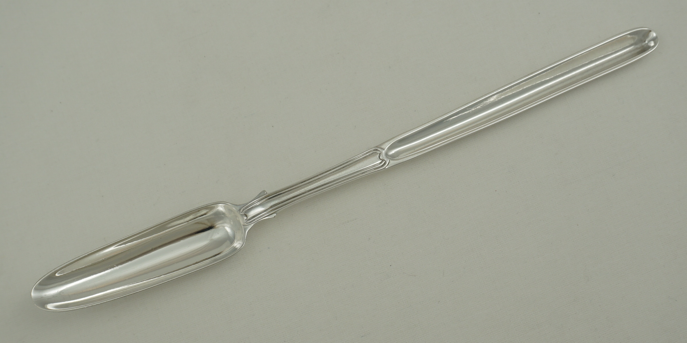 DESCRIPTION | Good and large English Georgian solid sterling silver marrow scoop with shoulders and thread decoration. Discreet crest engraving to the back of the lamb bowl. |