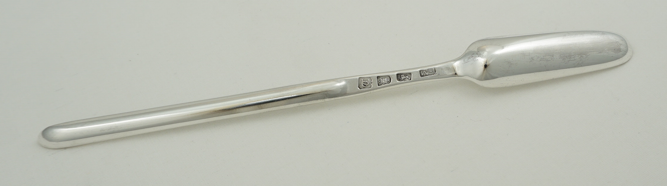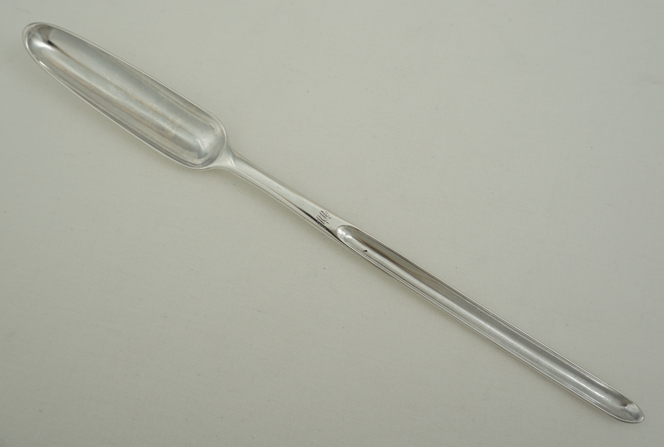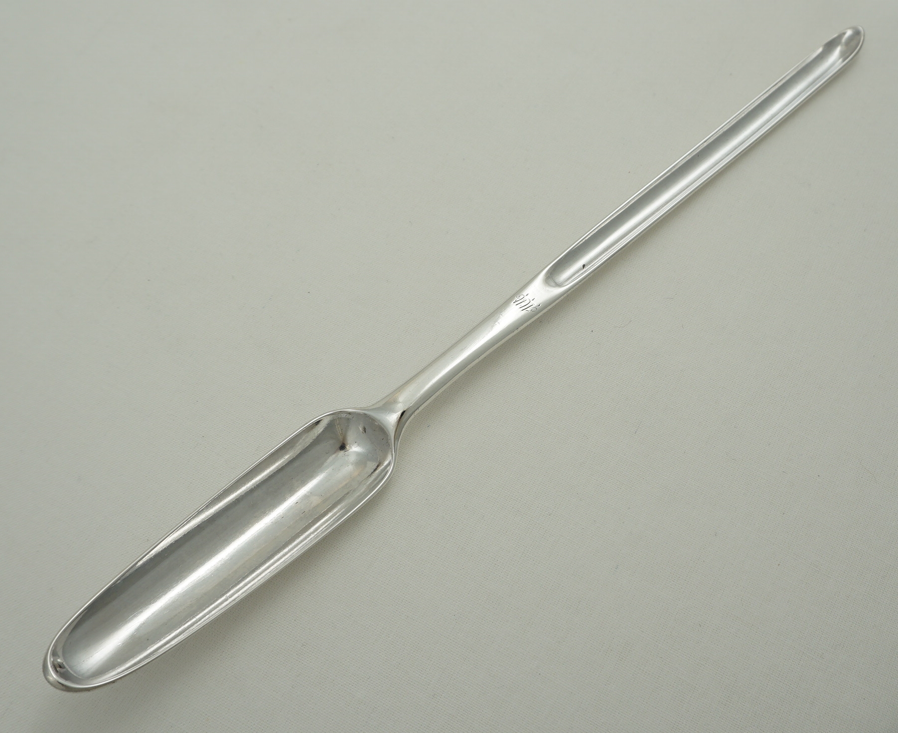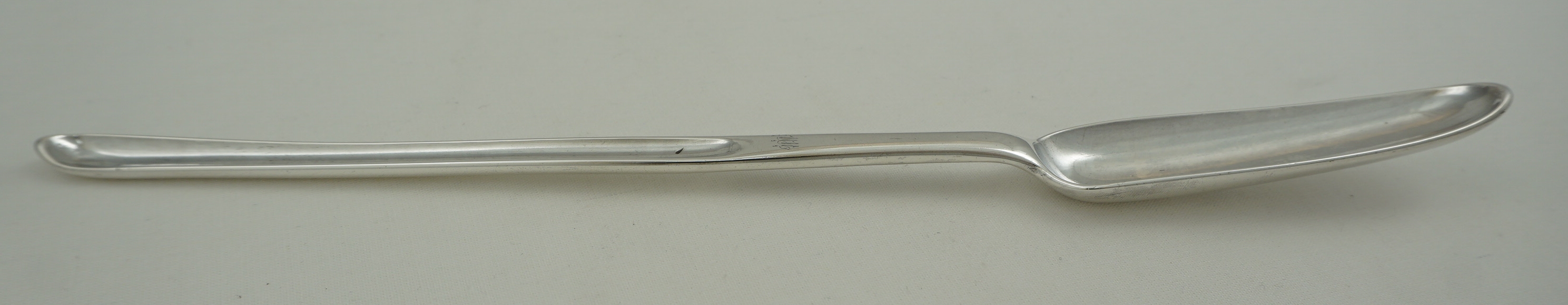 DESCRIPTION | Large, heavy and unusual English Georgian solid sterling silver marrow scoop with a discreet 'WW' monogram to the front of the stem. Both bowl tips are upturned. This is not wear and appears to be a deliberate feature that I have not seen before. |