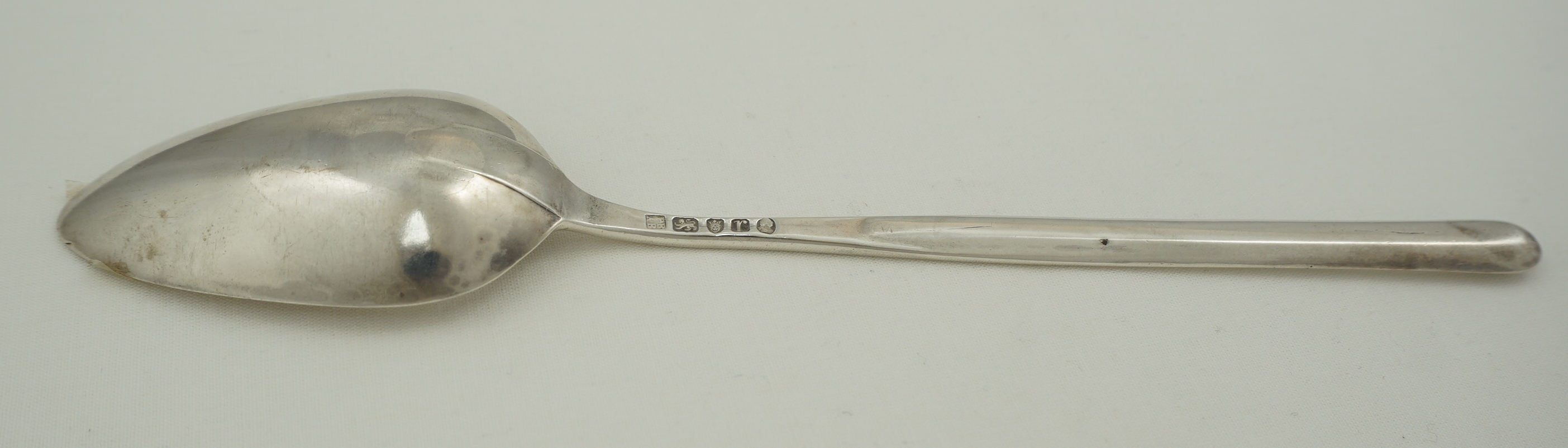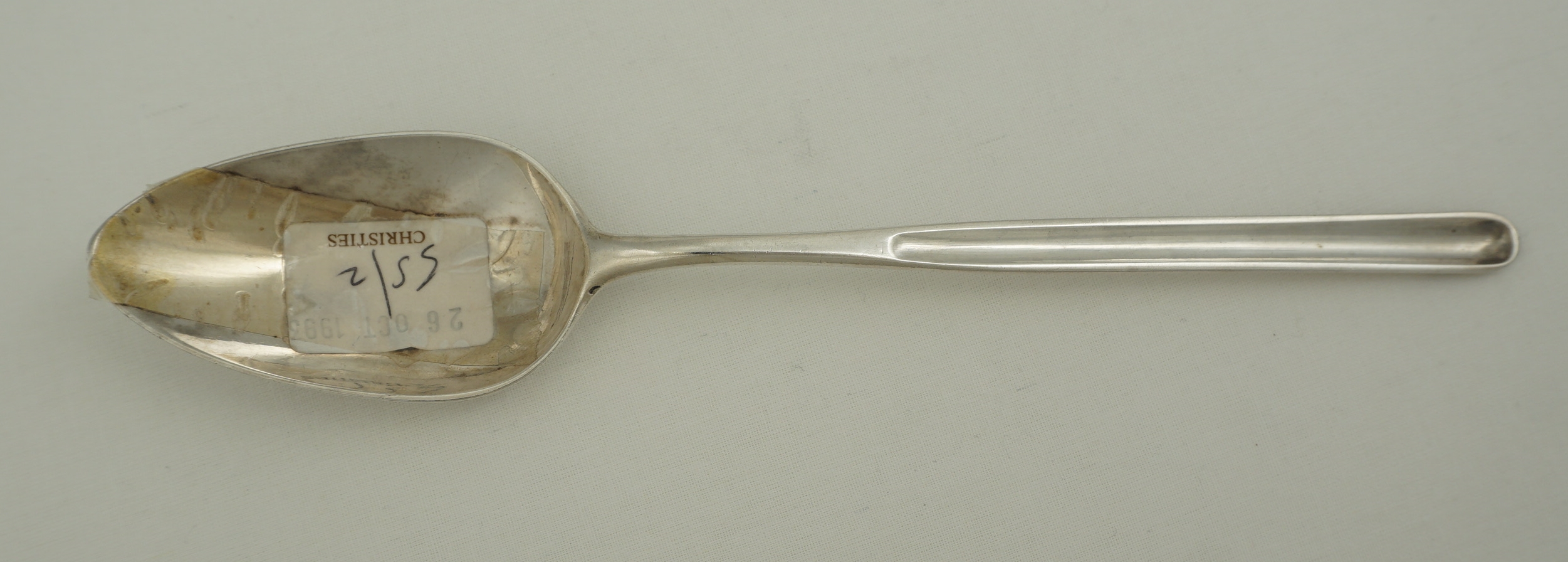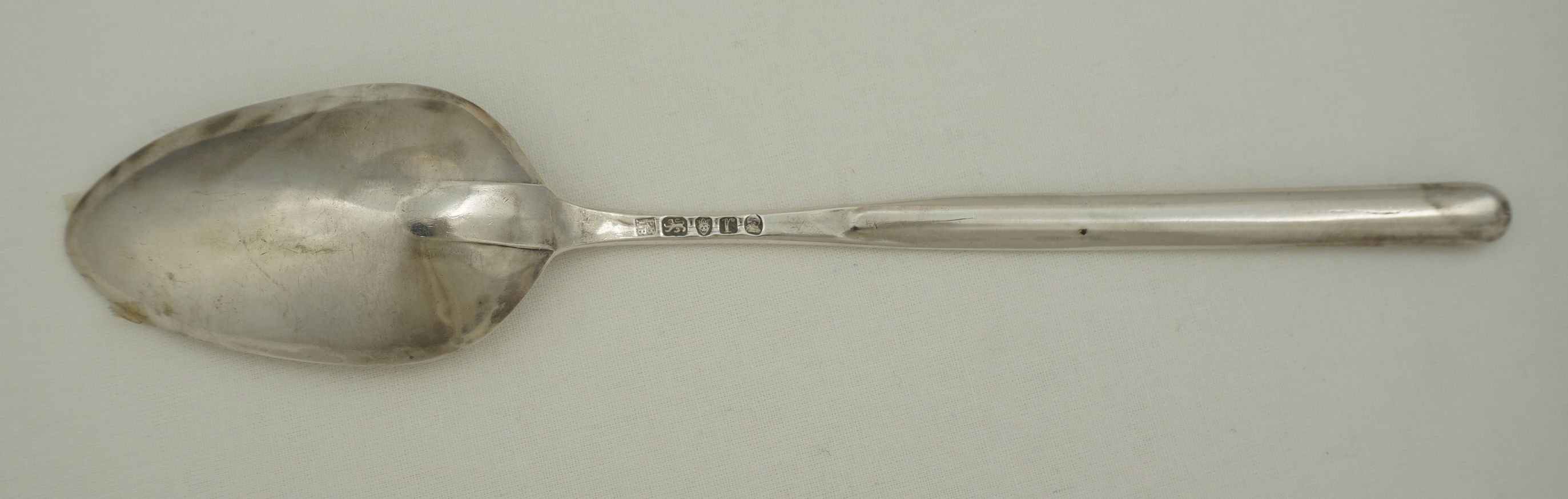 DESCRIPTION | Very good and scarce antique English Georgian solid sterling silver marrow spoon with a long drop and beautifully struck and well preserved hallmarks. This marrow spoon was sold by Christies auction house in London, part of lot 55, on 26th October 1993 and still wears that lot number under a piece of sticky tape. |