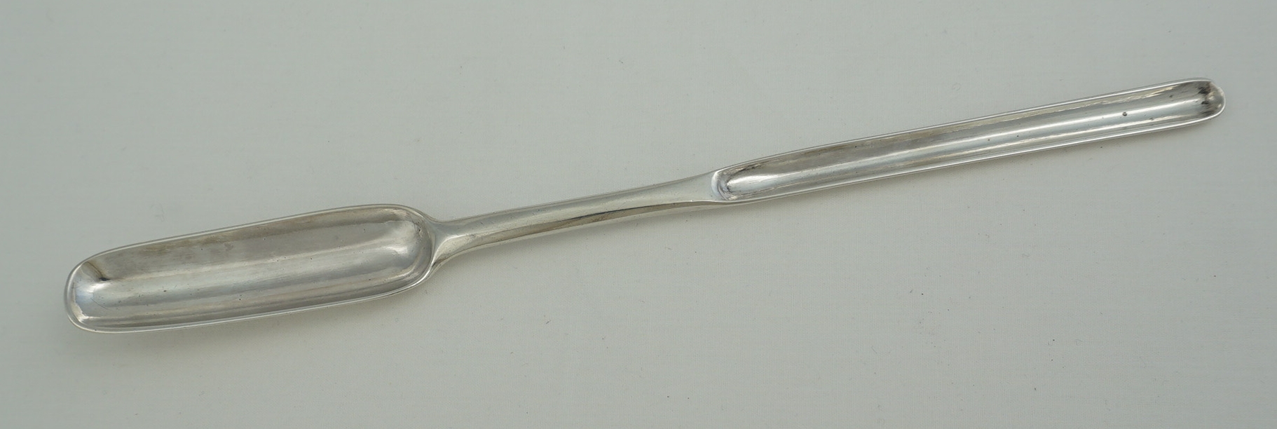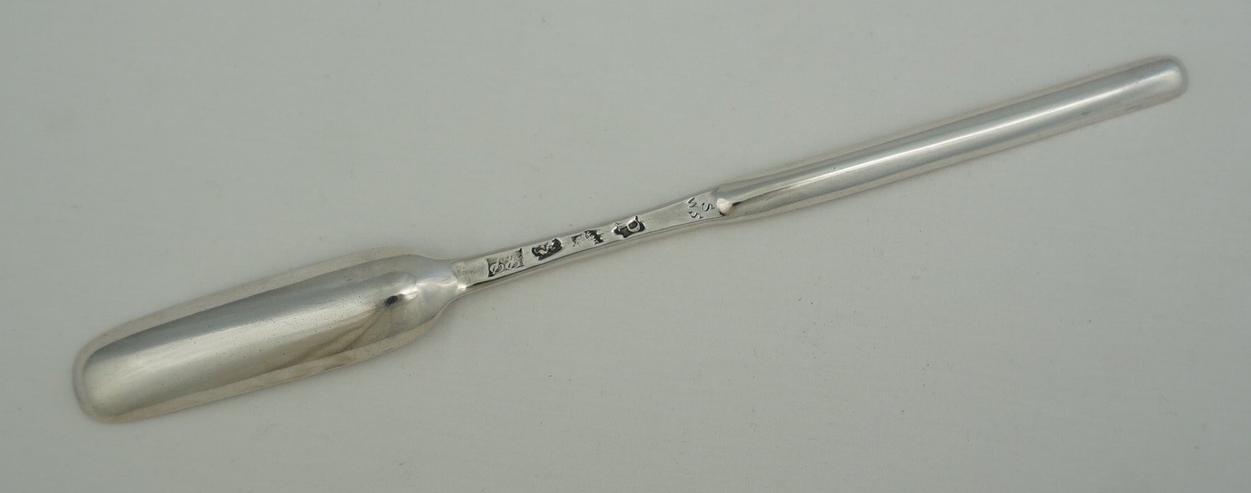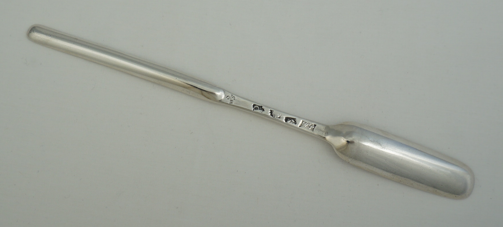 DESCRIPTION | Very good antique English Georgian solid sterling silver marrow scoop engraved 'S WS' to the lamb bowl drop and with very good hallmarks. |