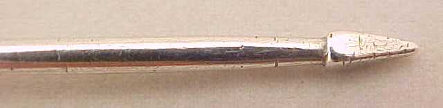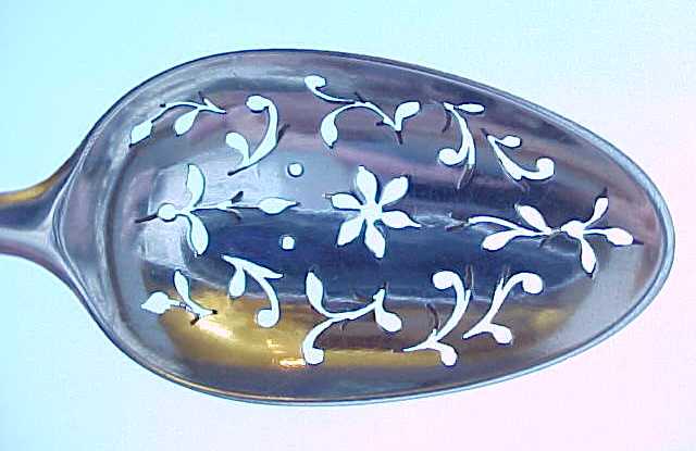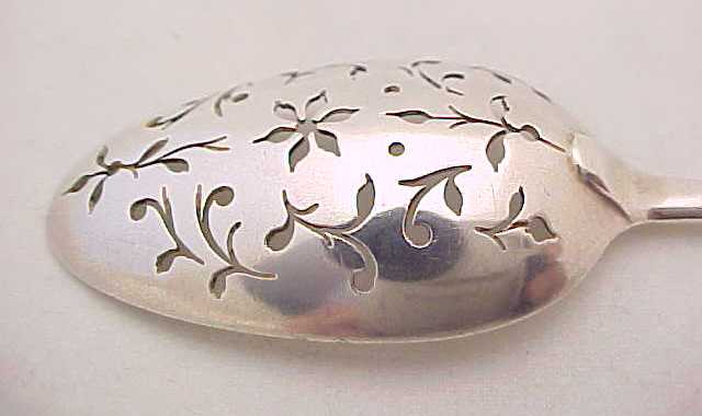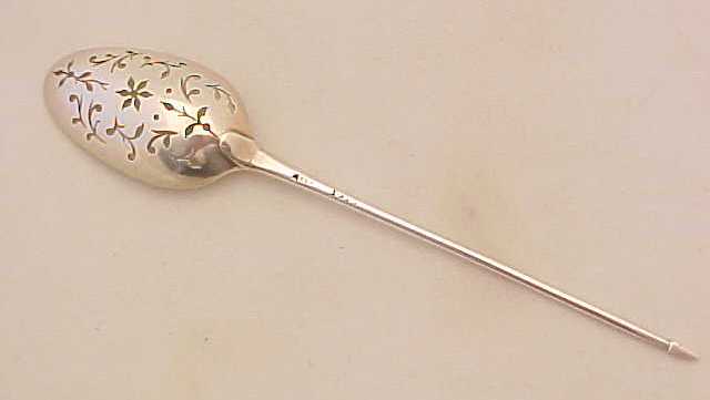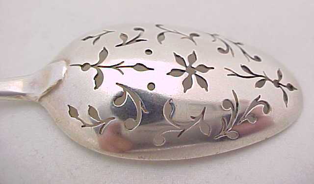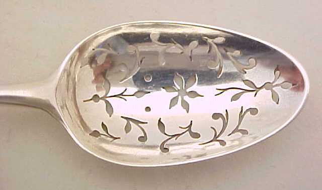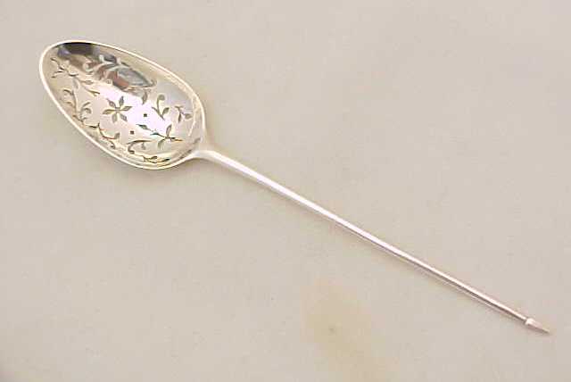 Typical mid 18th century Georgian silver mote spoon with unusual foliate and floral bowl piercings and the usual diamond point. Although foliate and floral piercings are common, this is the first time that I have seen them employed exclusively. |