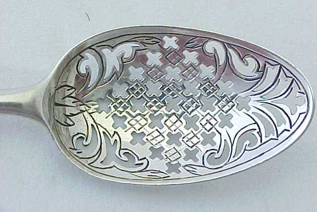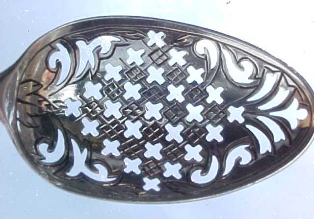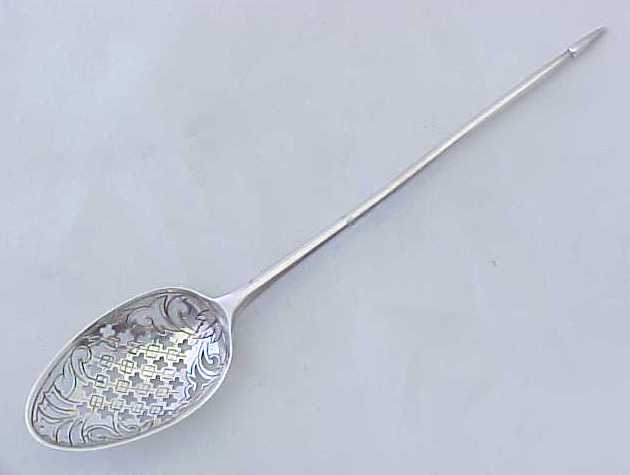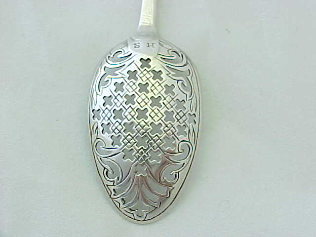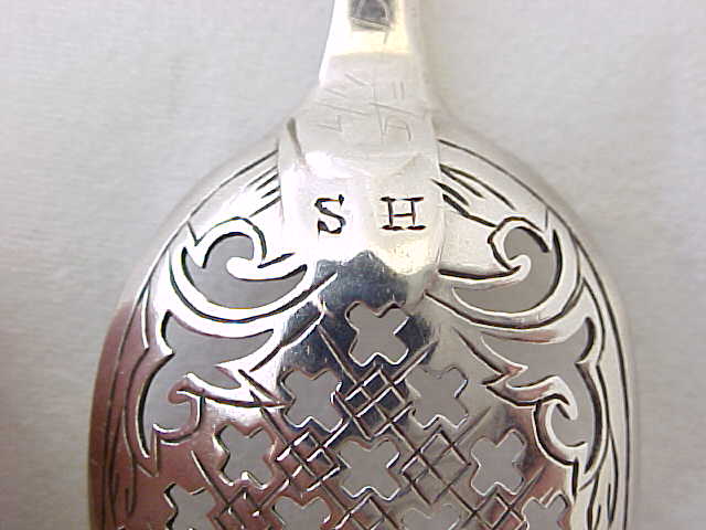 Georgian silver mote spoon with pierced and thread decoration and a facetted double drop engraved 'SH'. |
