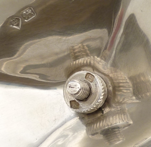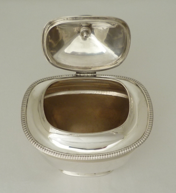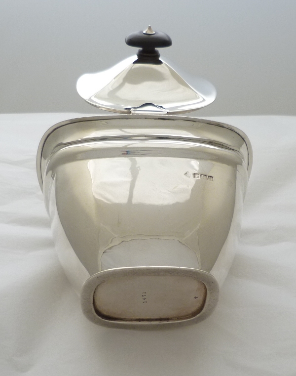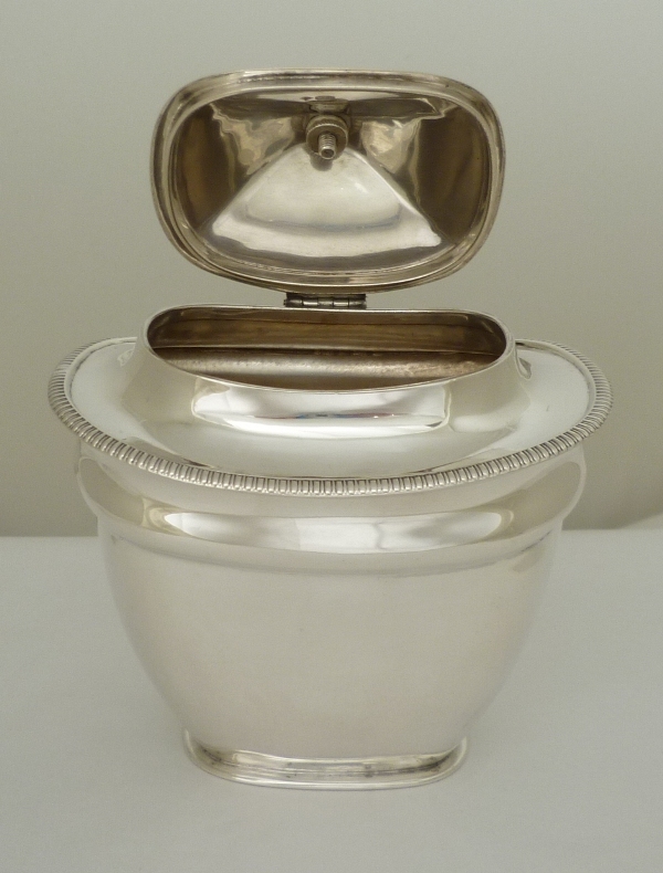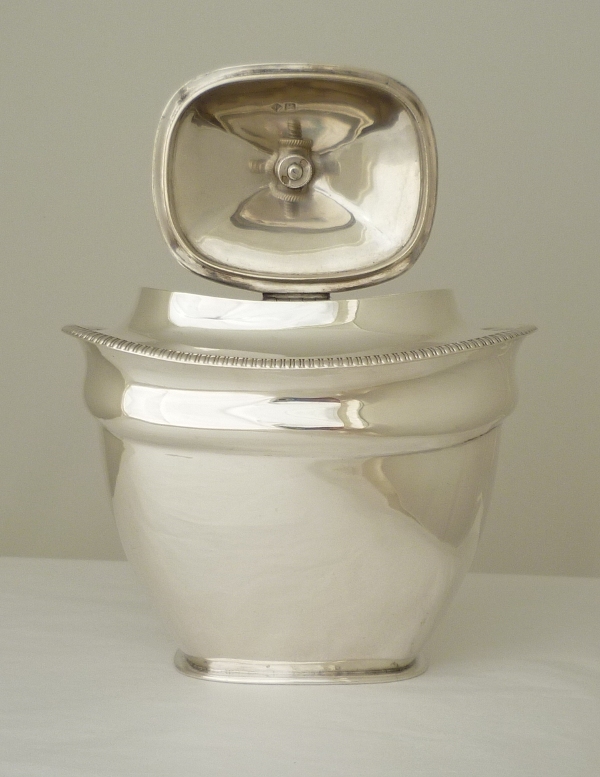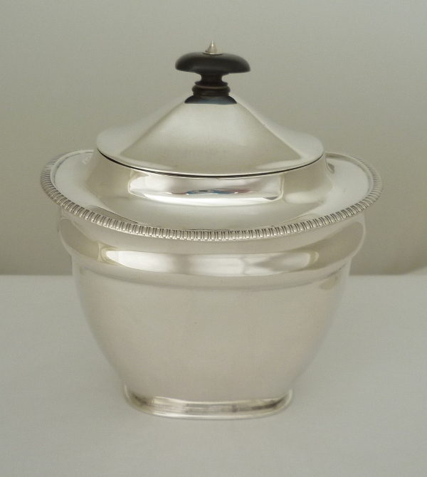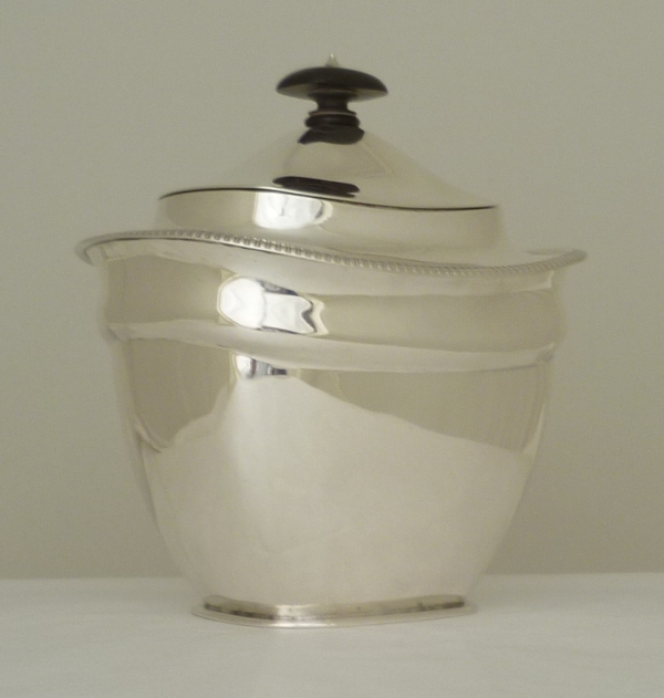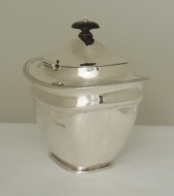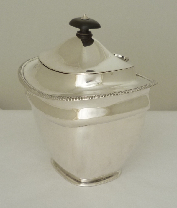 Large and suitably heavy Edwardian silver tea caddy with gadroon top rim decoration and a shaped ebony finial inset with a silver point. |